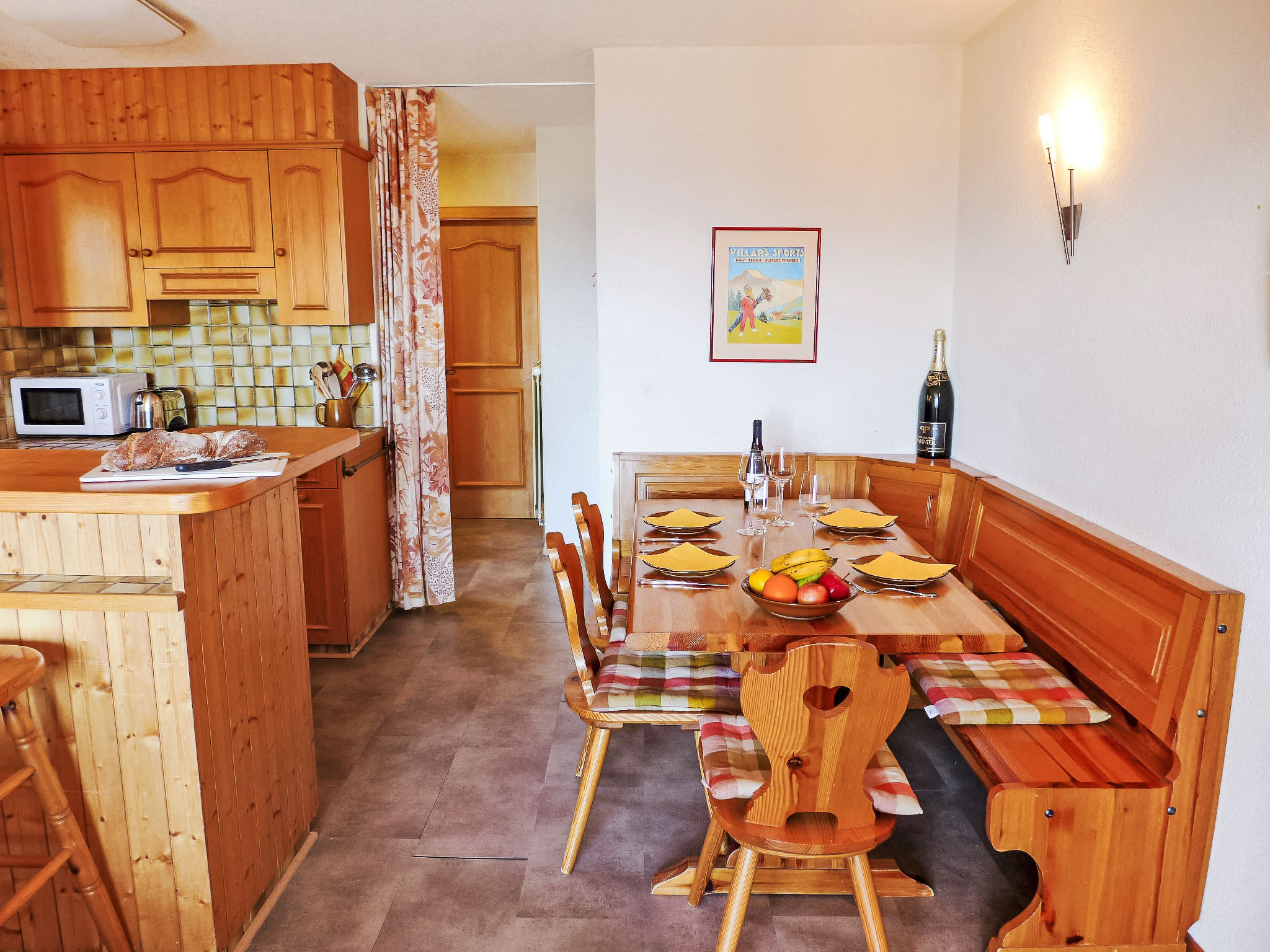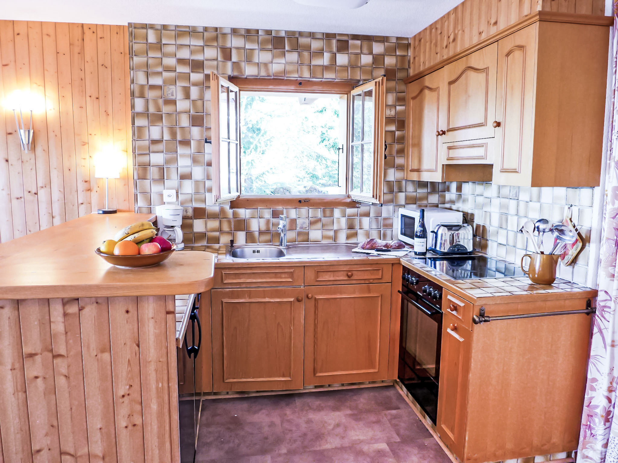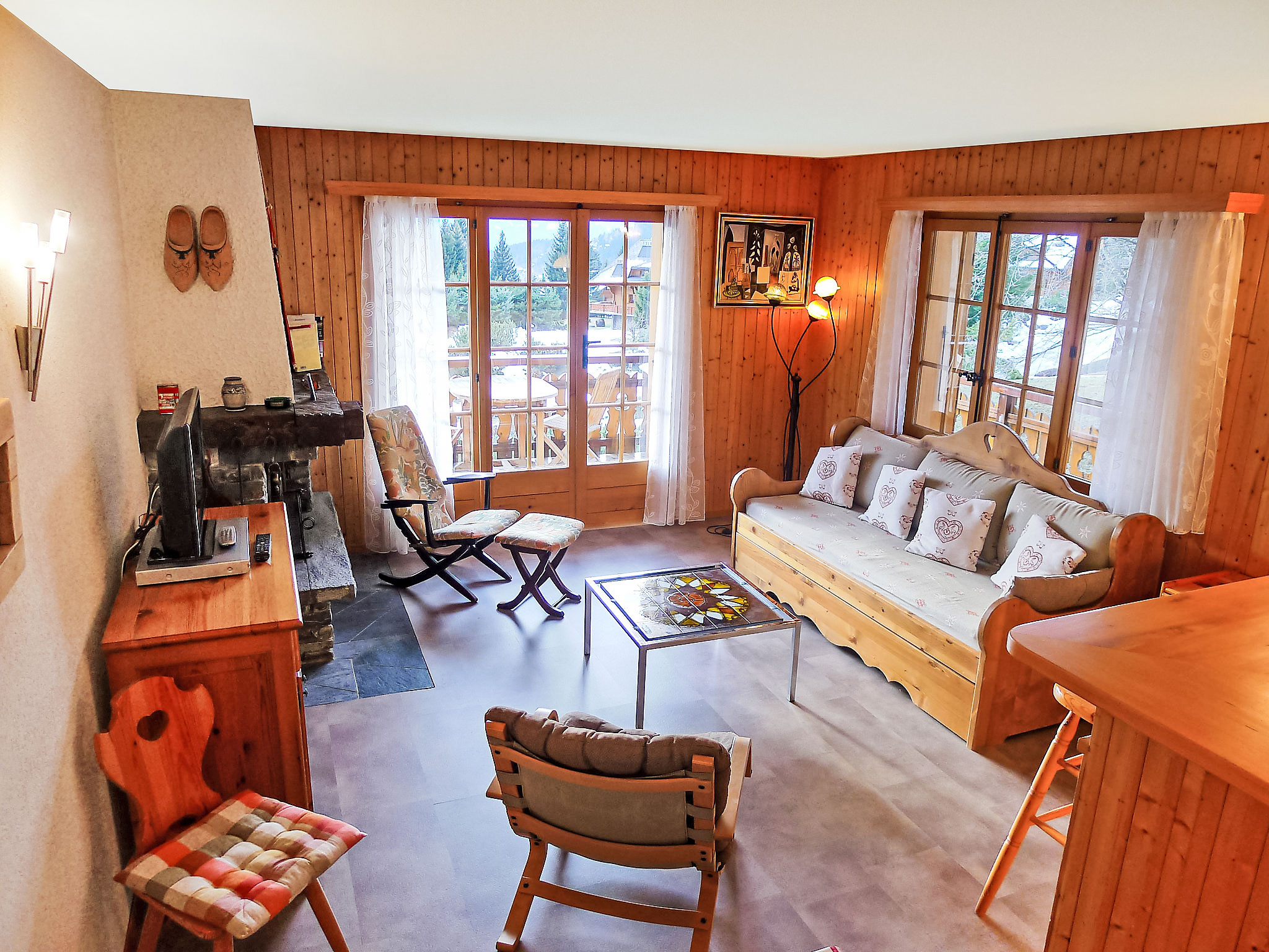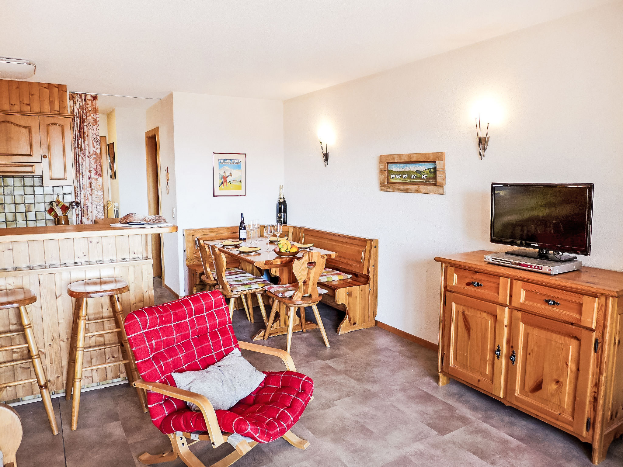 "Sapin Bleu 5", 2-room apartment 47 m2 on 1st floor, south facing position. Practical and cosy furnishings: living/dining room with panoramic window with 2 pull-out beds (2 pers. 2 x 80 cm, length 190 cm), open-hearth fireplace, dining table and TV (flat screen), radio and DVD. Exit to the balcony. 1 room with 1 french bed (160 cm, length 200 cm). Exit to the balcony. Open kitchen (oven, dishwasher, toaster, kettle, microwave, electric coffee machine, raclette grill, fondue Set (cheese)). Bath/WC. Large balcony 25 m2, south facing position and west facing position. Terrace furniture. Very beautiful panoramic view of the mountains. Facilities: hair dryer. Internet (WiFi, free). Maximum 1 pet/ dog allowed.