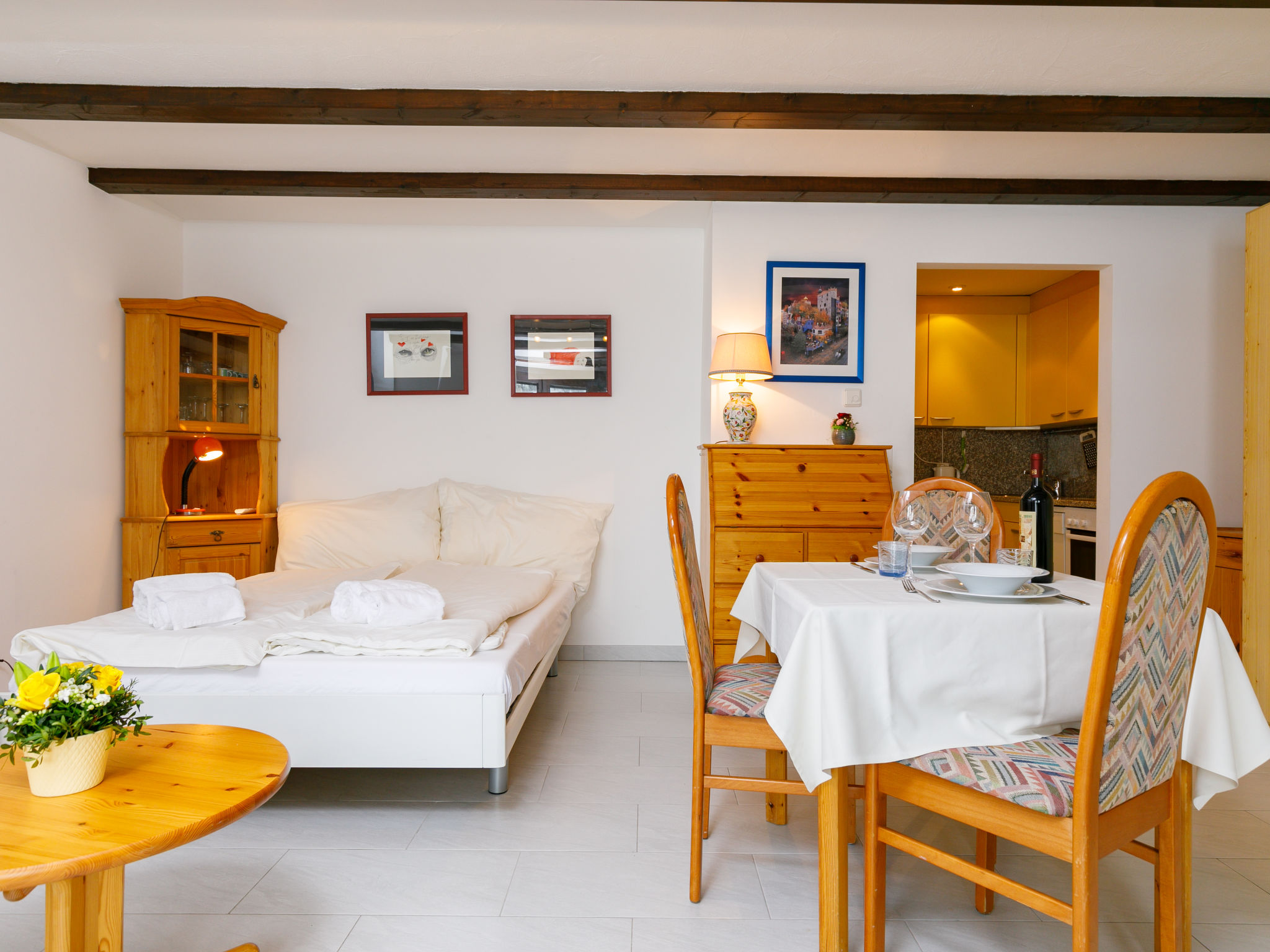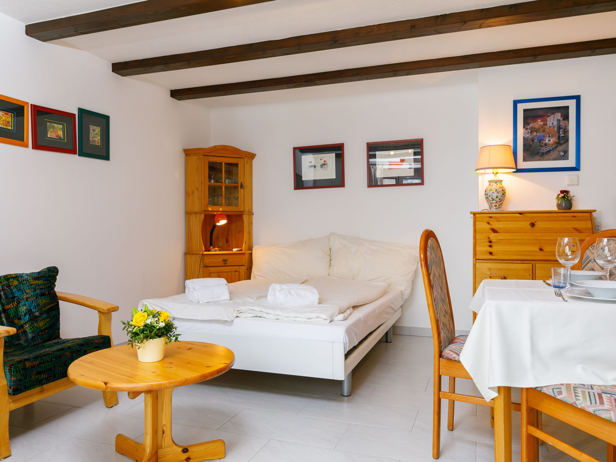 "Residenza Chesa Margun 33-5", 1-room apartment 30 m2. Partly renovated, cosy furnishings: living/sleeping room with 1 french bed (160 cm, length 190 cm), dining table, TV and satellite TV (flat screen), radio. Exit to the terrace. Kitchenette (oven, dishwasher). Bath/WC. Small balcony, south facing position. Terrace furniture. Beautiful view of the valley and the resort. Facilities: telephone. Internet (WiFi). Garage. Please note: non-smokers only.