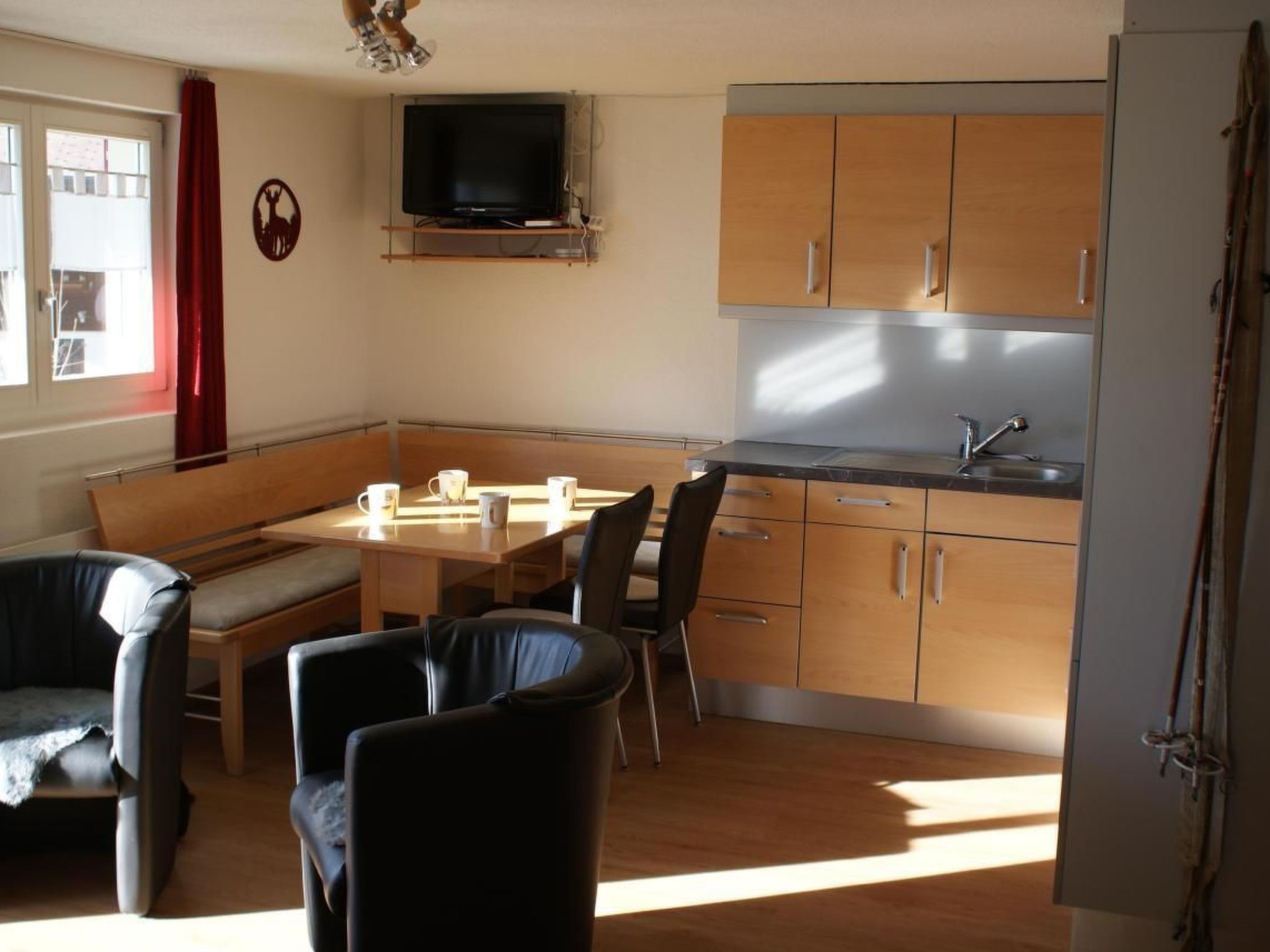 Inside, you will find modern furnishings that leave nothing to be desired. The flat has an open-plan kitchen with oven and fridge, which was completely renovated in 2006. A TV set with Swisscom TV, a stereo system and a wireless LAN broadband Internet connection provide entertainment. There is also a cosy room with a double bed and another room with a practical bunk bed, including a shower room with WC.