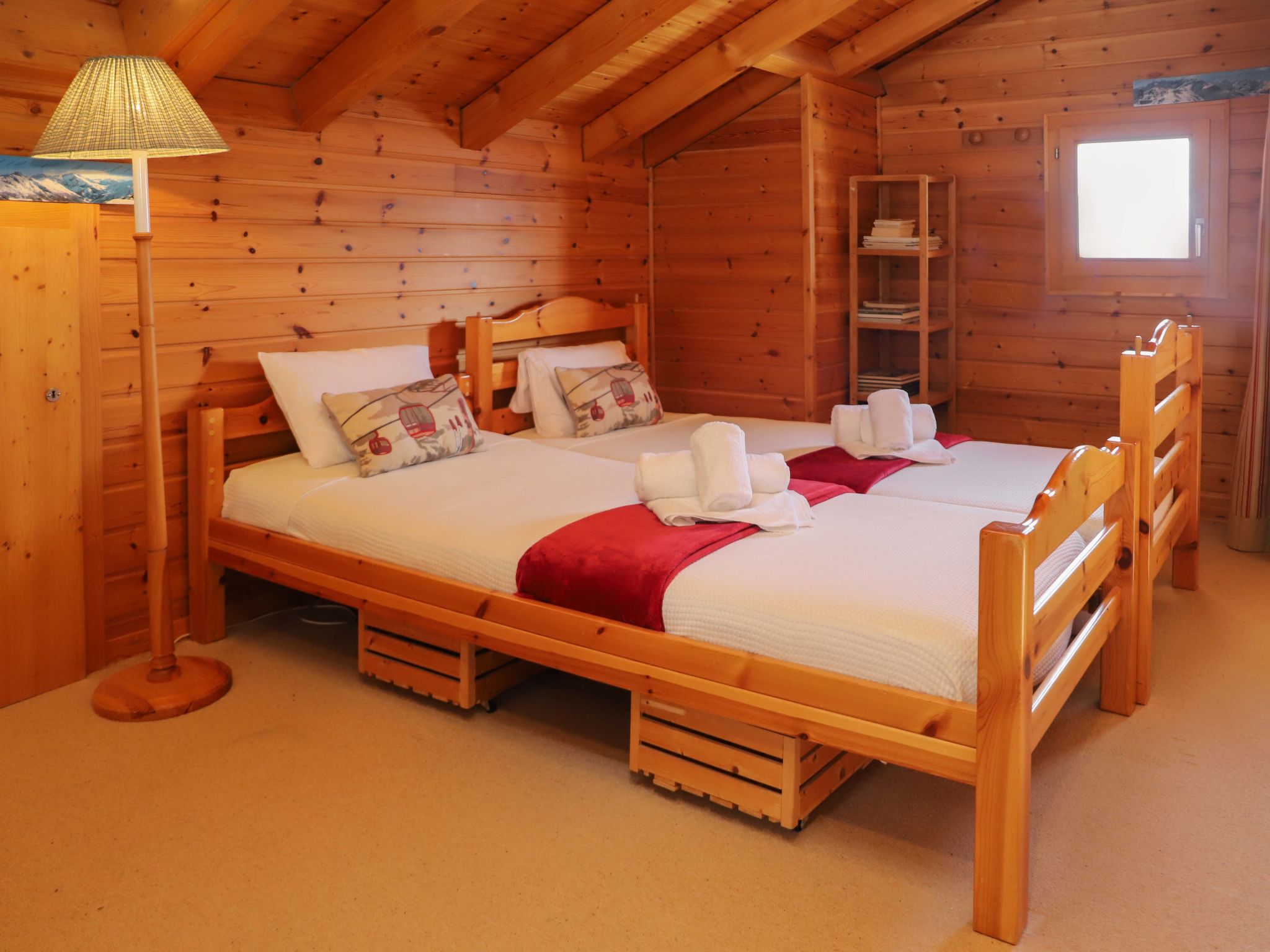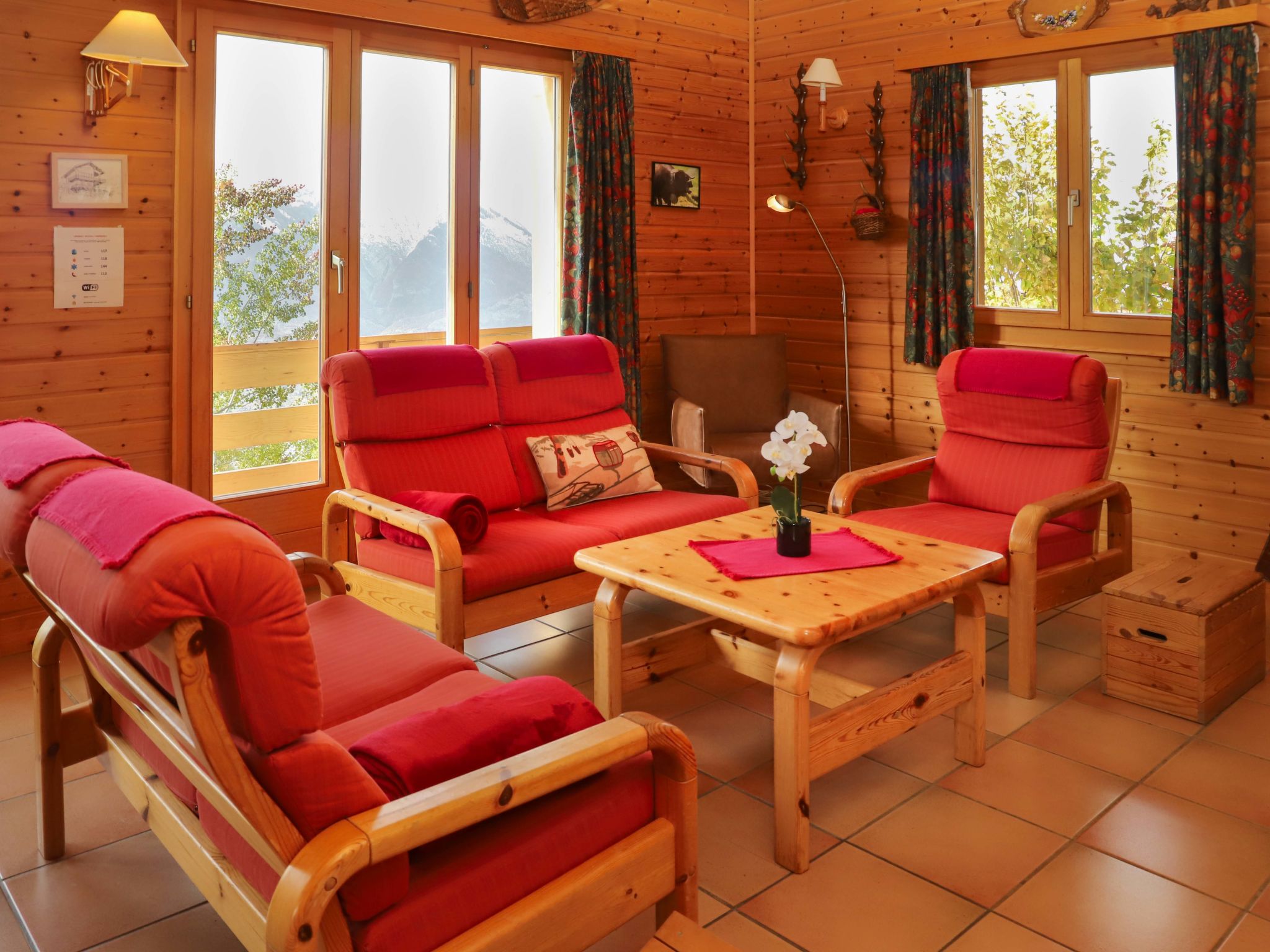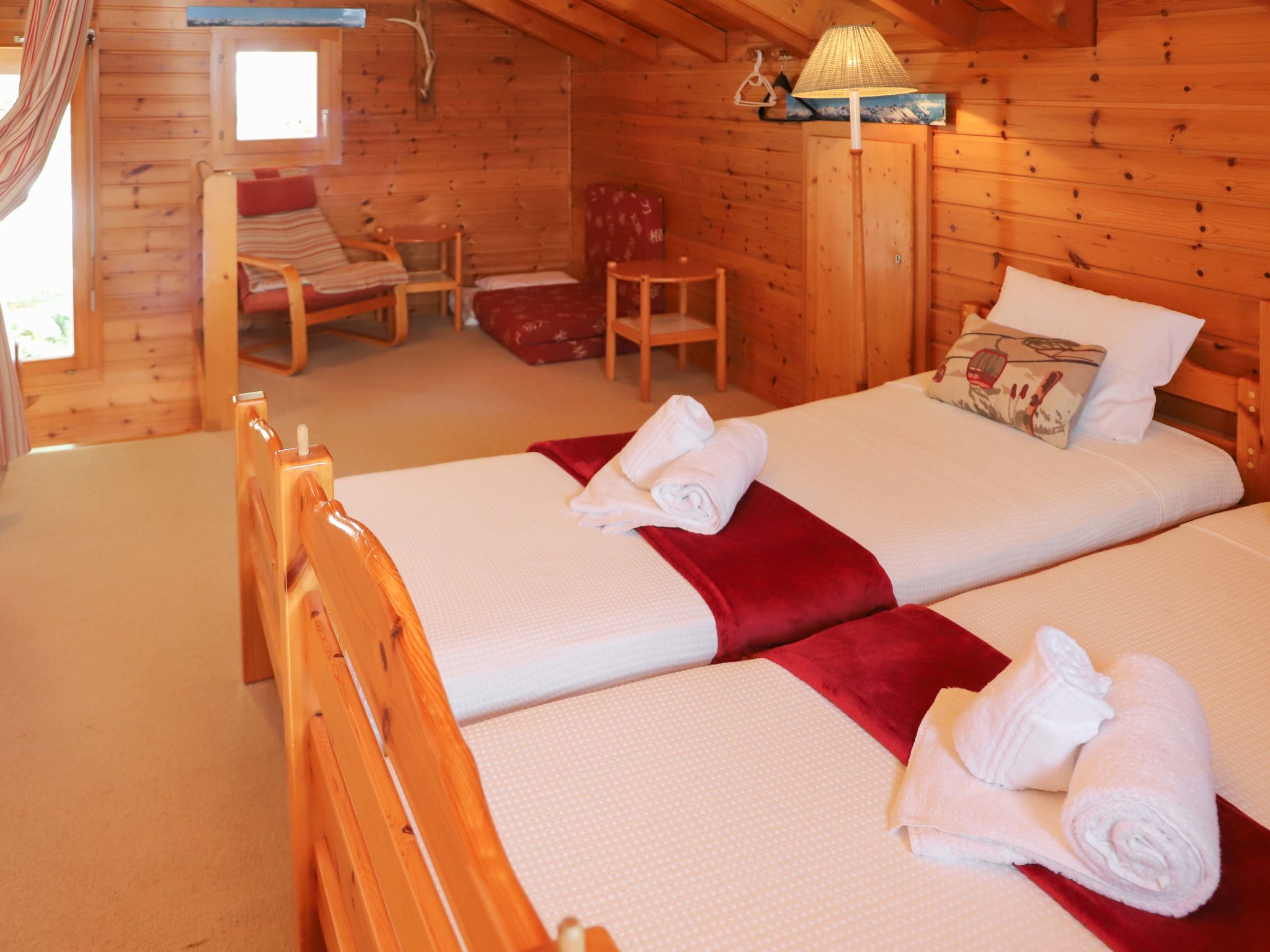 4-room chalet 89 m2 on 2 levels. Living/dining room with open-hearth fireplace (only for decoration), cable TV, hi-fi system and DVD. Exit to the balcony, to the terrace. Open gallery with sloping ceilings with 2 beds (80 cm, length 190 cm). Kitchen (oven, dishwasher, 4 ceramic glass hob hotplates, electric coffee machine, raclette grill, fondue Set (chinoise, cheese)). Shower, sep. WC. Electric heating. On the lower ground floor: 1 room with 1 x 2 bunk beds (90 cm, length 190 cm). Exit to the balcony. 1 room with 2 beds (90 cm, length 190 cm). Exit to the balcony. 1 room with 2 beds (80 cm, length 190 cm). Exit to the balcony. Bath/WC. Balcony, north-west facing position, terrace, north-west facing position, patio. Very beautiful panoramic view of the mountains. Facilities: washing machine. Internet (WiFi, free). Garage (1 car), height 200 cm, width 220 cm. Please note: non-smokers only. Instead of an enclosed bedroom, some sleeping areas are located in an open-plan area (gallery, alcove, etc.).