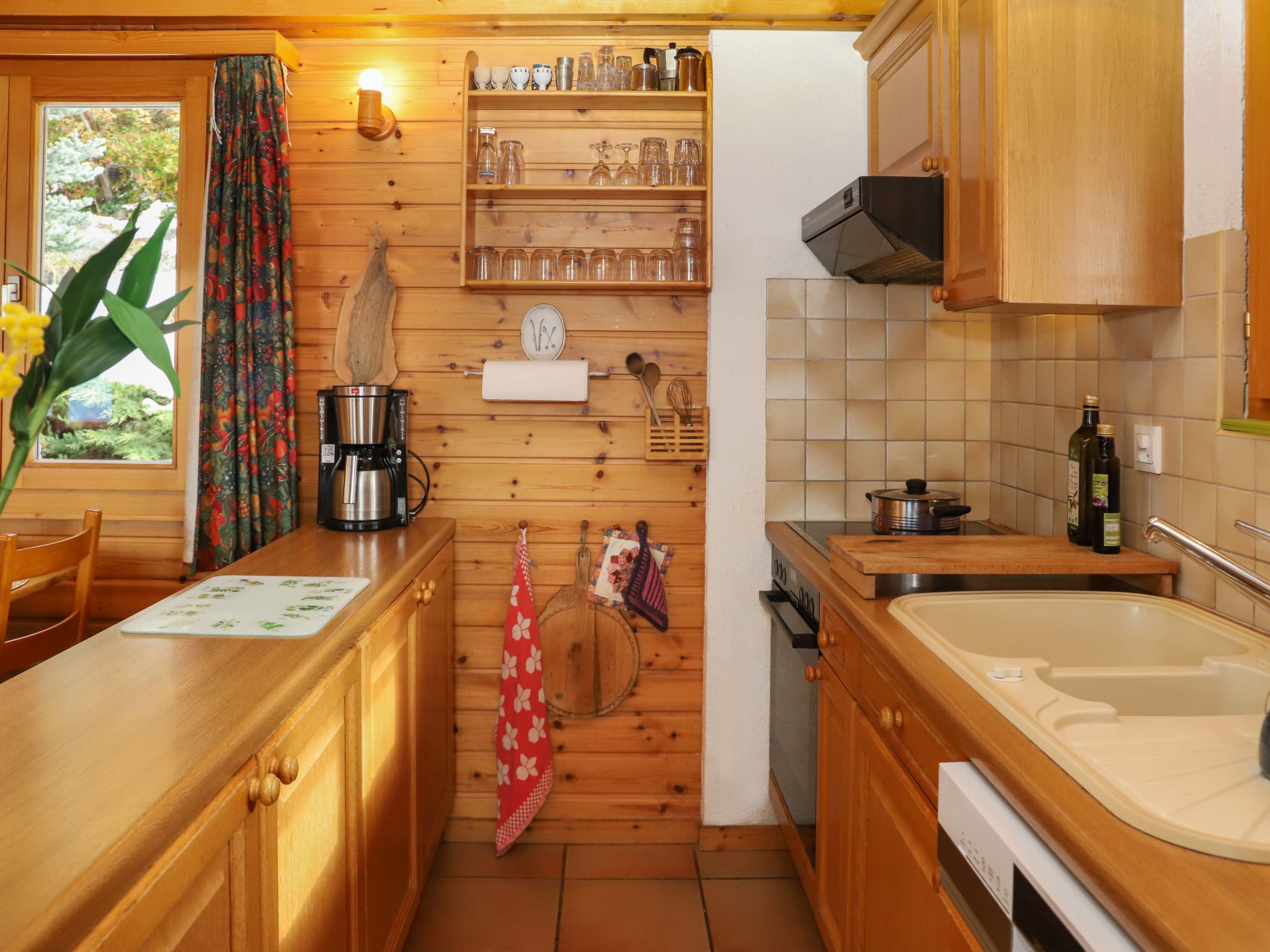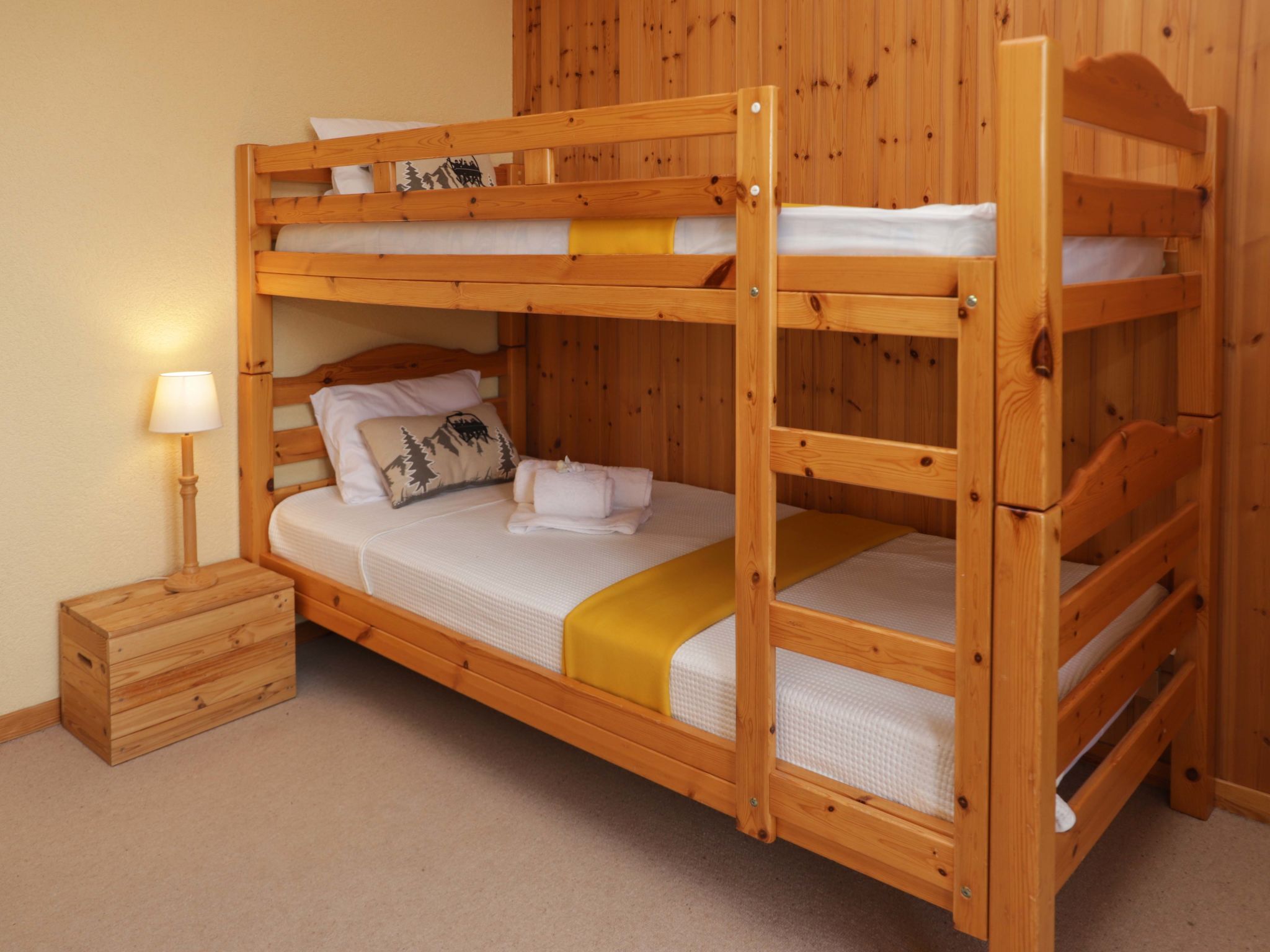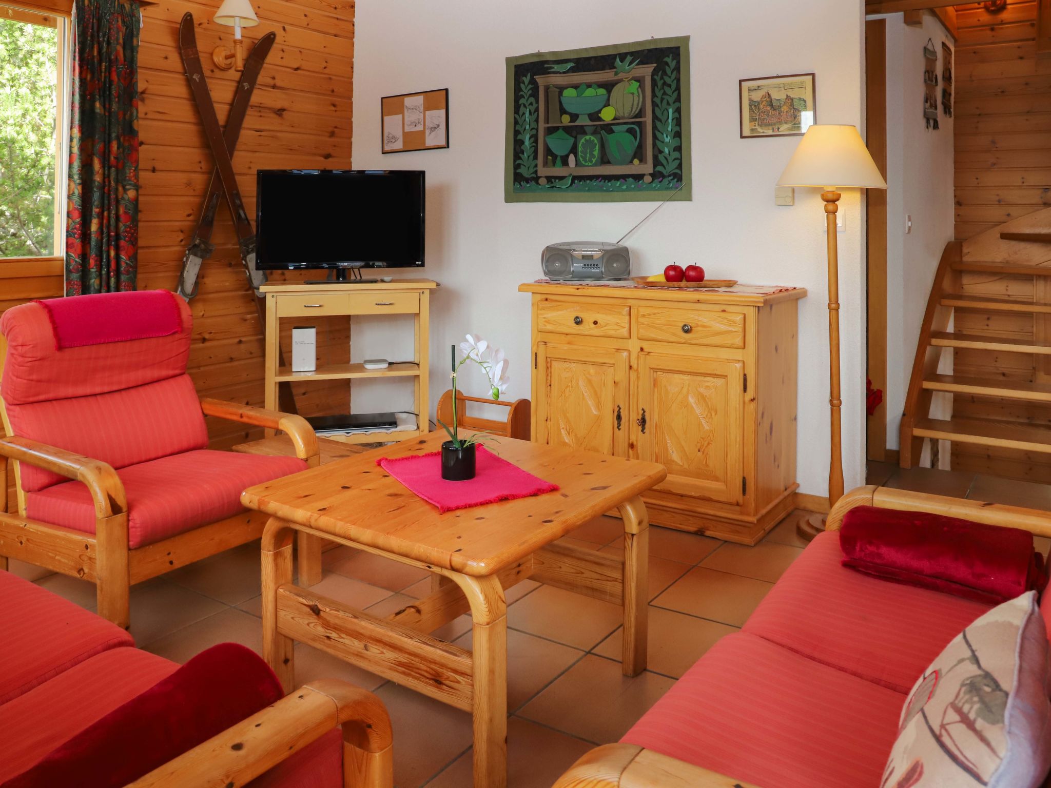 4-room chalet 89 m2 on 2 levels. Living/dining room with open-hearth fireplace (only for decoration), cable TV, hi-fi system and DVD. Exit to the balcony, to the terrace. Open gallery with sloping ceilings with 2 beds (80 cm, length 190 cm). Kitchen (oven, dishwasher, 4 ceramic glass hob hotplates, electric coffee machine, raclette grill, fondue Set (chinoise, cheese)). Shower, sep. WC. Electric heating. On the lower ground floor: 1 room with 1 x 2 bunk beds (90 cm, length 190 cm). Exit to the balcony. 1 room with 2 beds (90 cm, length 190 cm). Exit to the balcony. 1 room with 2 beds (80 cm, length 190 cm). Exit to the balcony. Bath/WC. Balcony, north-west facing position, terrace, north-west facing position, patio. Very beautiful panoramic view of the mountains. Facilities: washing machine. Internet (WiFi, free). Garage (1 car), height 200 cm, width 220 cm. Please note: non-smokers only. Instead of an enclosed bedroom, some sleeping areas are located in an open-plan area (gallery, alcove, etc.).