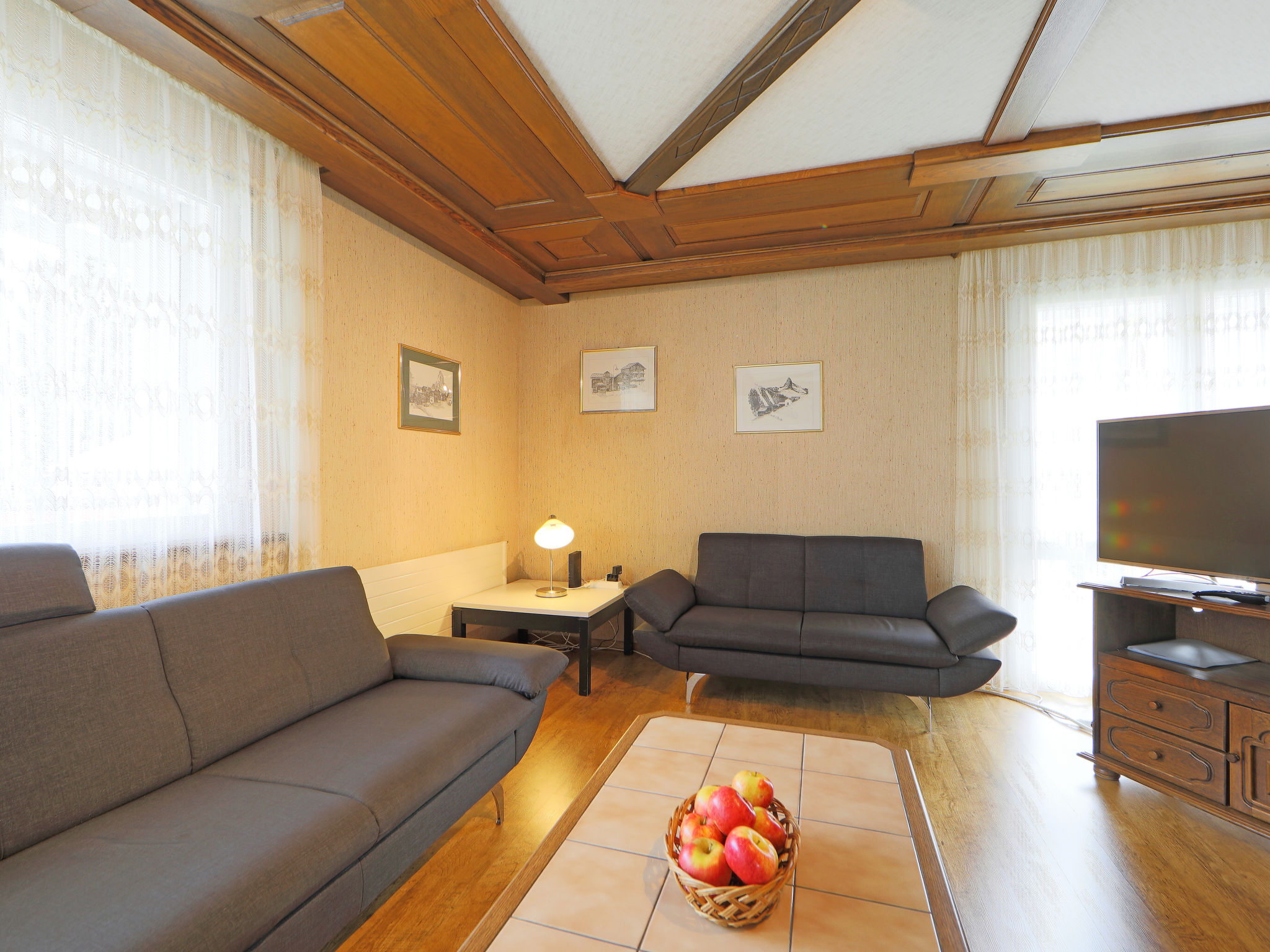 3-room apartment 80 m2 on 2nd floor. Simple and comfortable furnishings: large living/dining room with dining table and TV. Exit to the balcony. 2 rooms, each room with 2 beds (90 cm, length 200 cm). Kitchen (oven, dishwasher, 4 ceramic glass hob hotplates, toaster, kettle, freezer, electric coffee machine, fondue Set (cheese)). Shower/WC, hydro massage shower. Balcony, south facing position and west facing position. Balcony furniture. Beautiful view of the Matterhorn. Facilities: hair dryer. Internet (WiFi, free). Please note: non-smokers only.