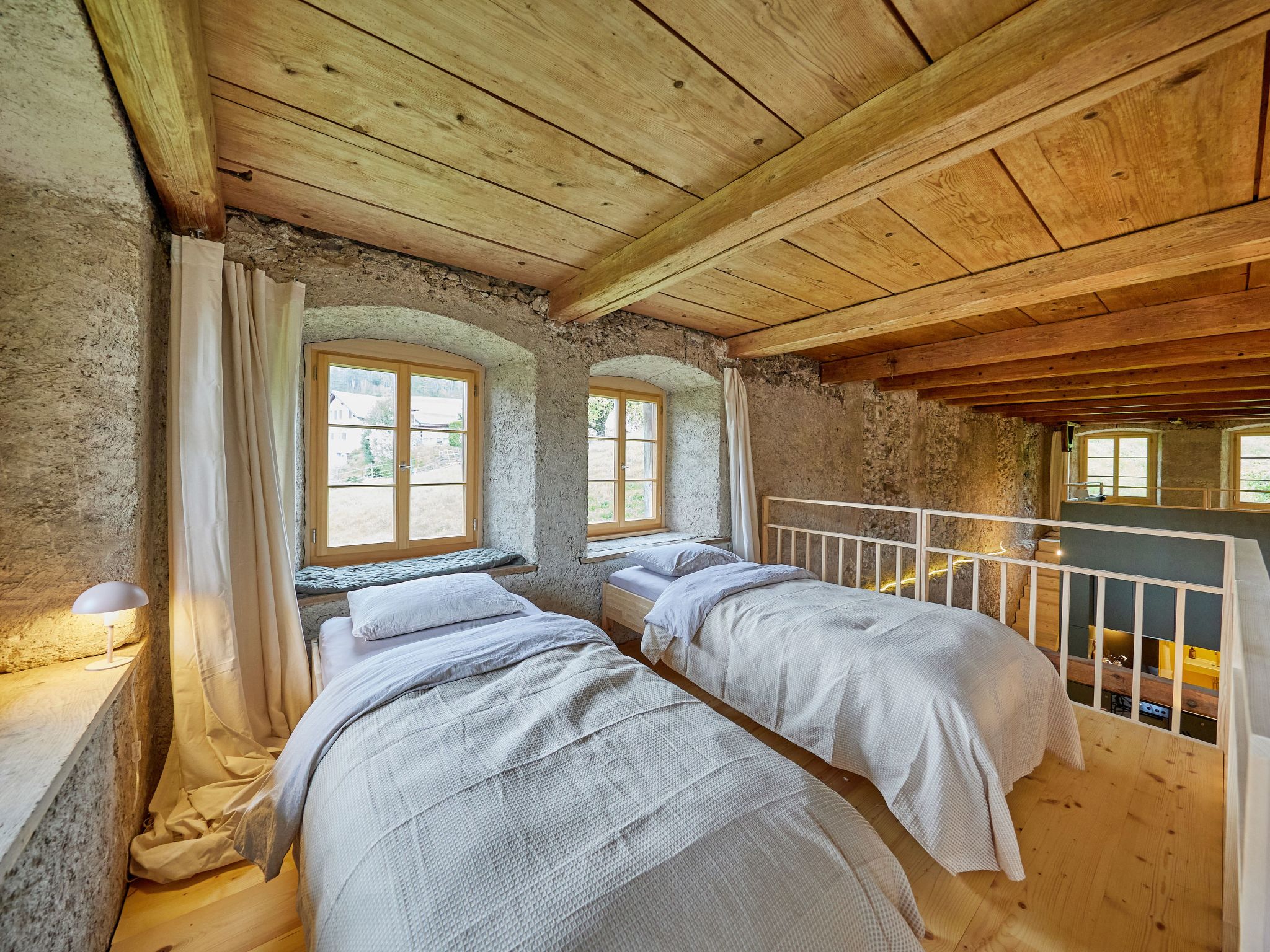 The former mill room has a large room open over two floors. On the ground floor, there is a spacious seating area at the front, a dining table and cooking island in the centre and a bathroom and walk-in wardrobe at the back. On the first floor there are two open galleries, one of which is furnished as a bedroom, the second can be used either as a bedroom (e.g. for the children) or as an office and is equipped accordingly.