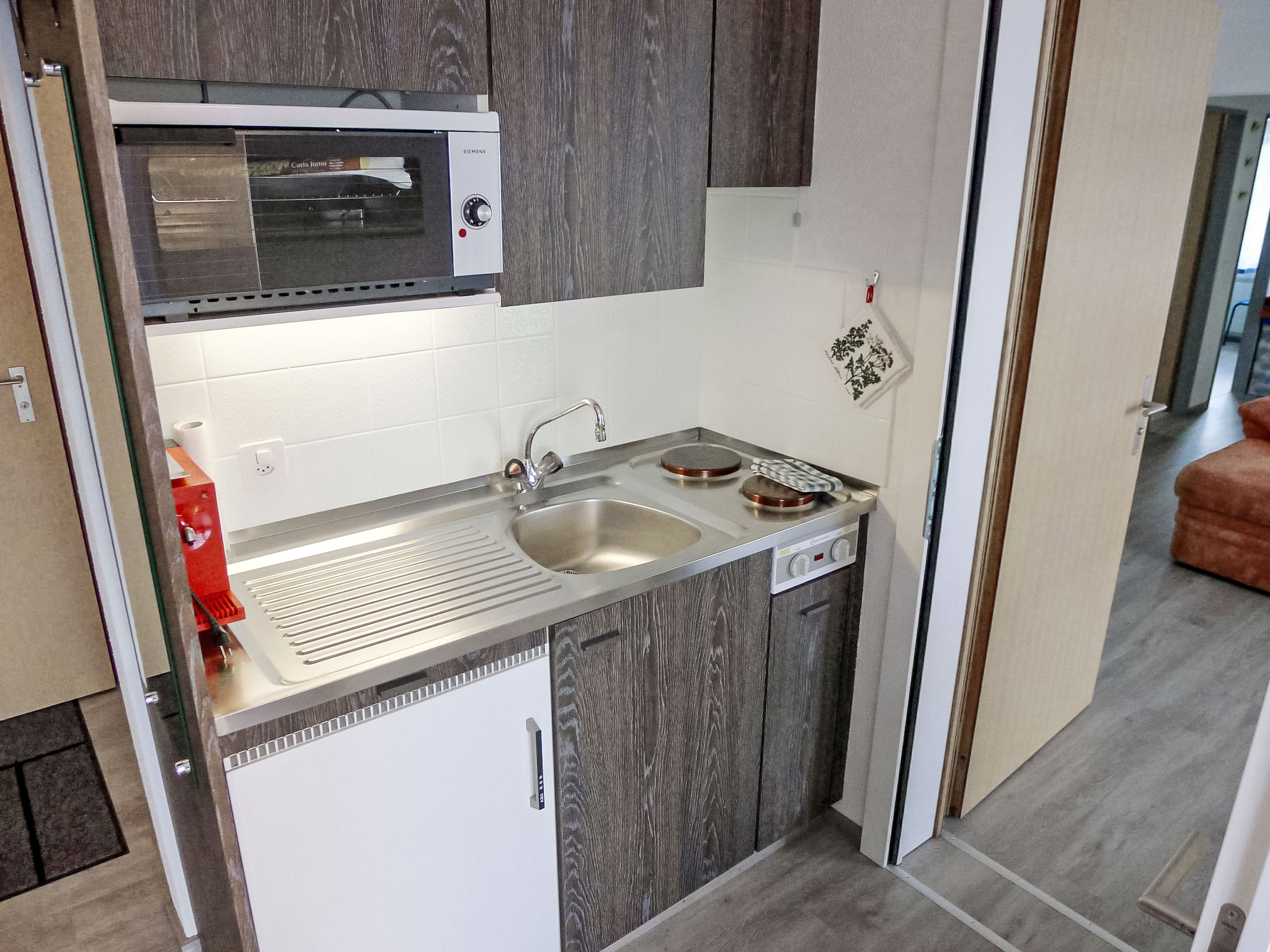 "Annex", 1-room studio 22 m2, on the ground floor. Practical and cosy furnishings: living/dining room with 2 fold-away beds and cable TV (flat screen). Exit to the terrace. Kitchenette (2 hot plates, mini-oven, electric coffee machine). Shower/WC. Large terrace. Terrace furniture. Partial view of the lake, the countryside and the resort. Facilities: baby cot. Internet (WiFi, free). Parking (1 car) at the house. Please note: non-smokers only. Door-to-door with Apartment Ramabrice CH6376.400.4.