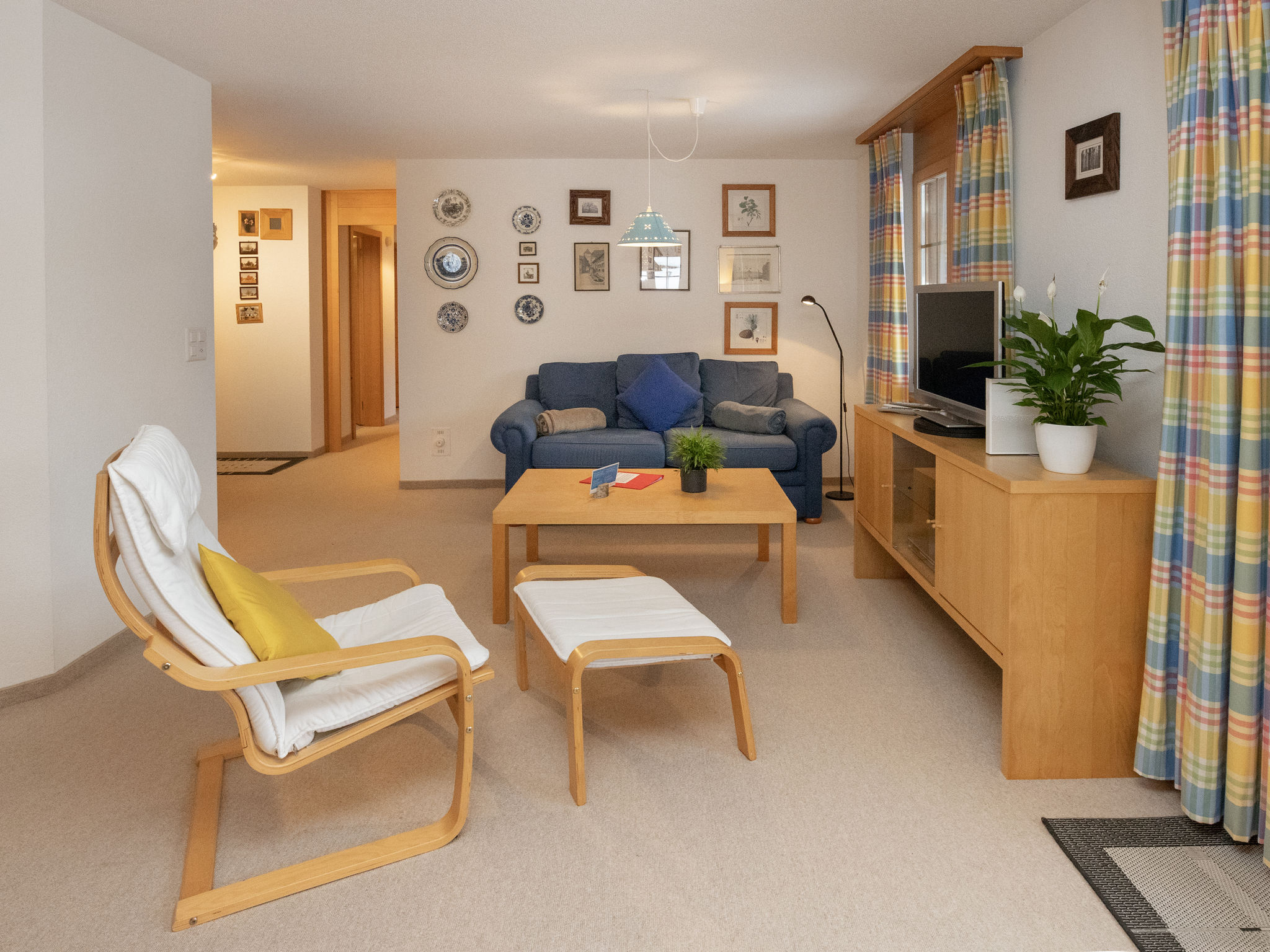 3-room apartment 91 m2, on the ground floor, south facing position. Spacious and bright, very tasteful and cosy furnishings: open living/dining room with panoramic window with dining nook, cable TV and flat screen. Exit to the terrace, south facing position. 1 large room with 1 double bed (2 x 80 cm, length 200 cm). Exit to the terrace. 1 large room with 2 beds (90 cm, length 200 cm). Exit to the terrace. Large, open kitchen (oven, dishwasher, 4 ceramic glass hob hotplates, toaster, kettle, microwave, electric coffee machine, Capsules for coffee machine (Nespresso) extra, fondue Set (cheese)). Bath/WC, shower/WC. Underfloor heating. Carpet. Large terrace, south facing position. Terrace furniture. Marvellous panoramic view of the mountains and the countryside. Facilities: iron, hair dryer. Internet (WiFi, free). Parking space n 6, height 220 cm. Please note: non-smokers only. Smoke alarm, fire extinguisher.