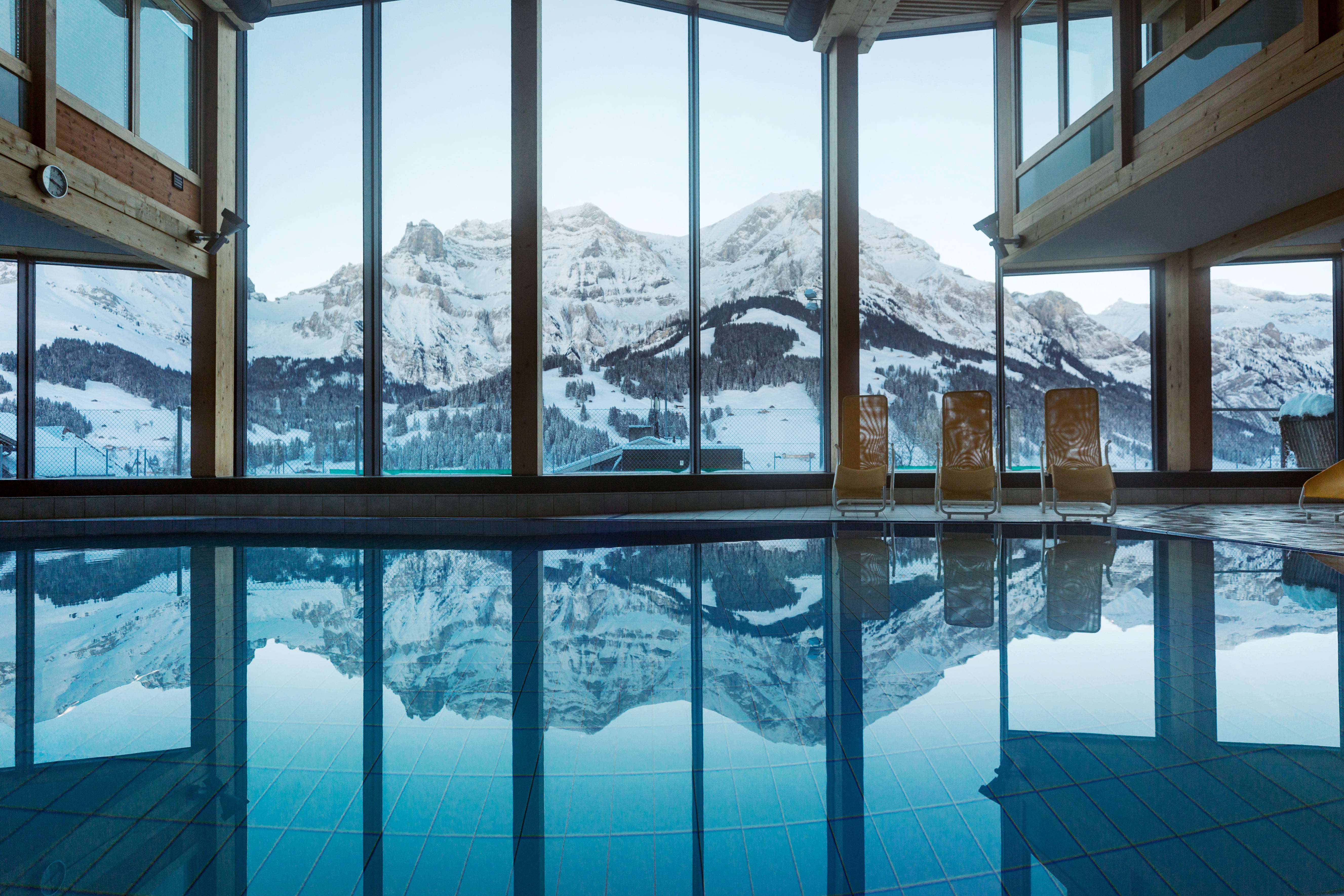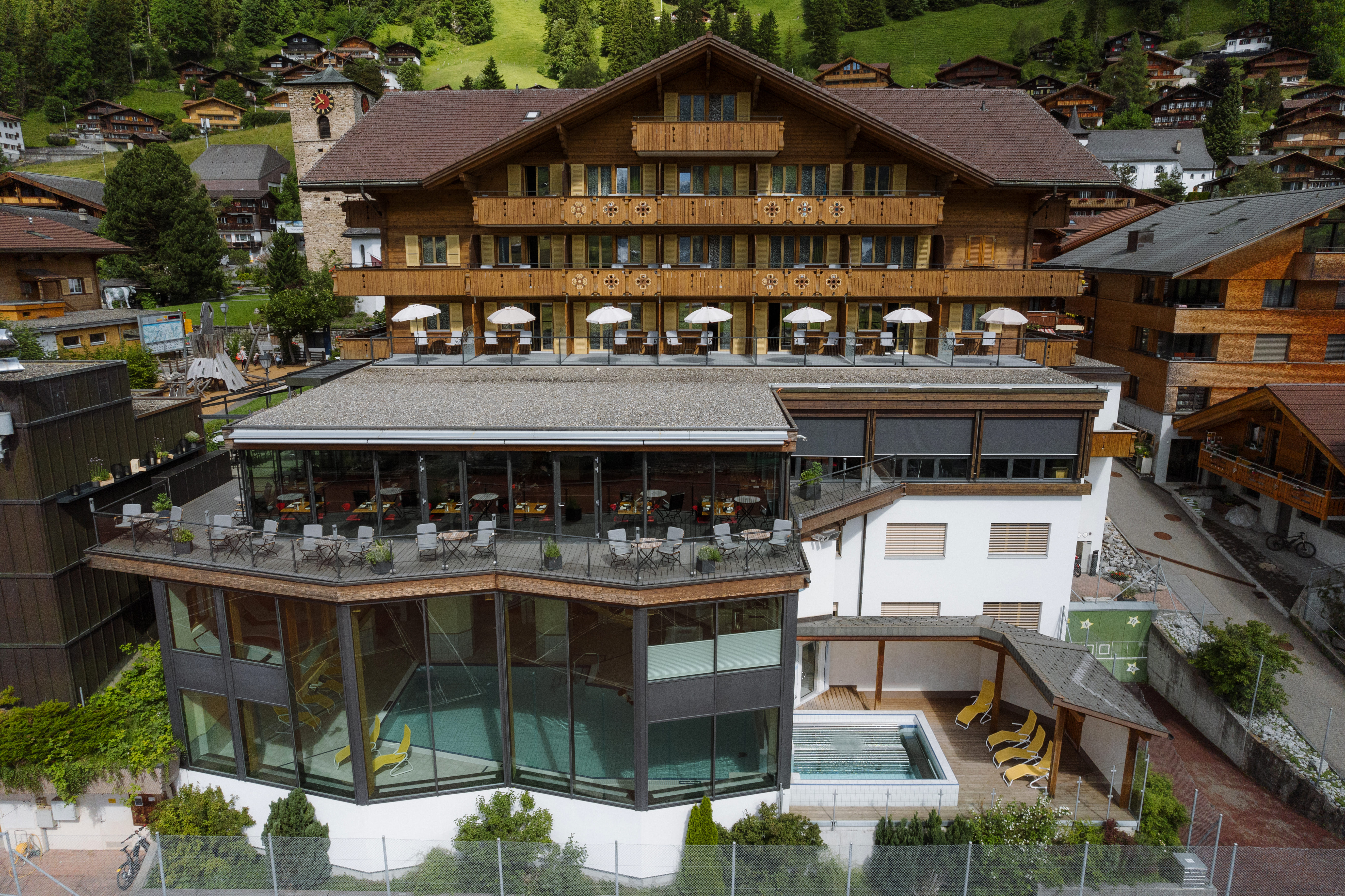 Our “typically Swiss” holiday hotel is situated in the very heart of Adelboden and just a few minutes from the mountain transport network. In our comfortable chalet hotel, you will find a wide range of attractions to make your stay with us even more enjoyable: a heated indoor/outdoor pool (32°C / 90°F), thermals, massage, a games room with pool table, table tennis, table football, darts and a giant ball pool. There are 43 well-appointed rooms furnished in Swiss stone pinewood. The reception area is exceptionally welcoming with its fireplace, and offers WLAN and an Internet corner. Ski storage room and shoe drying facility. Choice of three restaurants and popular sunshine terrace. And in summer the mountain lift pass is included in our attractive room rates.Come and enjoy true hospitality, straight from the heart.