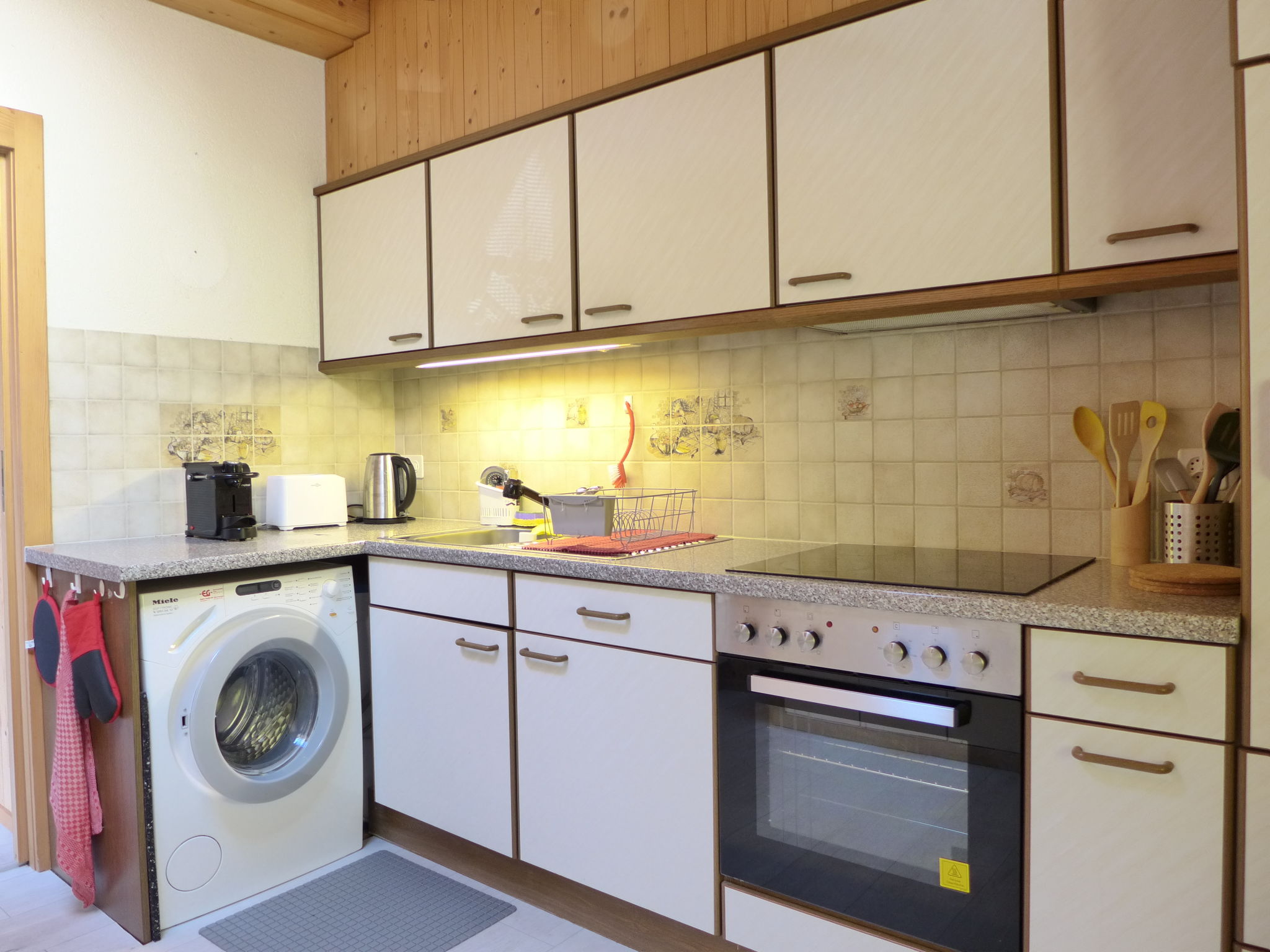 "Chalet Vamika", 2-room apartment 52 m2, on the top floor. Object suitable for 2 adults + 2 children. Bright, partly renovated in 2023, practical and cosy furnishings: open living/sleeping room with 1 double sofabed (140 cm, length 200 cm), Scandinavian wood stove, dining table and digital TV. Exit to the balcony. 1 double bedroom with 1 double bed (180 cm, length 200 cm). Small, interconnecting room with sloping ceilings, Low door height 150 cm with 2 beds (90 cm, length 200 cm). Open kitchen in the entrance (4 hot plates, oven, toaster, kettle, electric coffee machine, Capsules for coffee machine (Nespresso) extra, raclette grill, fondue Set (cheese)). Shower/WC. Electric heating, wood heating. Heating not available in all rooms. Balcony, east facing position and south facing position. Balcony furniture. Marvellous view of the lake and the mountains. Facilities: washing machine, baby cot for up to 2 year olds (extra), hair dryer, logs (free). Internet (WiFi, free). Parking (1 car). Please note: non-smokers only. Smoke alarm, fire extinguisher.