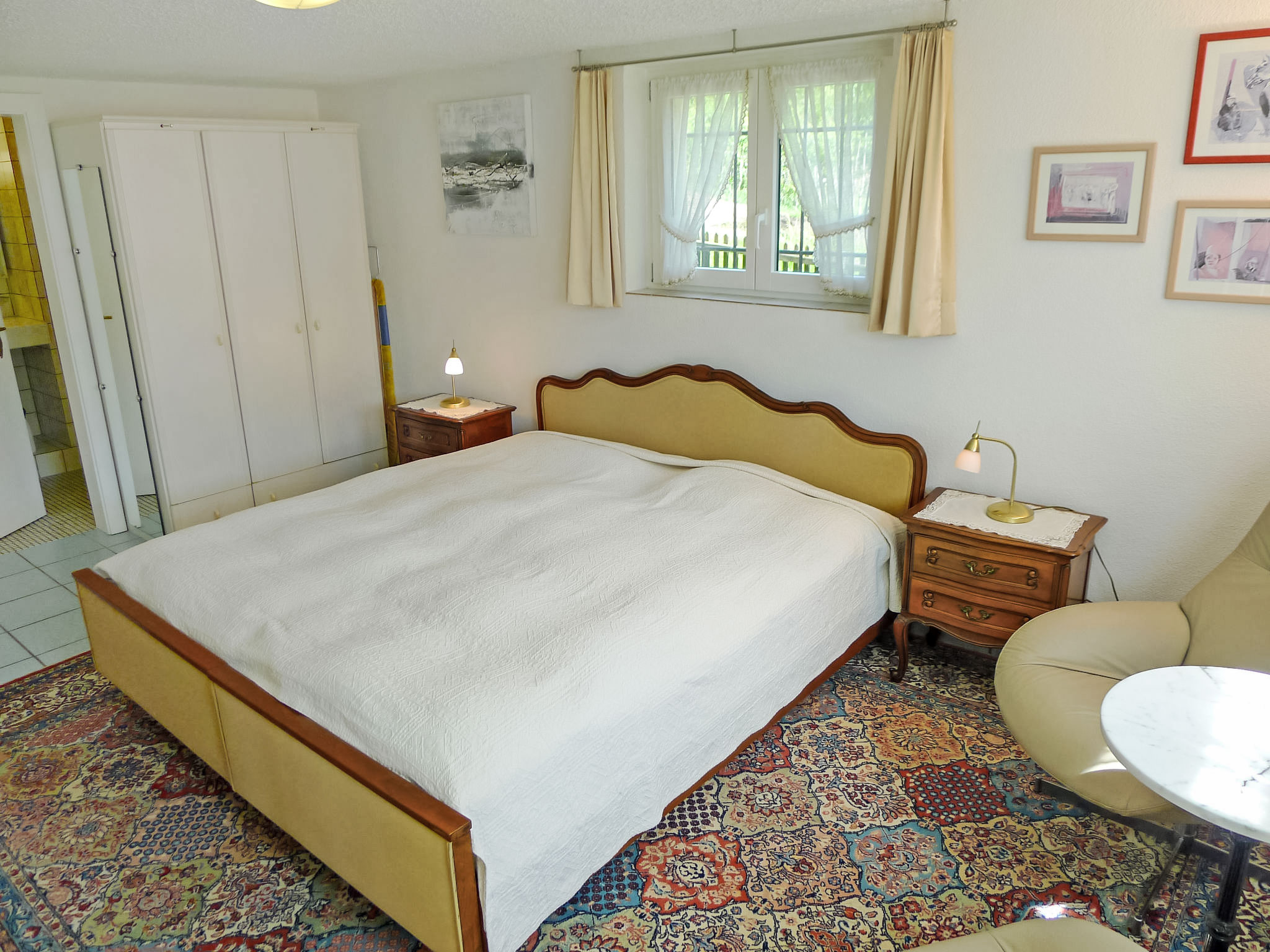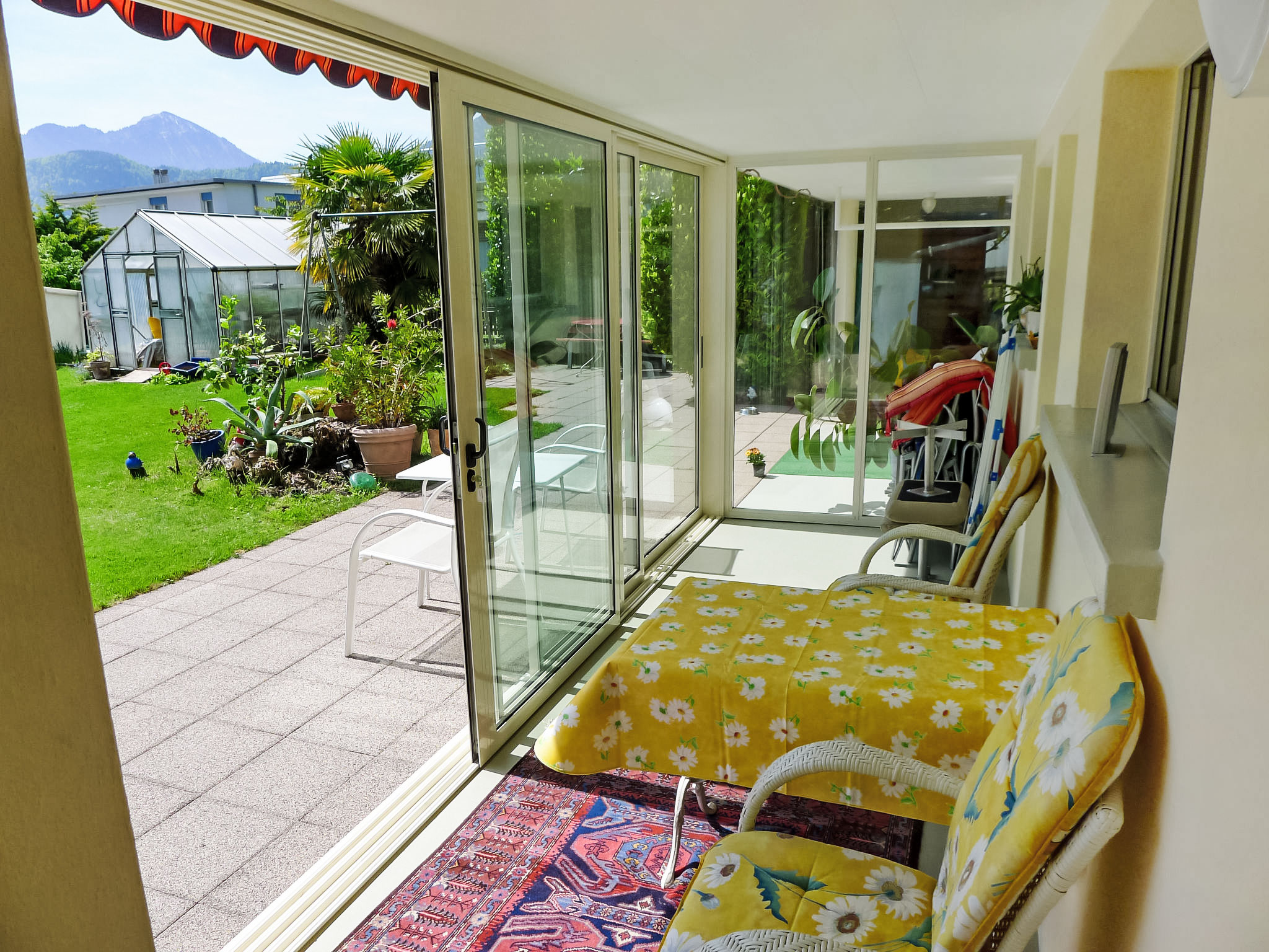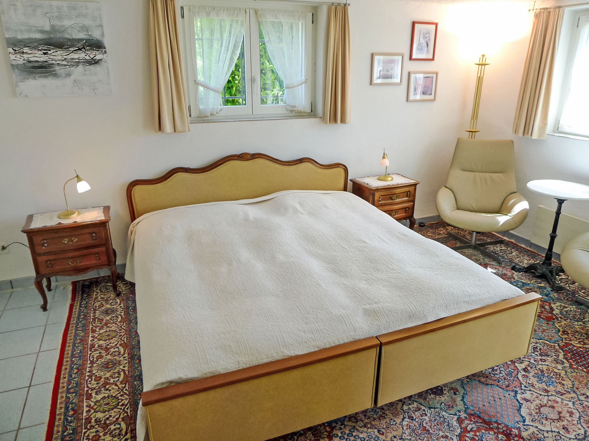 1-room apartment 31 m2, on the ground floor. Practical and cosy furnishings: 1 room 17 m2 with 1 double bed and satellite TV (flat screen). Exit to the patio. Kitchen-/living room (oven, dishwasher, 4 ceramic glass hob hotplates, microwave) with dining table. Shower/WC. Patio 8 m2, south facing position. Terrace furniture, conservatory. Partial view of the lake, the mountains and the resort. Facilities: Internet (WiFi, free). Parking at the house. Please note: non-smokers only.