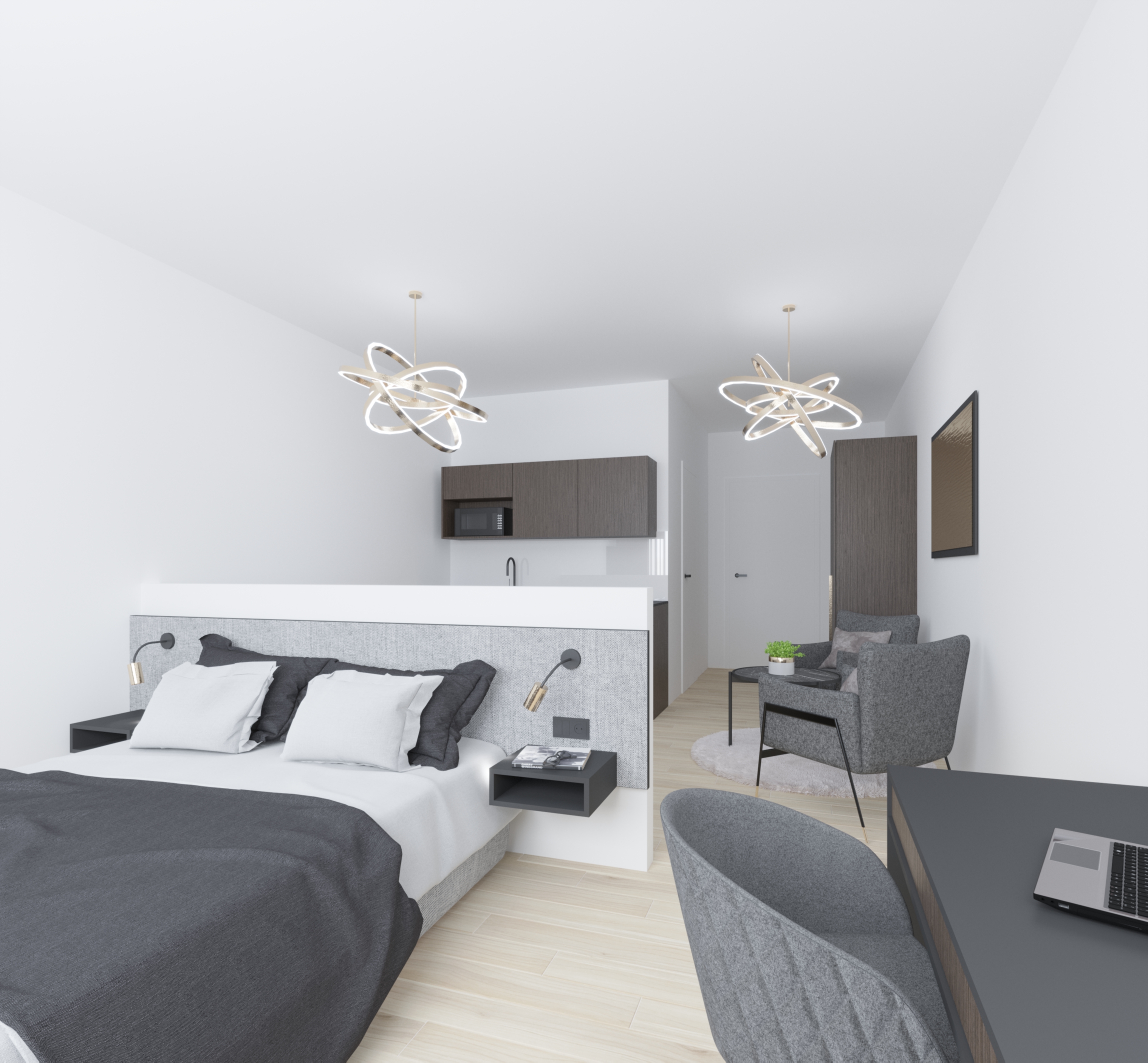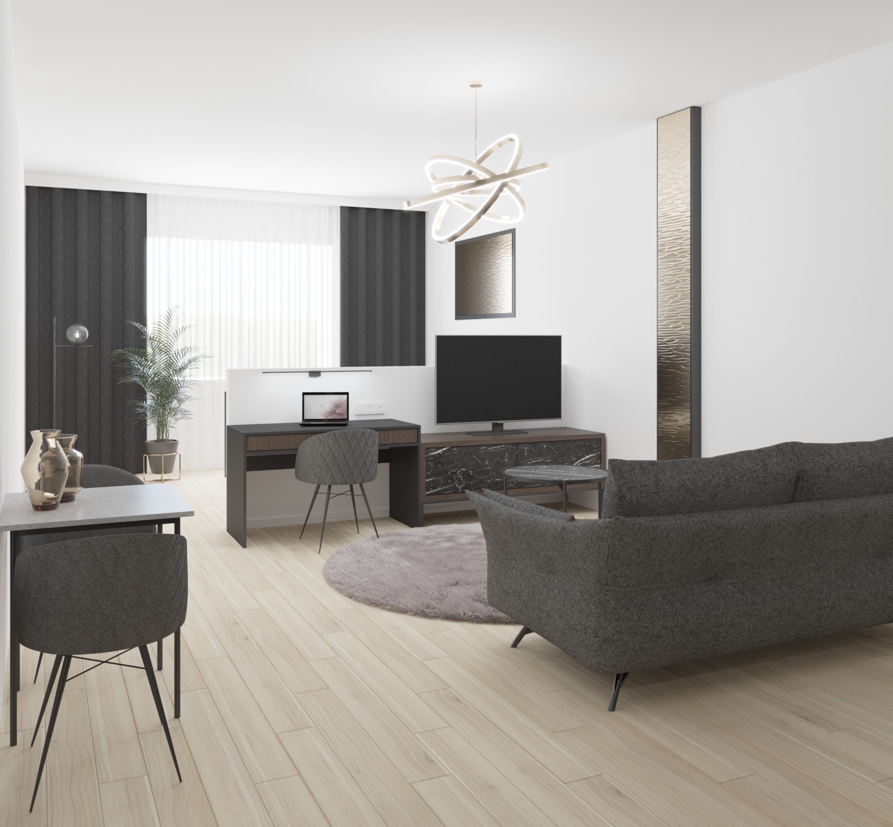 With all the apartments, particular attention has been paid to a coherent furnishing and design concept, as well as to optimal functionality. For longer stays, the Residence Apartments offer not only a large dining and living area, but also a separate bedroom with workspace.