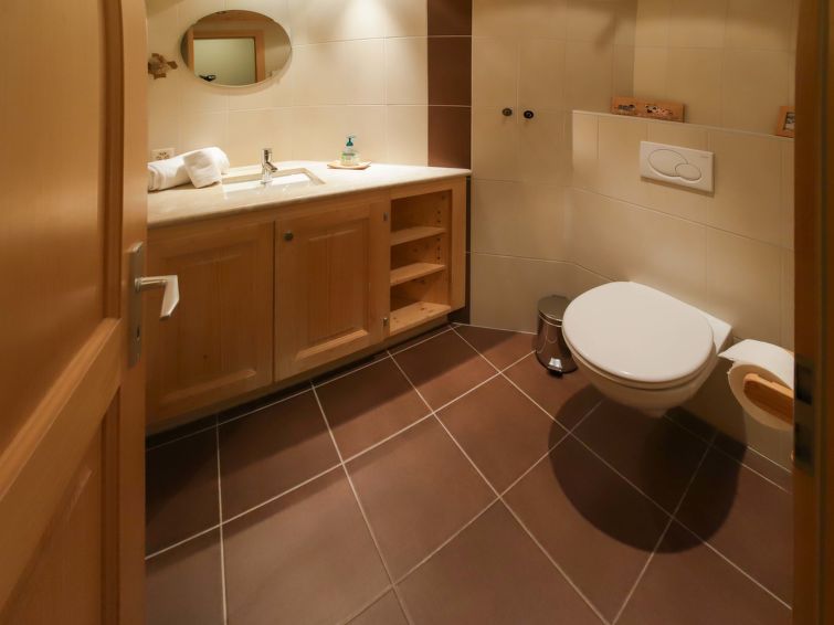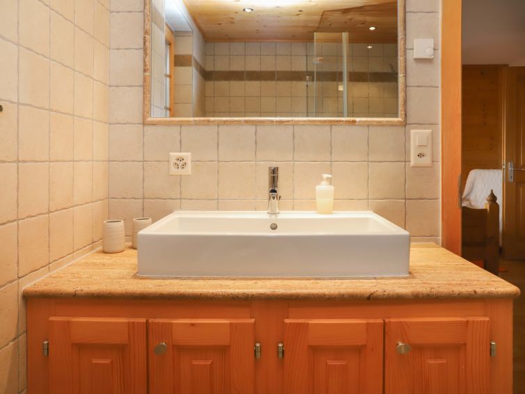 "Boule de Neige", 4-room chalet 96 m2 on 3 levels, south facing position. Comfortable and beautiful furnishings: living/dining room with panoramic window south facing position with open-hearth fireplace, dining nook, cable TV and electric heating. Exit to the balcony, south facing position. Open kitchen (dishwasher, 4 ceramic glass hob hotplates, toaster, kettle, fondue Set (cheese)) with small bar. On the lower ground floor: (spiral staircase), 1 room, south facing position with 1 double bed and shower/WC. Exit to the balcony, south facing position. 2 rooms, each room with 2 beds. Shower/WC, sep. WC. Balcony, south facing position. Very beautiful panoramic view of the mountains, the countryside and the resort. Facilities: Internet (WiFi, free). Parking (1 car). Please note: non-smokers only. No lift. Hamman and wine cellar available.