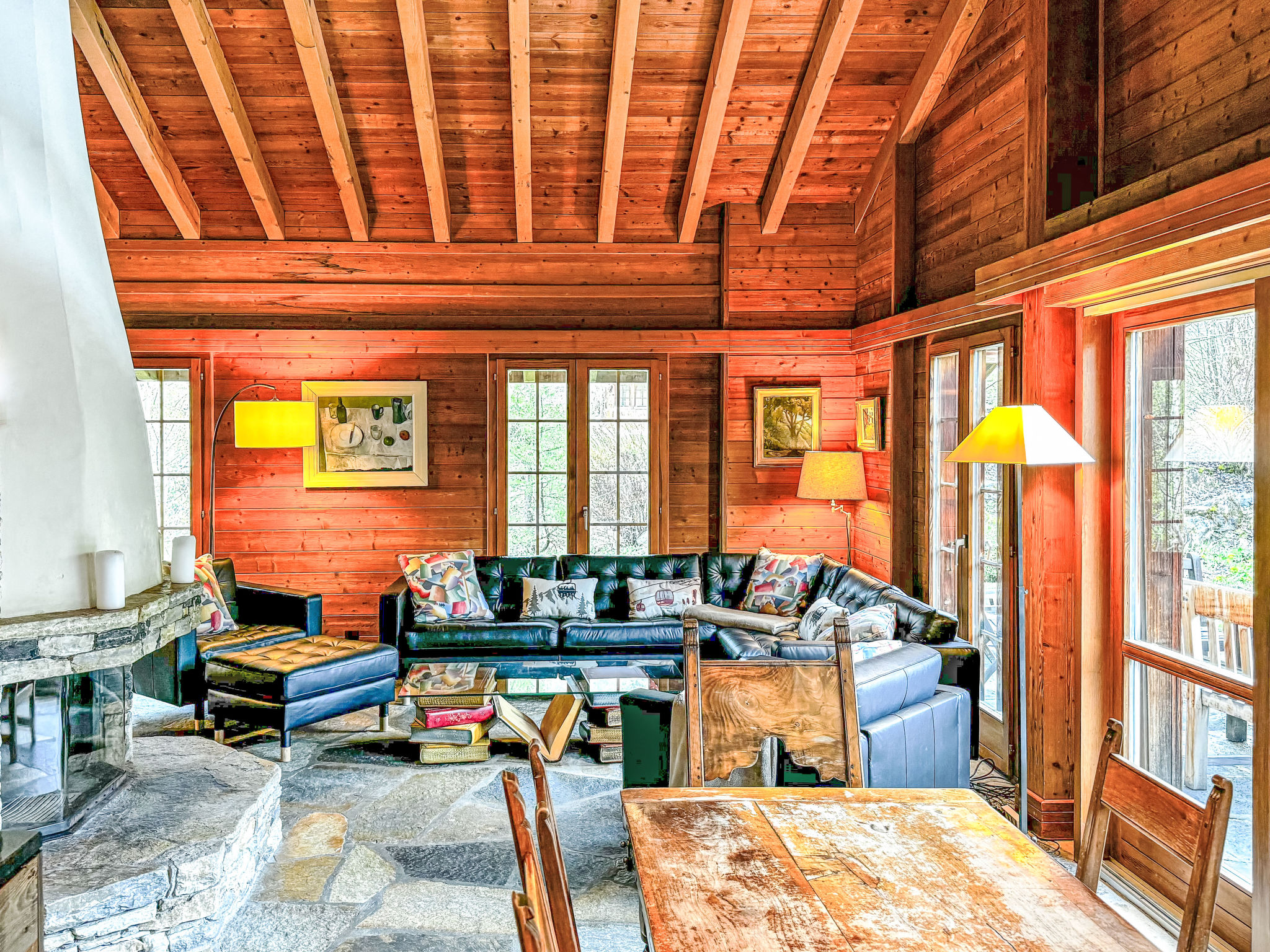 "Les Clèves", 5-room chalet 250 m2 on 3 levels. Comfortable and tasteful furnishings: large living/dining room 100 m2 with open-hearth fireplace and dining nook. Exit to the garden, to the terrace. 1 room with 1 french bed (160 cm, length 200 cm). Exit to the balcony. 1 room with 2 beds (90 cm, length 200 cm). Lounge with cable TV. Open kitchen (oven, dishwasher, 4 induction hot plates, toaster, kettle, freezer, electric coffee machine, Capsules for coffee machine (nespresso) extra, raclette grill, fondue Set (cheese)). Bath/WC, sep. WC. Floor heating. On the lower ground floor: entrance hall. 1 room with 1 french bed (160 cm, length 190 cm). Bath/shower/WC. Upper floor: lounge with library. 1 large room with 1 french bed (200 cm, length 200 cm), bidet, bath/shower/WC and cable TV. Balcony, 2 terraces, garden. Terrace furniture, barbecue. Very beautiful view of the mountains, the valley and the ski run. Facilities: washing machine, dryer, children's high chair, baby cot, hair dryer. Internet (WiFi, free). Parking (2 cars) at the house. Please note: non-smokers only.