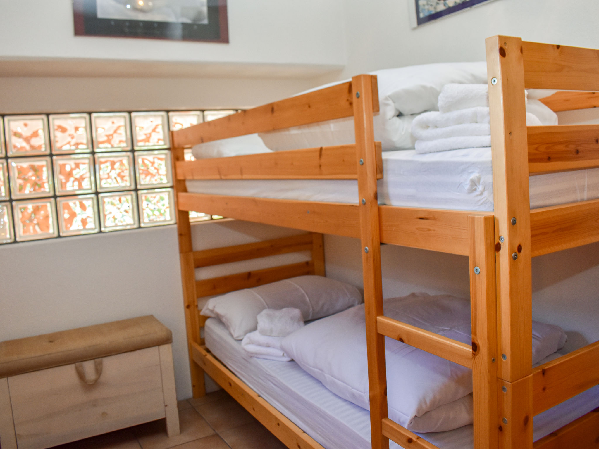 "Rüthanet", 3-room apartment 50 m2 on 1st floor, south-east facing position. Simple and cosy furnishings: open living/dining room with open-hearth fireplace, dining table and TV (flat screen). Exit to the patio. 1 double bedroom with 1 double bed (2 x 80 cm, length 200 cm). 1 small children's room with 1 x 2 bunk beds (80 cm, length 200 cm). Small, open kitchen (4 hot plates, oven, toaster, kettle, electric coffee machine, Capsules for coffee machine (nespresso) extra). Shower/bidet/WC. Electric heating, wood heating. Small patio, south facing position and, east facing position. Terrace furniture. Beautiful view of the mountains and the countryside. Facilities: children's high chair, baby cot for up to 2 year olds (extra), hair dryer. Internet (WiFi, free). Please note: non-smokers only. NL-00004797