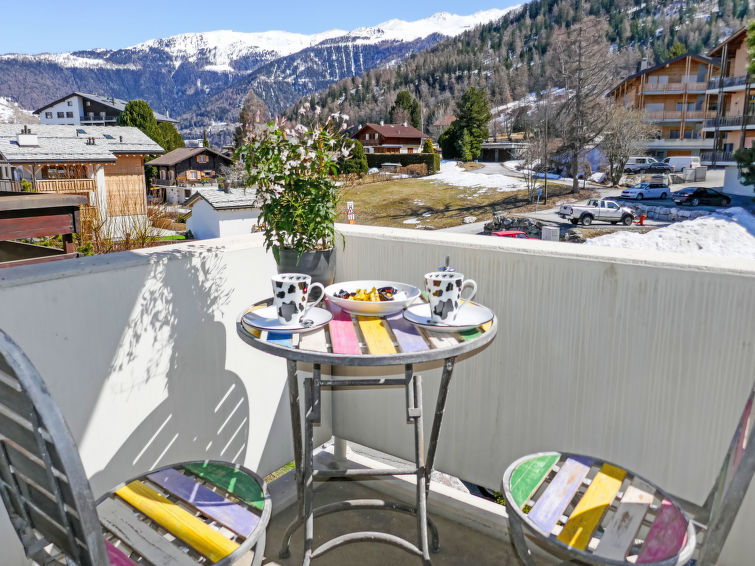 "Grand Place 5", 3-room apartment 70 m2 on 1st floor. Comfortable furnishings: living/dining room with open-hearth fireplace (only for decoration), cable TV. Exit to the balcony, south facing position and west facing position. 1 room with 2 beds (90 cm, length 190 cm). Exit to the balcony, west facing position. 1 room with 1 french bed (160 cm, length 190 cm). Exit to the balcony, west facing position. Open kitchen (4 hot plates, oven, dishwasher, toaster, kettle, microwave, electric coffee machine, Capsules for coffee machine (Nespresso) extra, raclette grill, fondue Set (cheese)). Bath/WC, sep. WC. View of the mountains and the valley. Facilities: Internet (WiFi, free). Garage, height 190 cm, width 220 cm. Please note: non-smokers only.