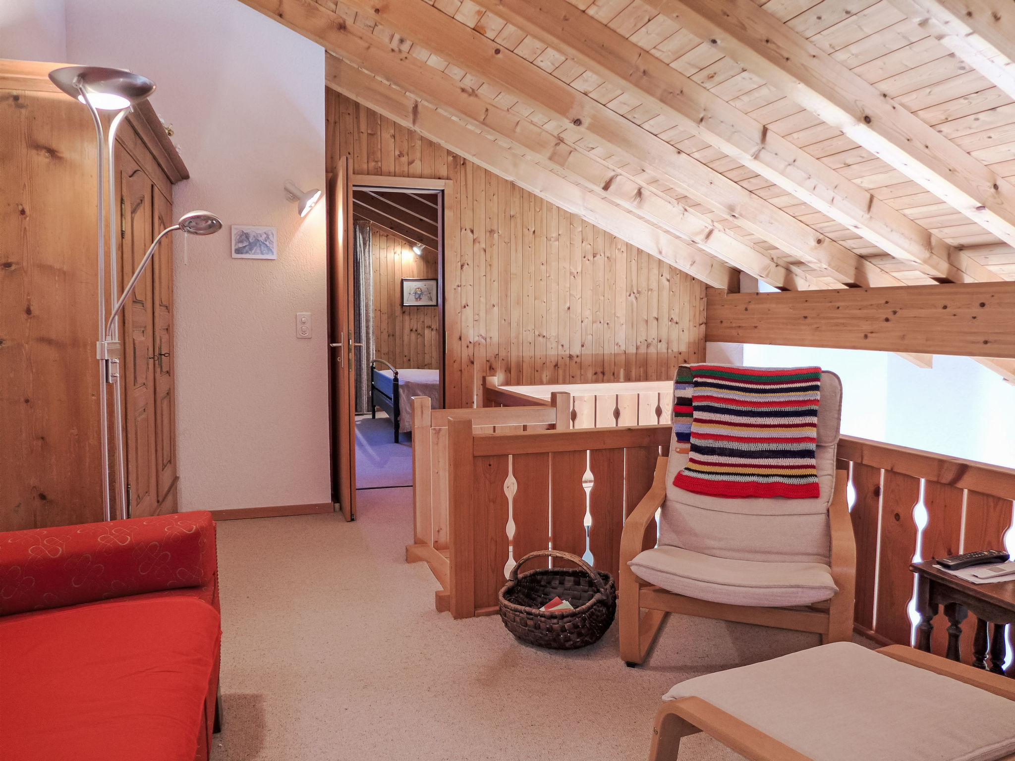 "Heidi", 4-room maisonette 120 m2 on 2 levels, on the top floor, south facing position. Spacious and bright, partly with sloping ceilings, partly renovated in 2023, very comfortable and cosy furnishings: open living room with open-hearth fireplace (only for decoration), dining table, radio and CD-player. Exit to the balcony. 1 room with 1 french bed (160 cm, length 200 cm). 1 small room with 1 bed (120 cm, length 200 cm). Open kitchen (oven, dishwasher, 4 ceramic glass hob hotplates, toaster, kettle, electric coffee machine, Capsules for coffee machine (Nespresso) extra, raclette grill, fondue Set (cheese)). Shower/WC. Upper floor: (steep stair) open gallery with sloping ceilings with cable TV (flat screen). 1 large room with sloping ceilings with 1 french bed (160 cm, length 200 cm), shower/WC. Carpet. South facing position and west facing position. Balcony furniture. Marvellous panoramic view of the mountains and the countryside. Facilities: hair dryer. Internet (WiFi, free). Parking space n 18, height 200 cm. Please note: suitable for families. Non-smokers only, non-smoking house. No lift.