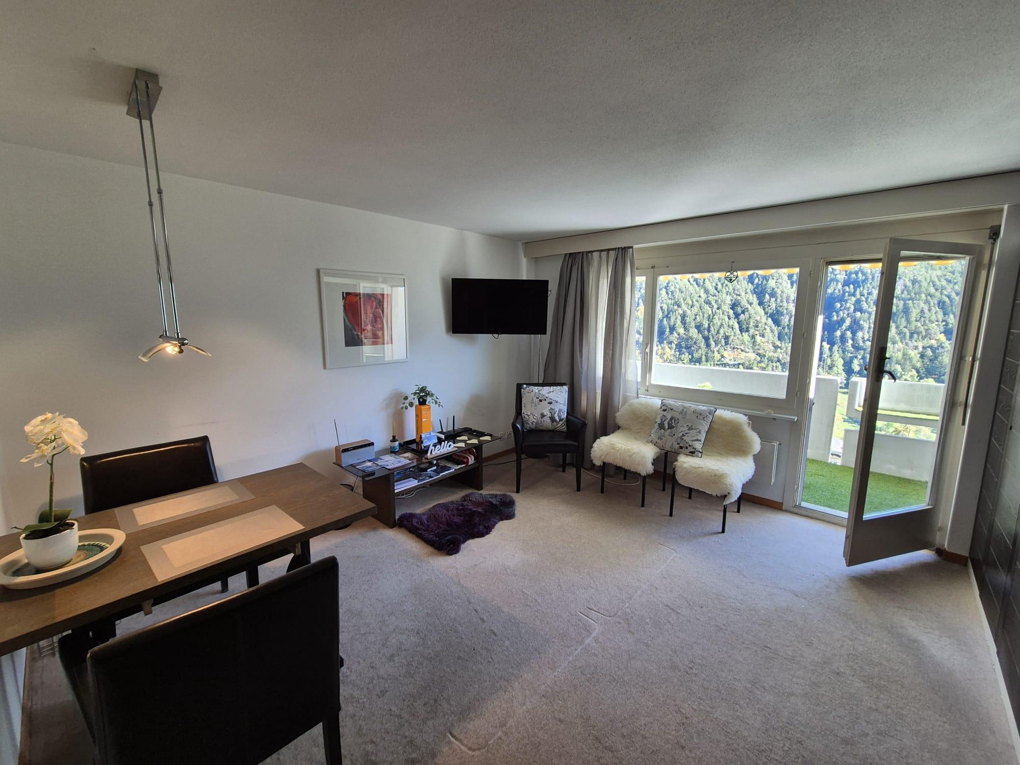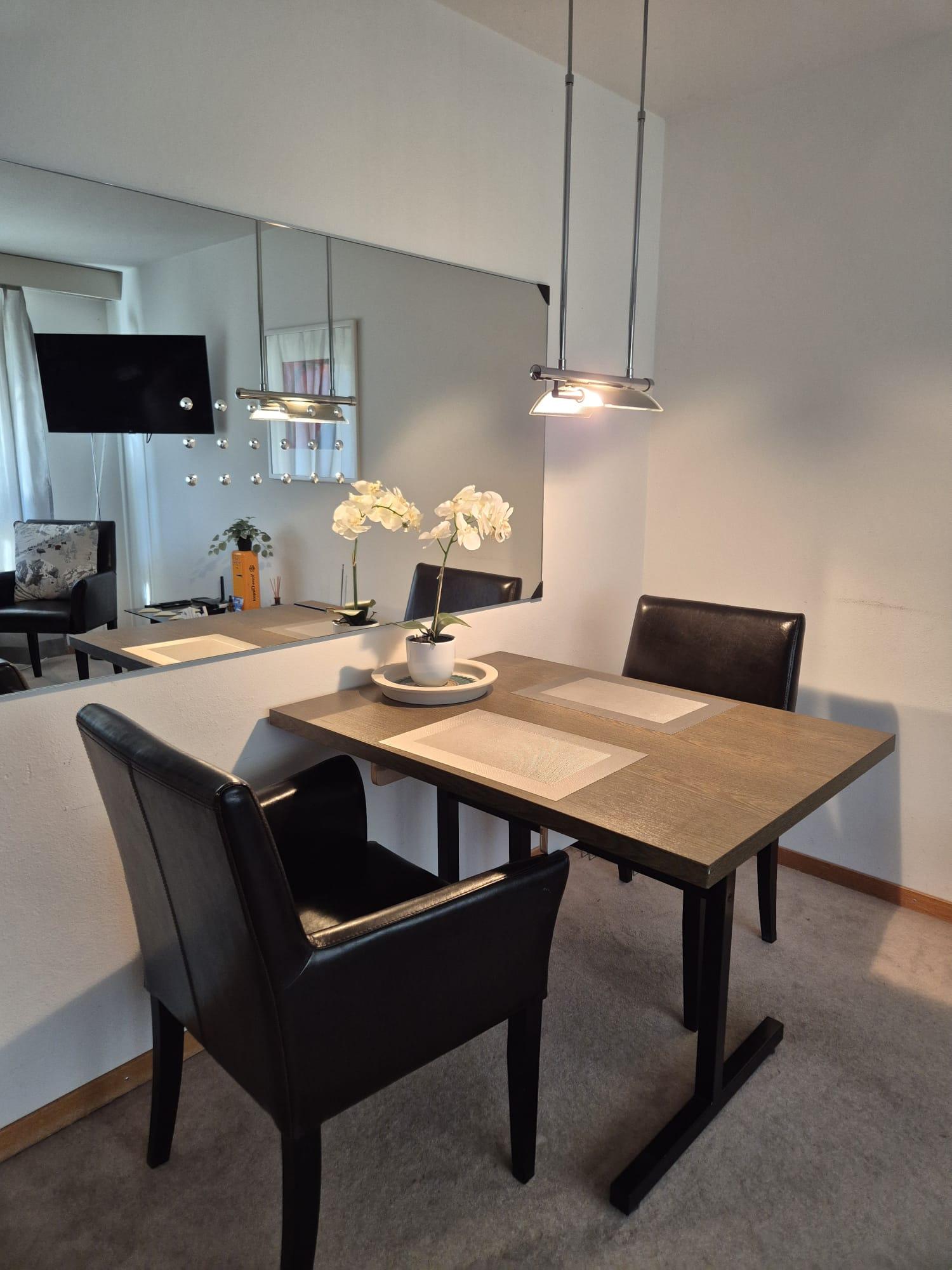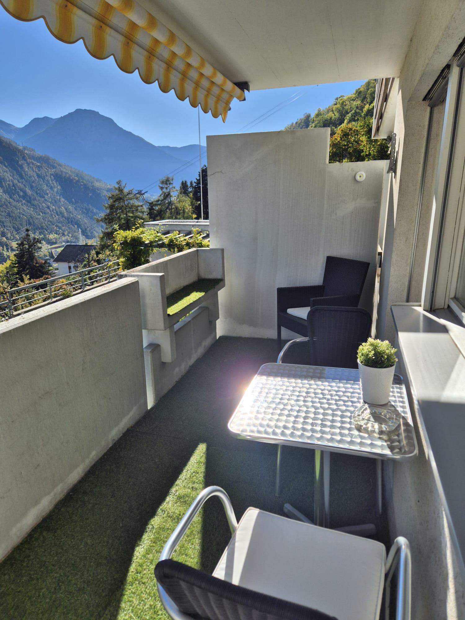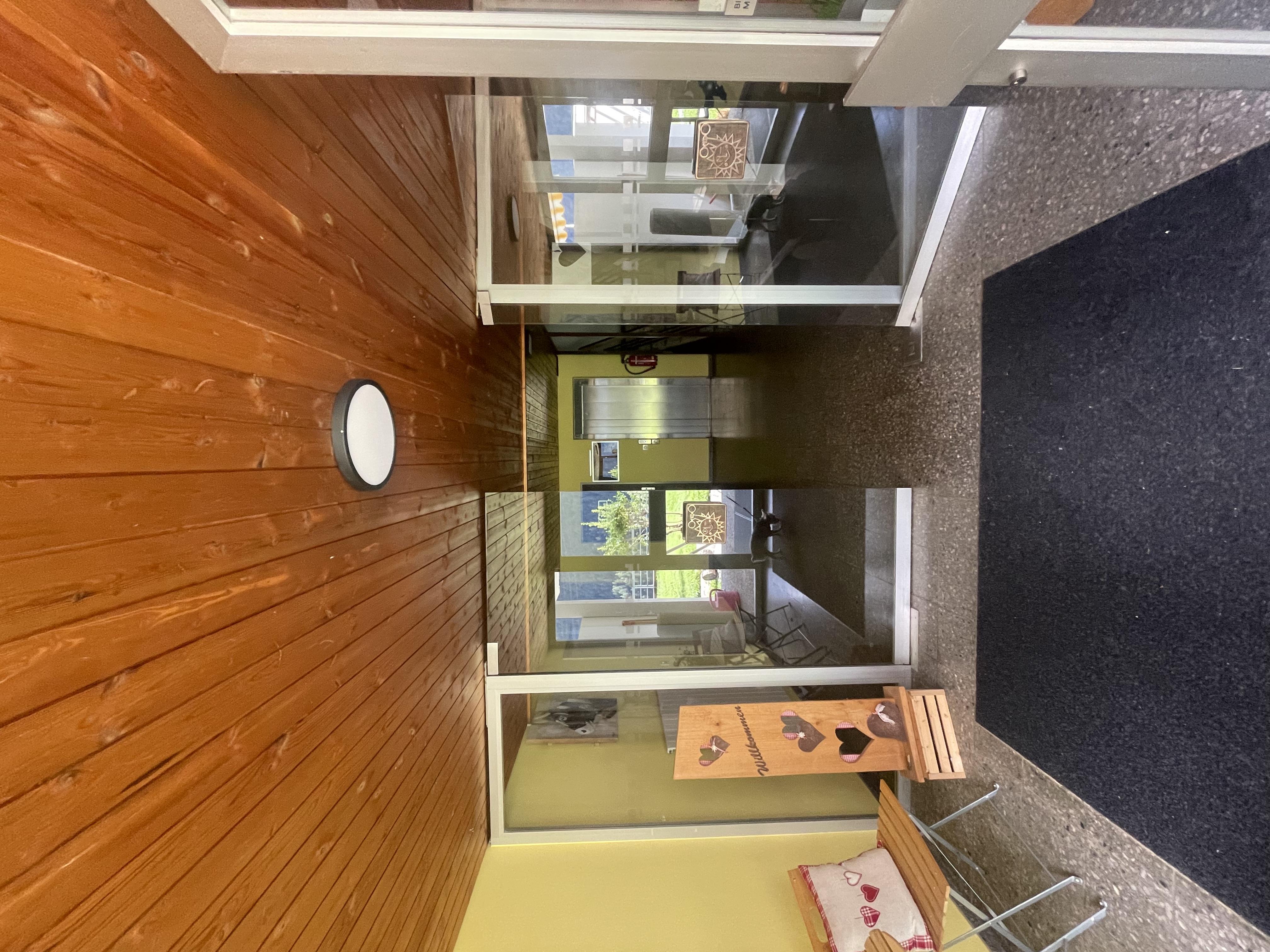 The charming vacation studio in the house "Im Grünen" offers a pleasant retreat in a quiet environment. The accommodation is ideal for two people and impresses with a cozy atmosphere as well as direct access to a sunny south-facing balcony with panoramic views of the surrounding mountain landscape. The combination of functional amenities and a nature-friendly ambiance creates ideal conditions for relaxing holiday days.