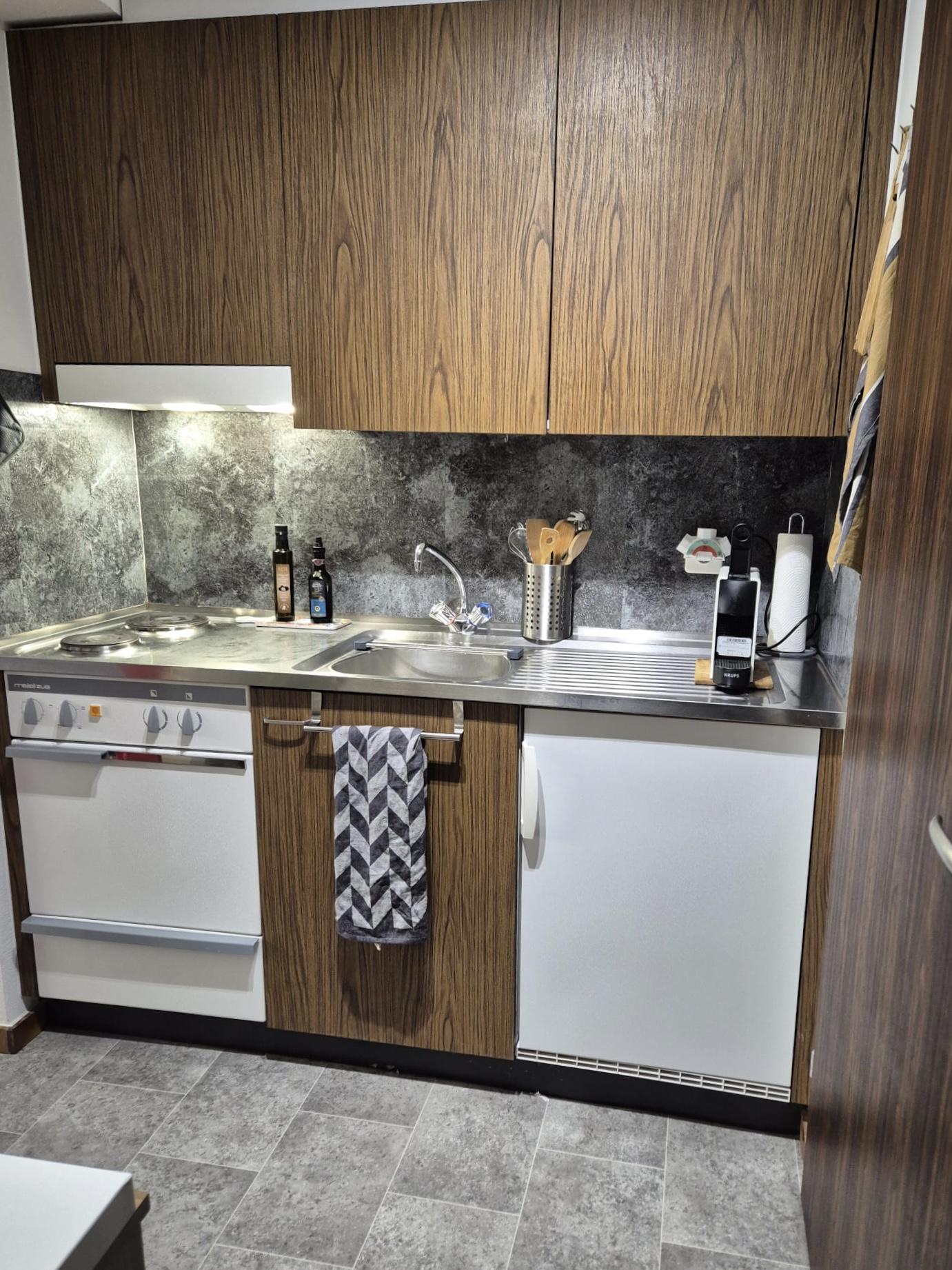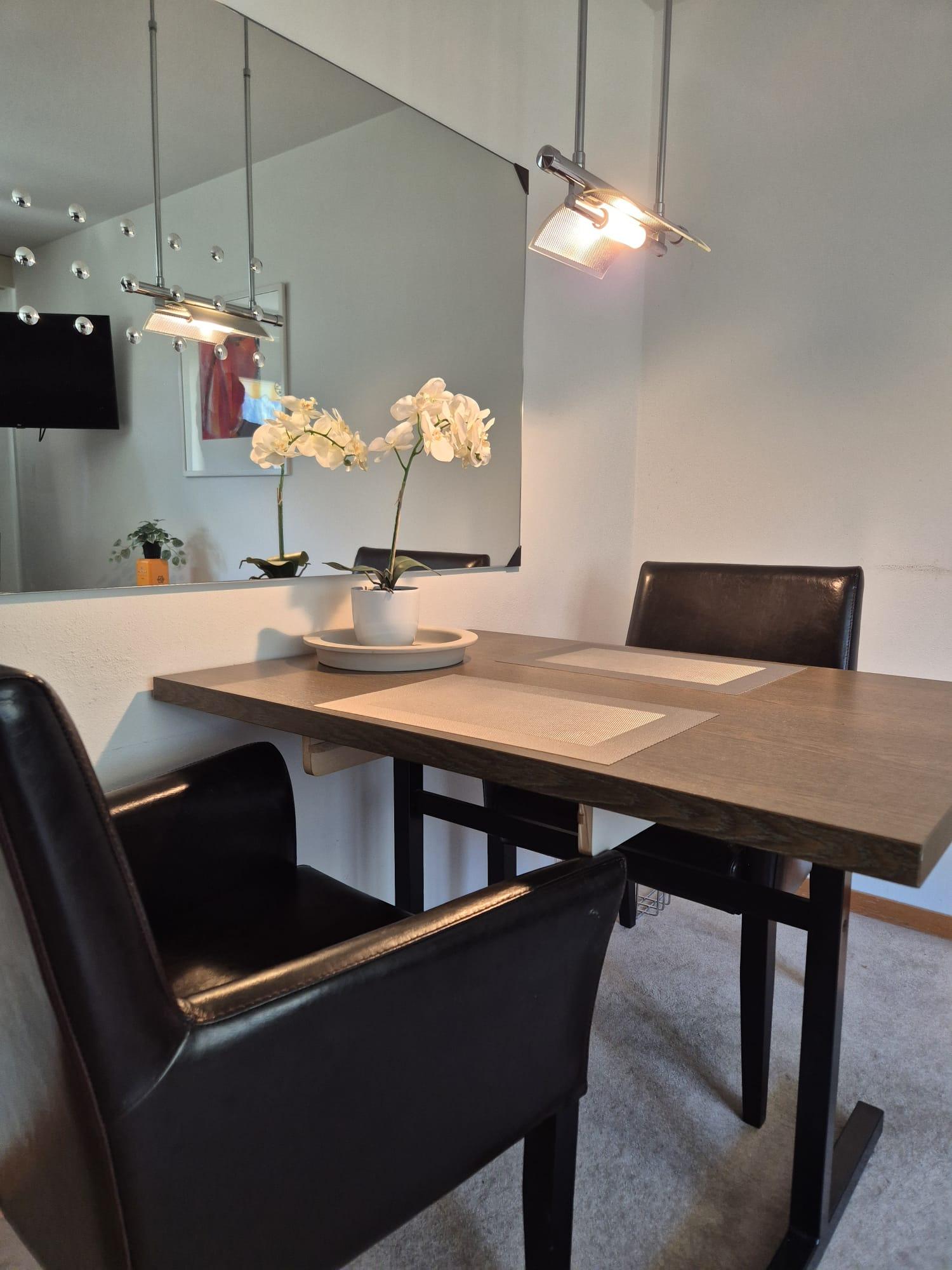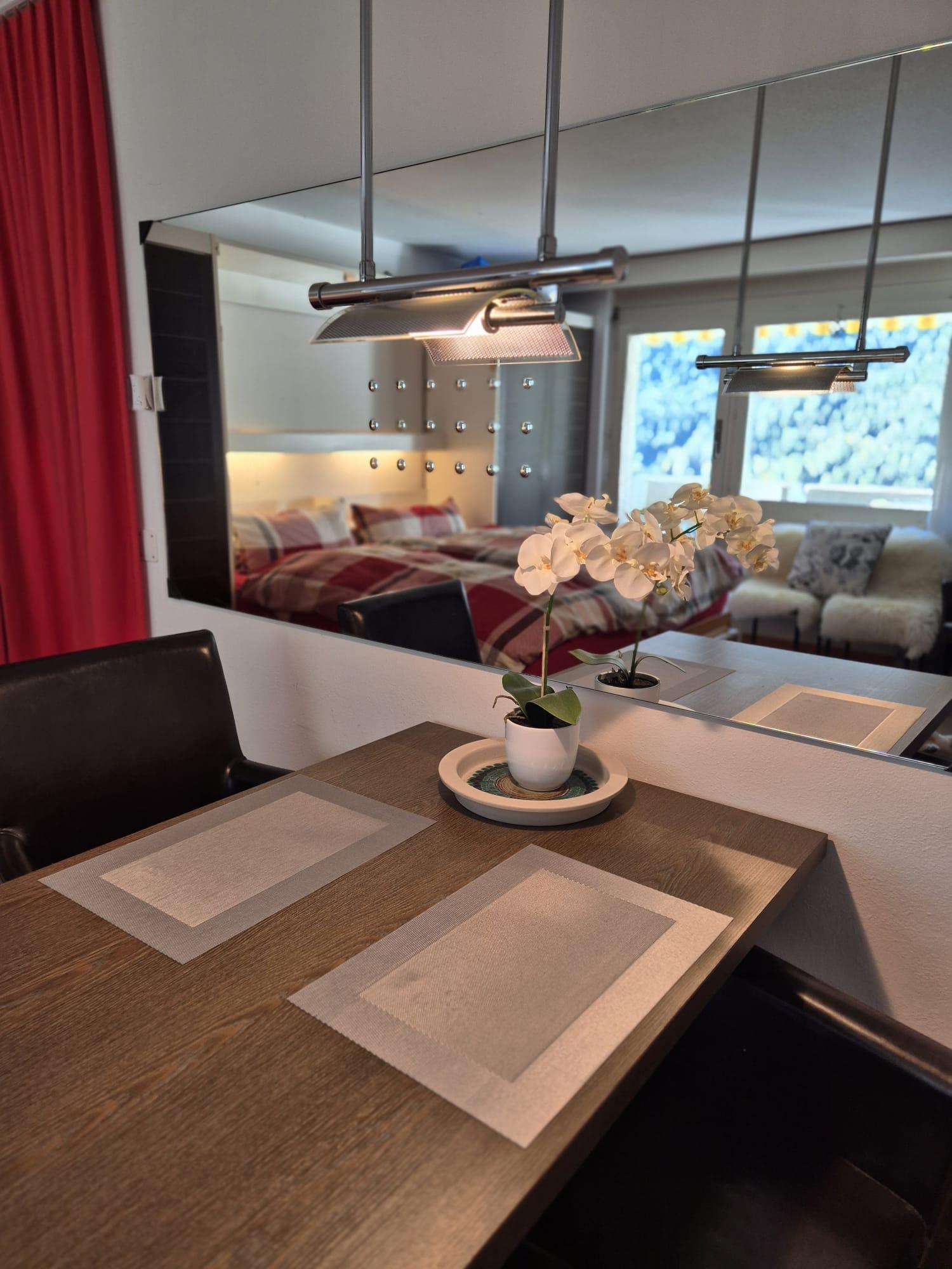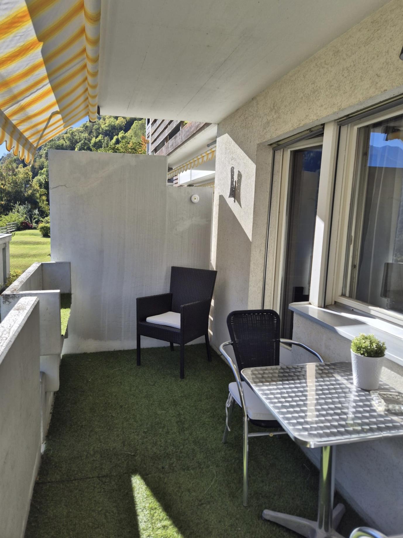 The charming vacation studio in the house "Im Grünen" offers a pleasant retreat in a quiet environment. The accommodation is ideal for two people and impresses with a cozy atmosphere as well as direct access to a sunny south-facing balcony with panoramic views of the surrounding mountain landscape. The combination of functional amenities and a nature-friendly ambiance creates ideal conditions for relaxing holiday days.