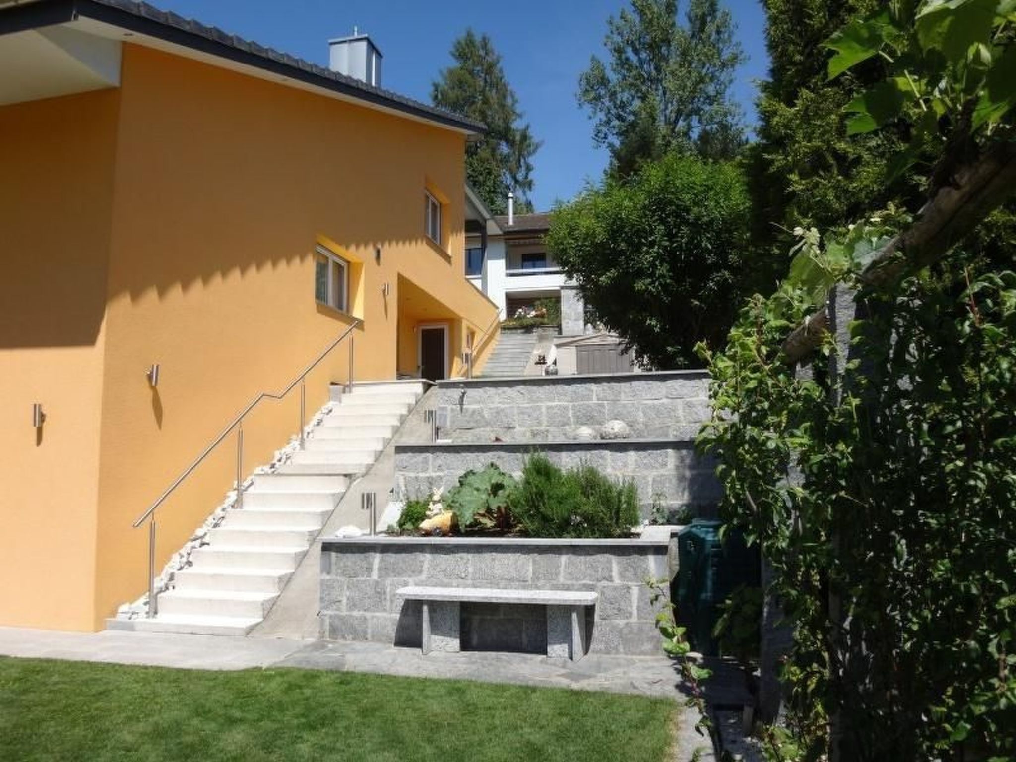 Flat facilities: Garden view, mountain view, sun terrace, covered seating area, garden furniture, outdoor dining area, fireplace with wood or charcoal, (on request gas barbecue or electric barbecue) outdoor whirlpool and shower, private entrance, flat screen TV with Swisscom TV with 7 days replay and radio, sitting area, heating, sofa, tiled/marble floor, Wood/parquet floor, wardrobe, clothes horse, iron, bathroom, shower, hairdryer with diffuser, shampoo, toilet, toilet paper, bath and shower towels, kitchen, refrigerator, microwave, dining area, dining table, bar, kitchen utensils, oven, hotplates, toaster, grill, Jura coffee machine (on request Nespresso machine)