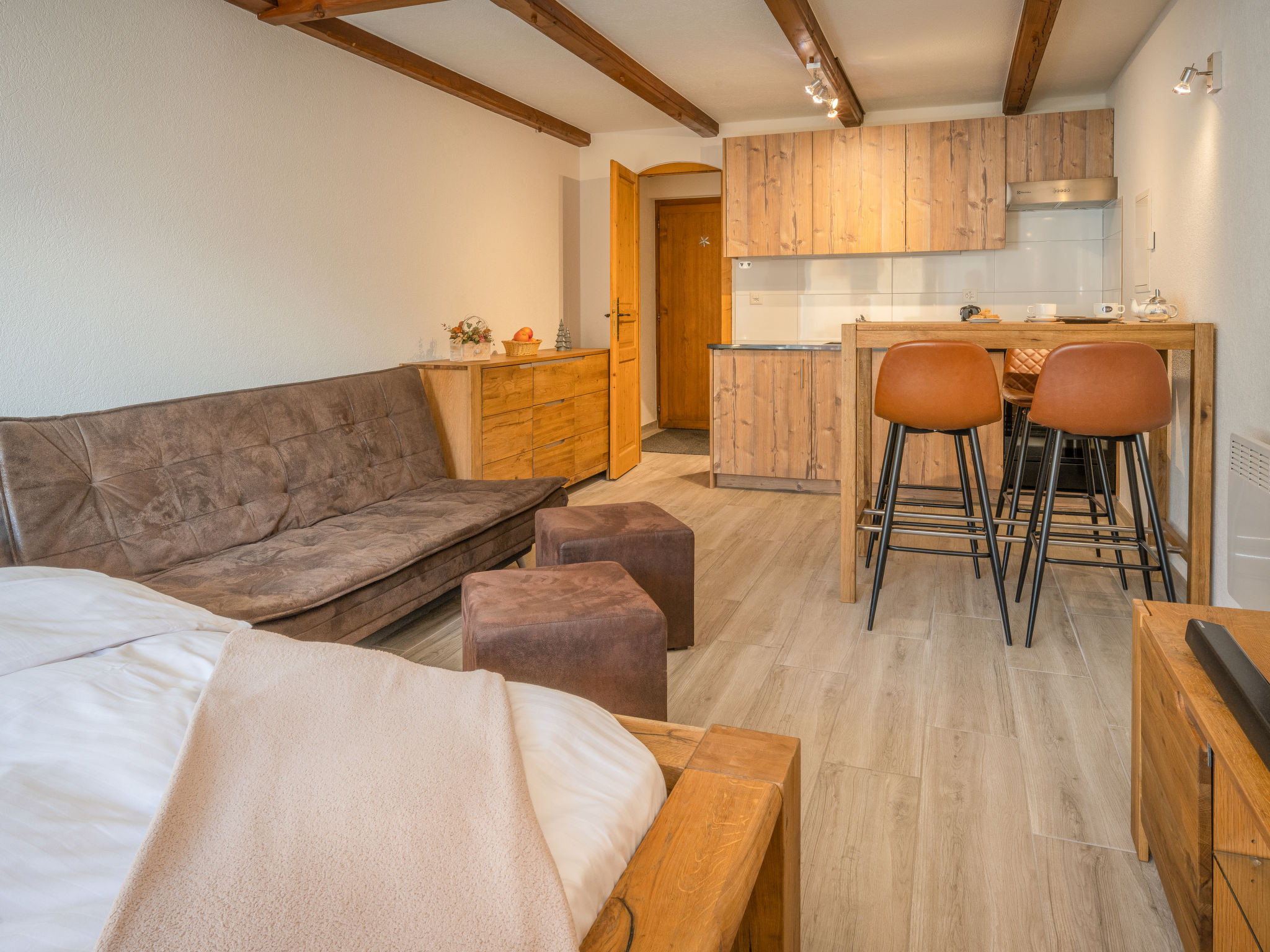 "Morthey 3", 1-room apartment 28 m2. Spacious, fully renovated in 2020, comfortable and modern furnishings: living/dining room with 1 french bed (180 cm, length 200 cm), dining table and cable TV. Exit to the balcony. Open kitchen (oven, 2 ceramic glass hob hotplates, toaster, kettle, electric coffee machine, Capsules for coffee machine (Nespresso) extra, raclette grill, fondue Set (cheese)). Shower/WC. Electric heating. Balcony, south facing position. Balcony furniture, deck chairs (2). Facilities: Internet (WiFi, free). Parking at the house. Please note: non-smokers only. Smart TV with USB support for key and hard drive.