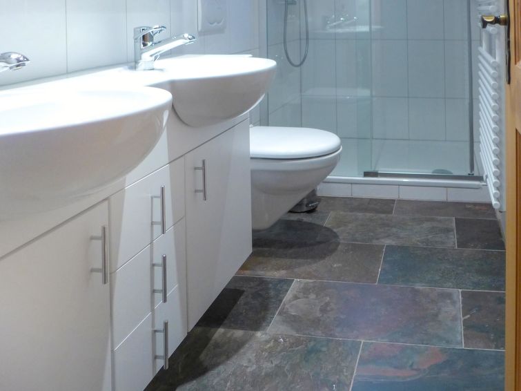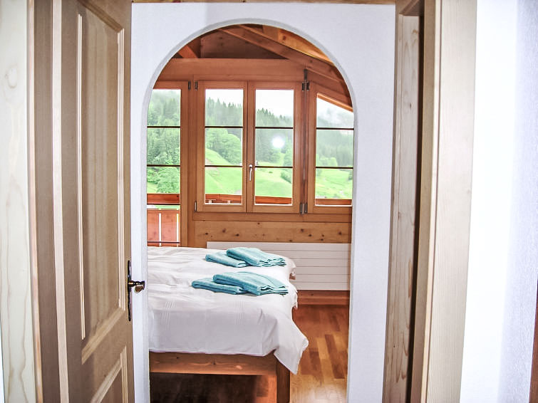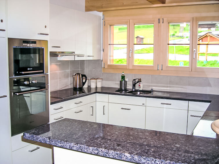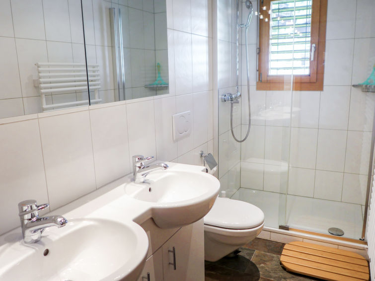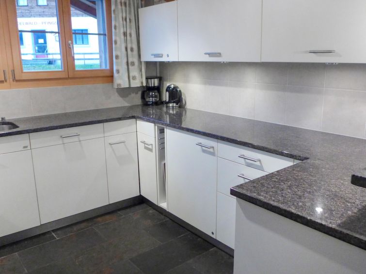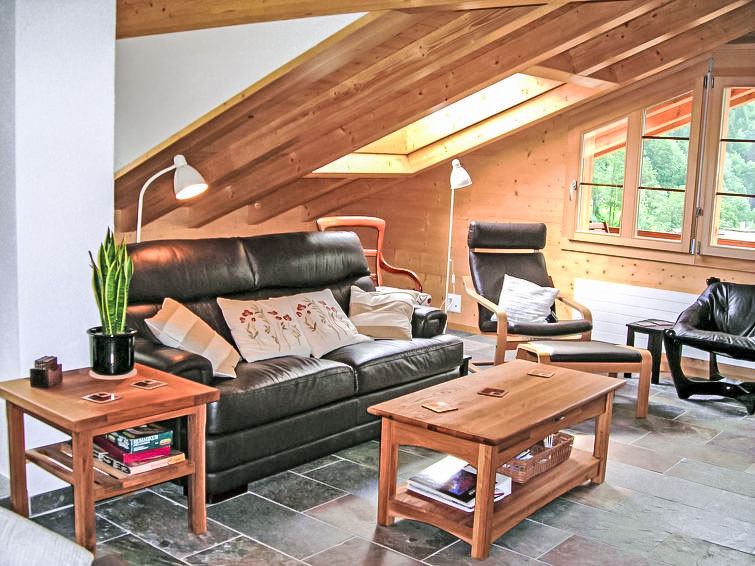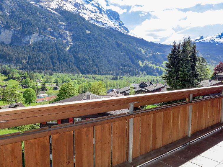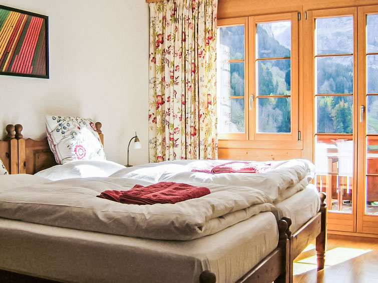 5-room apartment 130 m2, on the top floor, south facing position. Partly with sloping ceilings, tasteful and cosy furnishings: living/dining room with sloping ceilings with Scandinavian wood stove and satellite TV (flat screen), hi-fi system. Exit to the balcony, south facing position and west facing position. 1 room with 2 beds (90 cm, length 200 cm). Exit to the balcony. 1 room with 1 french bed (160 cm, length 200 cm). Exit to the balcony. 1 room with 2 beds (90 cm, length 200 cm), shower/WC. Exit to the balcony. 1 small room 10 m2, with sloping ceilings with 2 beds (90 cm, length 200 cm). Open kitchen (oven, dishwasher, 4 ceramic glass hob hotplates, electric coffee machine, Capsules for coffee machine (Nespresso) extra, raclette grill, fondue Set (cheese)). Bath/WC, shower/WC. Underfloor heating. Natural stone floors. Large balcony, south facing position and west facing position balcony, east facing position. Balcony furniture. Marvellous view of the mountains and Eiger. Facilities: hair dryer, logs (extra). Internet (WiFi, free). Parking space n Besucher, garage space n 6 & 7 (2 cars) at the house, height 200 cm. Please note: non-smokers only. Fire extinguisher, no lift.