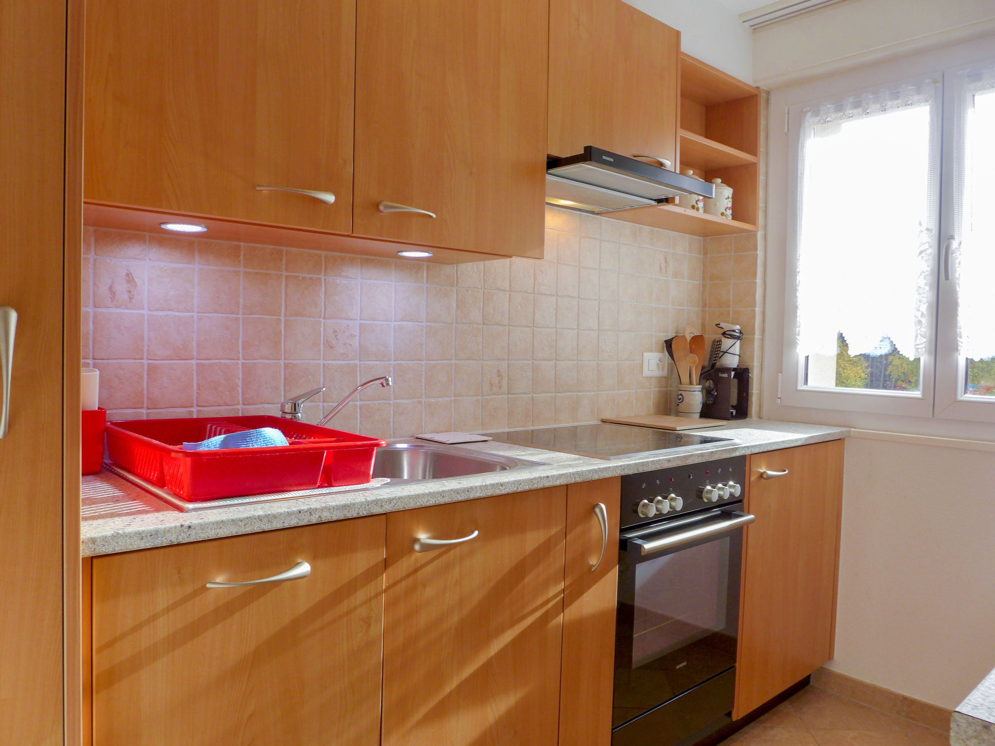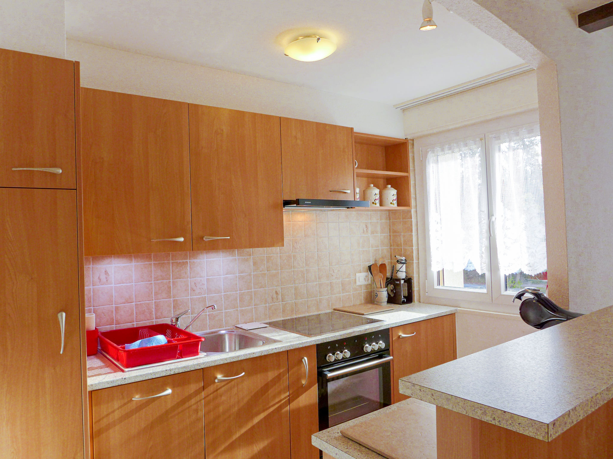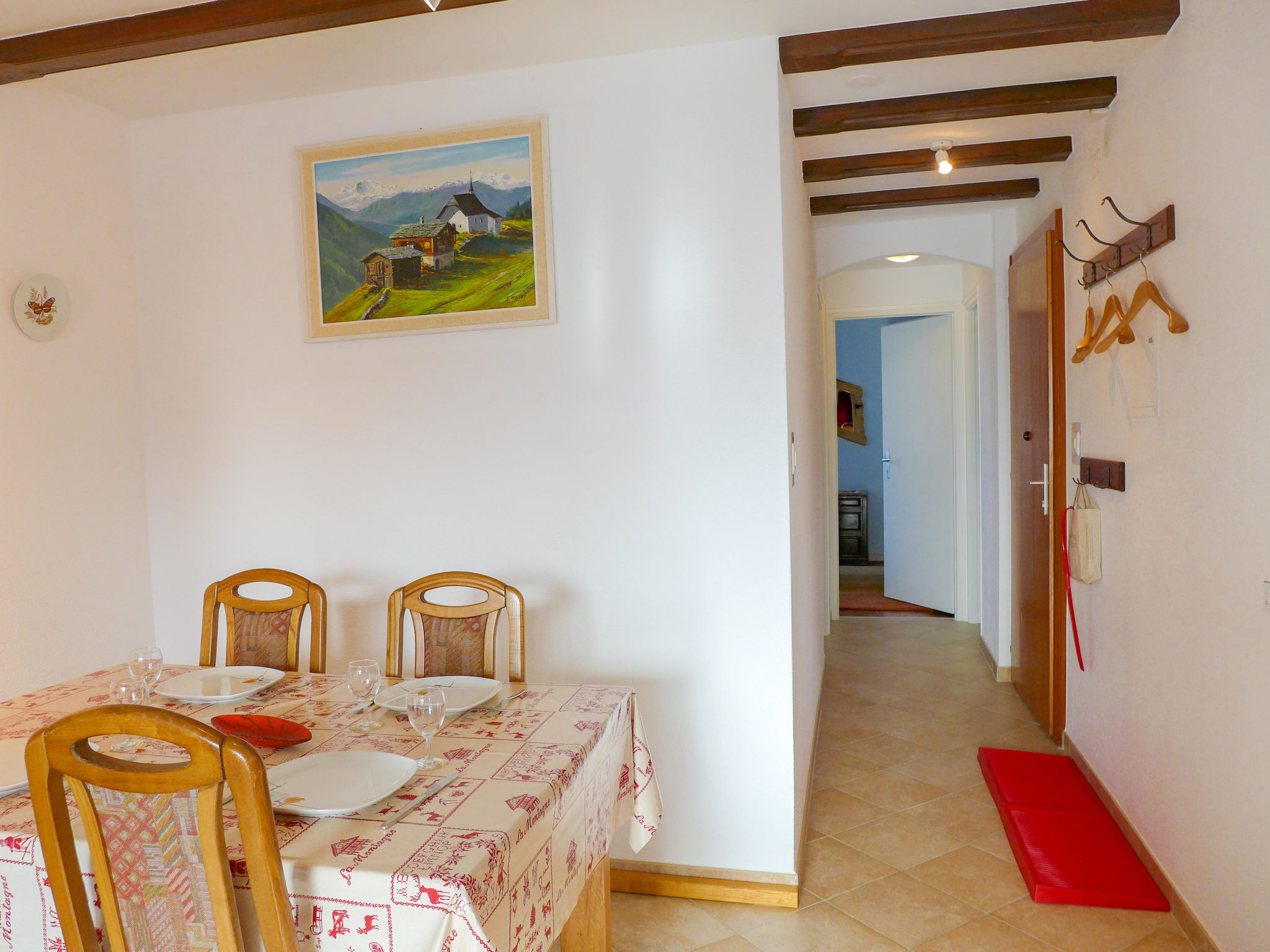 "Barzettes-Vacances B 455/ entrée n°16", 3-room apartment 58 m2 on 2nd floor. Renovated in 2010, beautiful furnishings: living/dining room 55 m2 with cable TV, radio and DVD. Exit to the balcony, east facing position. 1 room with 2 beds (90 cm, length 190 cm). 1 room with 1 x 2 bunk beds (90 cm, length 190 cm). Open kitchen (oven, dishwasher, 4 ceramic glass hob hotplates, toaster, kettle, electric coffee machine, Capsules for coffee machine (Dolce Gusto) extra, raclette grill, fondue Set (chinoise, cheese)). Bath/WC. Small balcony. Balcony furniture. Side view of the mountains and the forest. Facilities: iron, hair dryer. Internet (WiFi, free). Garage on the property, height 200 cm, width 283 cm. Please note: non-smokers only.