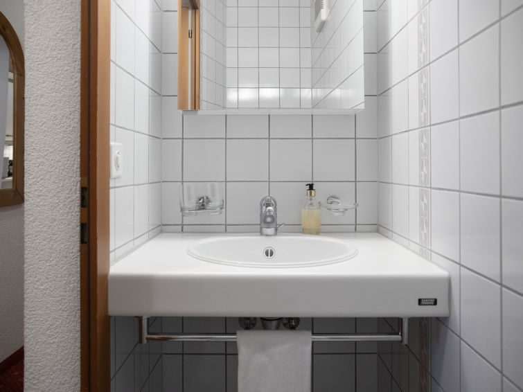 3-room apartment 64 m2 on 2nd floor, east facing position. Living/dining room with cable TV (flat screen). 2 double bedrooms. Kitchen (oven, dishwasher, 4 ceramic glass hob hotplates, toaster, kettle, electric coffee machine). Bath/WC, sep. WC. Terrace, east facing position. Terrace furniture. View of the mountains. Facilities: hair dryer. Internet (WiFi, free). Please note: non-smokers only. Maximum 1 pet/ dog allowed. A fondue set (meat or cheese) and a raclette oven can be borrowed from reception.