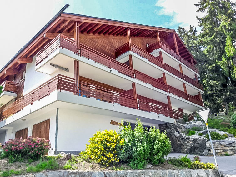Comfortable residence "Tsaumiau A". Above Montana, in the district of Violettes, 1.5 km from the centre of Montana, 2.1 km from the lake, 100 m from the skiing area, east facing position. In the complex: lift, storage room for skis, central heating system, washing machine, tumble dryer (for shared use, extra). Roofed, parking at the house at 150 m communal covered parking. Shop 1.5 km, supermarket 1.6 km, restaurant 1.5 km, bakery 250 m, bus stop "télé Violettes" 200 m, railway station "Funiculaire Montana Gare" 1.1 km, bathing lake "Moubra" 2.8 km, lake Grenon 2.1 km. Golf course (18 hole) 3.9 km, skisport facilities, slopes, ski rental 100 m, ski bus stop 200 m. Well-known lakes can easily be reached: Lac de la Moubra 2.8 km, Etang Long 3.7 km. Please note: ski bus (free of charge). Additional accommodations can be booked.