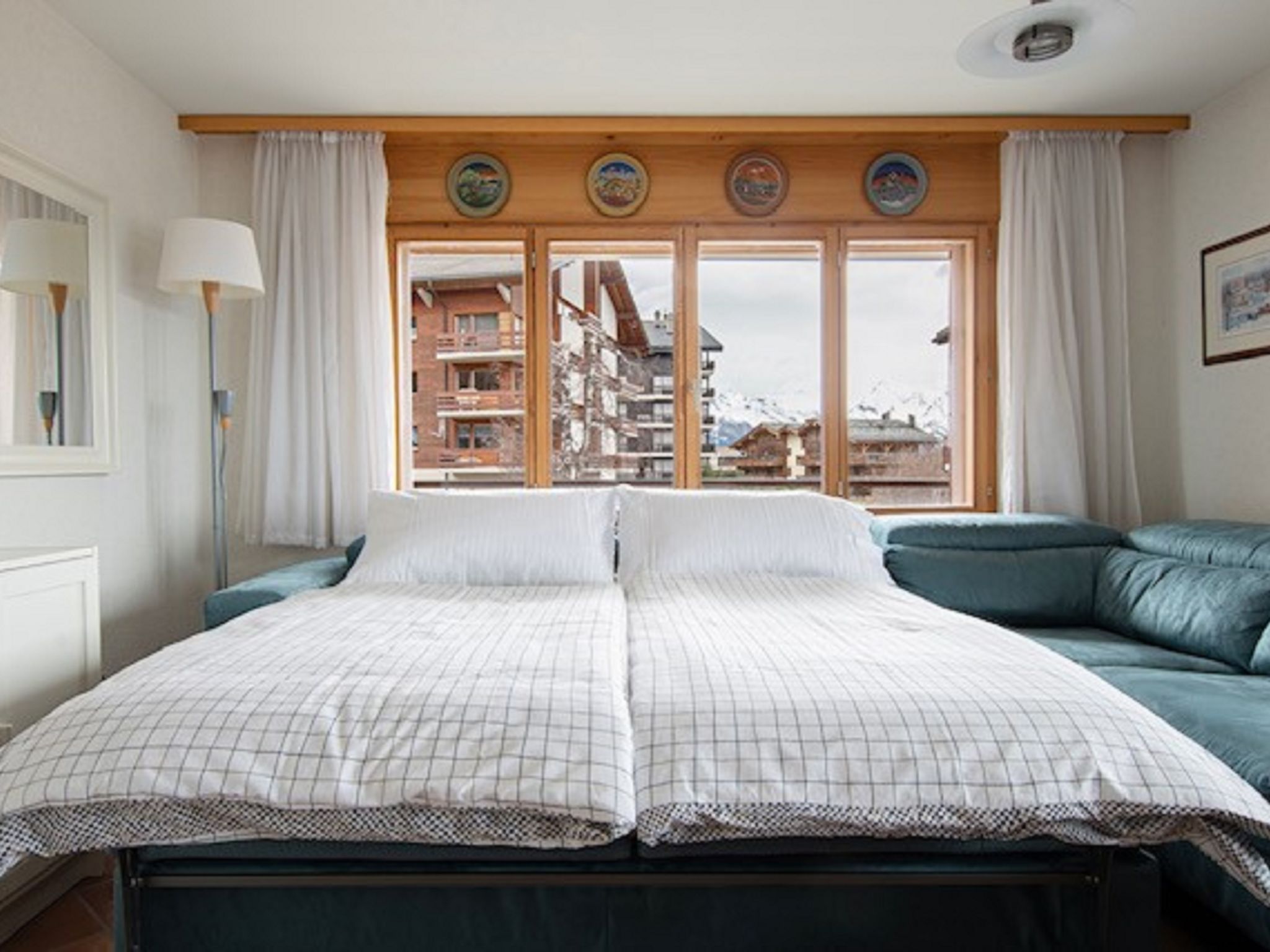 "Ambassador I Apt 7", 3-room apartment 75 m2 on 2nd floor. Living/dining room with 1 sofabed (160 cm, length 190 cm), cable TV and DVD. Exit to the balcony. 1 room with 1 french bed (160 cm, length 200 cm). Exit to the balcony. 1 room with 2 beds (90 cm, length 200 cm). Exit to the balcony. Kitchen (oven, dishwasher, microwave, electric coffee machine, raclette grill, fondue Set (cheese)). Bath/WC, shower/WC. Large balcony 45 m2, north facing position and west facing position, small balcony, north facing position and, east facing position. Terrace furniture. Beautiful view of the mountains. Facilities: hair dryer. Internet (WiFi, free). Please note: non-smokers only. CH1961.831.3