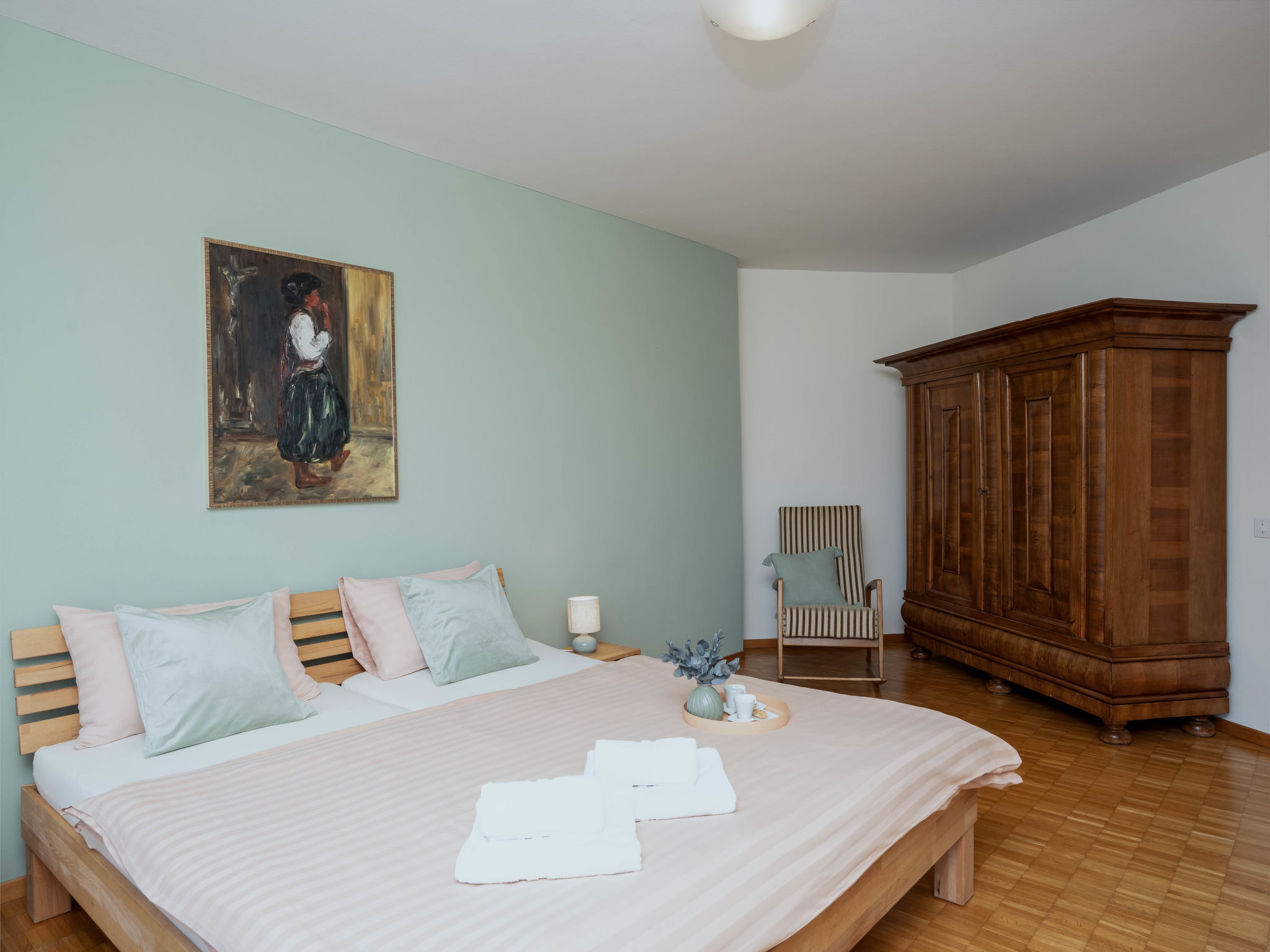 "Suite Classic", 2-room apartment 70 m2 on 3rd floor, south facing position. Living/dining room with 2 fold-away beds (90 cm, length 200 cm), satellite TV and radio. 1 room with 1 double bed (1 x 180 cm, length 200 cm). Kitchenette (oven, electric coffee machine, Capsules for coffee machine (Nespresso) extra). Bath/WC, sep. WC. Oil heating. Large balcony. Beautiful panoramic view of the lake, the mountains and the resort. Facilities: Internet (WiFi, free). Please note: non-smokers only, non-smoking house. Maximum 1 pet/ dog allowed. NL-00004958