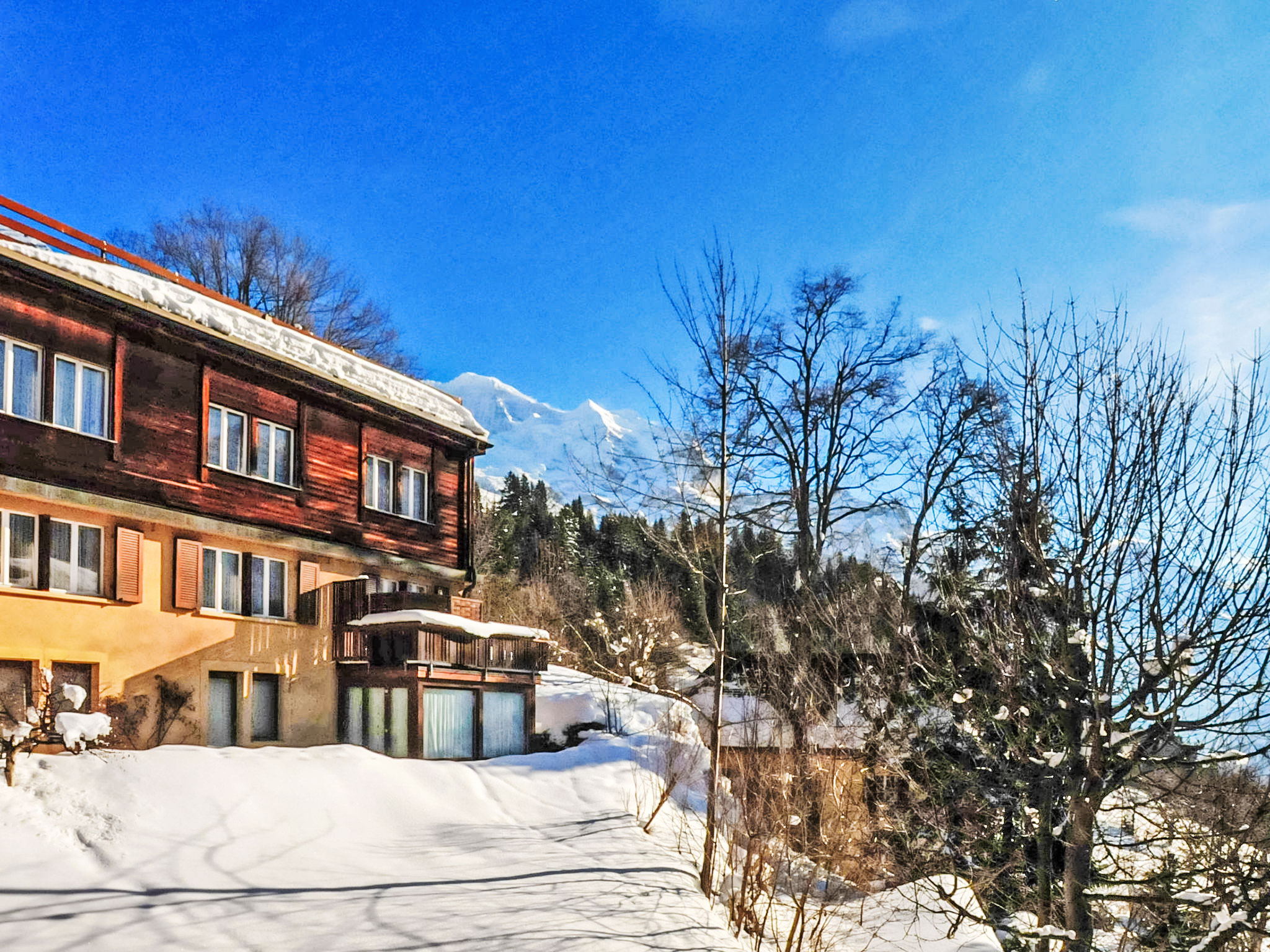 Apartment block "Schweizerhof". 400 m from the centre of Wengen, in a quiet, sunny position on a slope. In the house: central heating system, washing machine, tumble dryer (for shared use). Pre-arrival grocery service. Shop, supermarket 400 m, restaurant 100 m, bar, bakery 400 m, 5 minute walk to the centre, bus stop "Lauterbrunnen (by train)" 3.4 km, railway station "Wengen" 400 m, outdoor swimming pool 600 m. Cable car, skisport facilities 400 m, children's playground 150 m. Well-known lakes can easily be reached: Thunersee 13 km, Brienzersee 13 km. Please note: car-free holiday complex. Arrival via mountain railway. Additional accommodations can be booked. Arrival is only possible by train from Lauterbrunnen – 14 minutes driving time.
