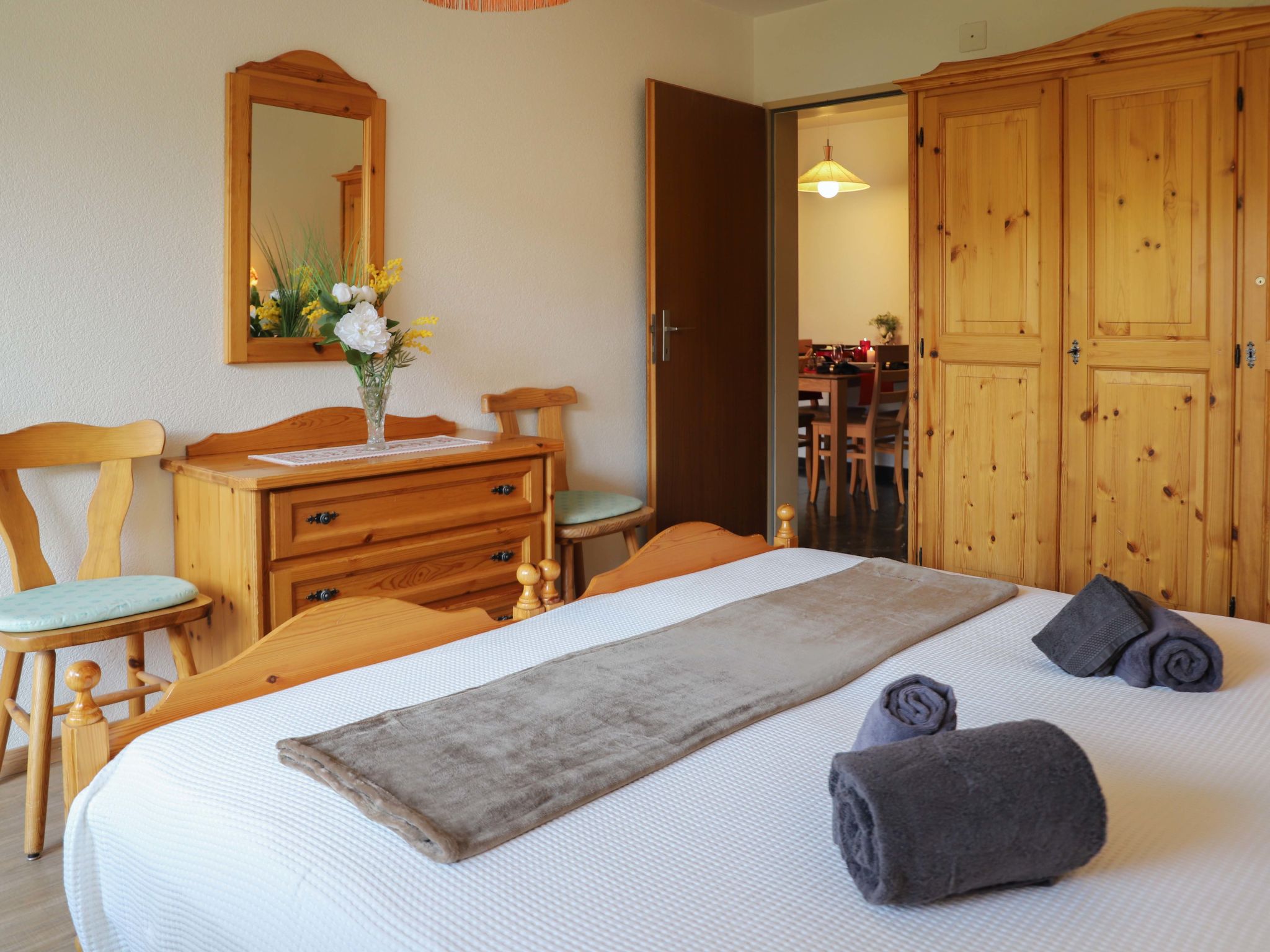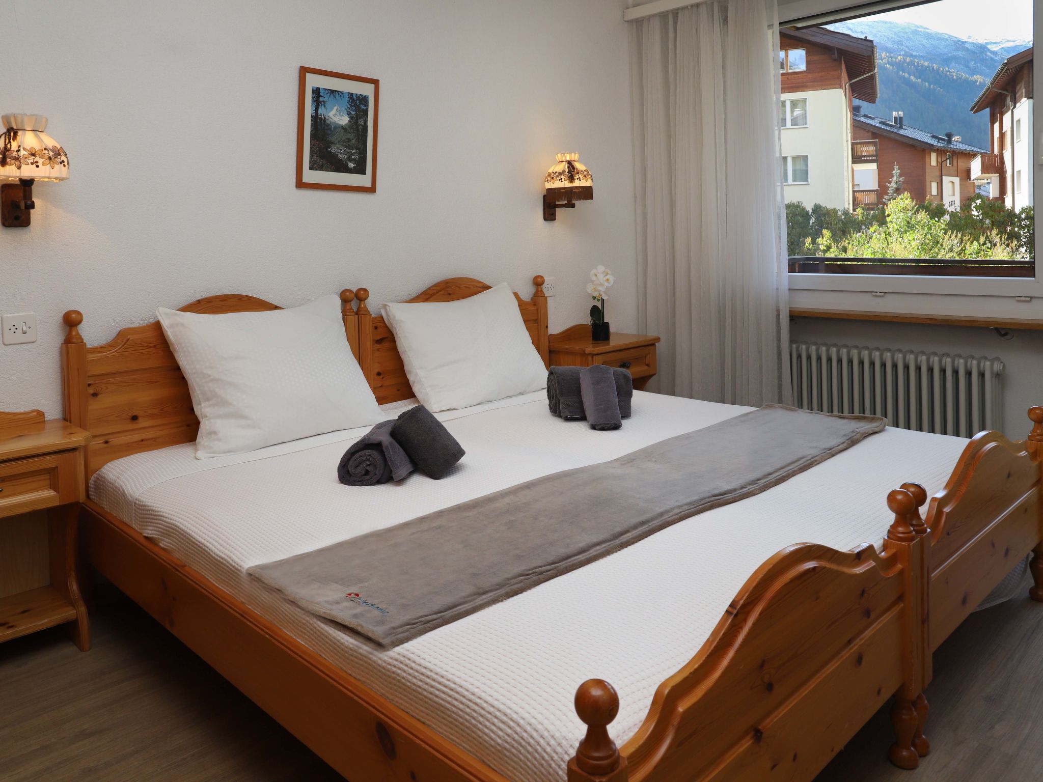 2-room apartment 53 m2 on 1st floor, south facing position. Bright, simple and cosy furnishings: living/sleeping room with 2 fold-away beds (90 cm, length 190 cm), TV, CD-player and DVD. Exit to the balcony, south facing position. 1 room with 2 beds (90 cm, length 190 cm). Exit to the balcony, south facing position. Open kitchen (oven, dishwasher, 3 ceramic glass hob hotplates, microwave, freezer). Bath/WC. Heating. Parquet floors. Balcony, south facing position. Beautiful view of the Matterhorn. Facilities: Internet (WiFi, free). Please note: non-smokers only.