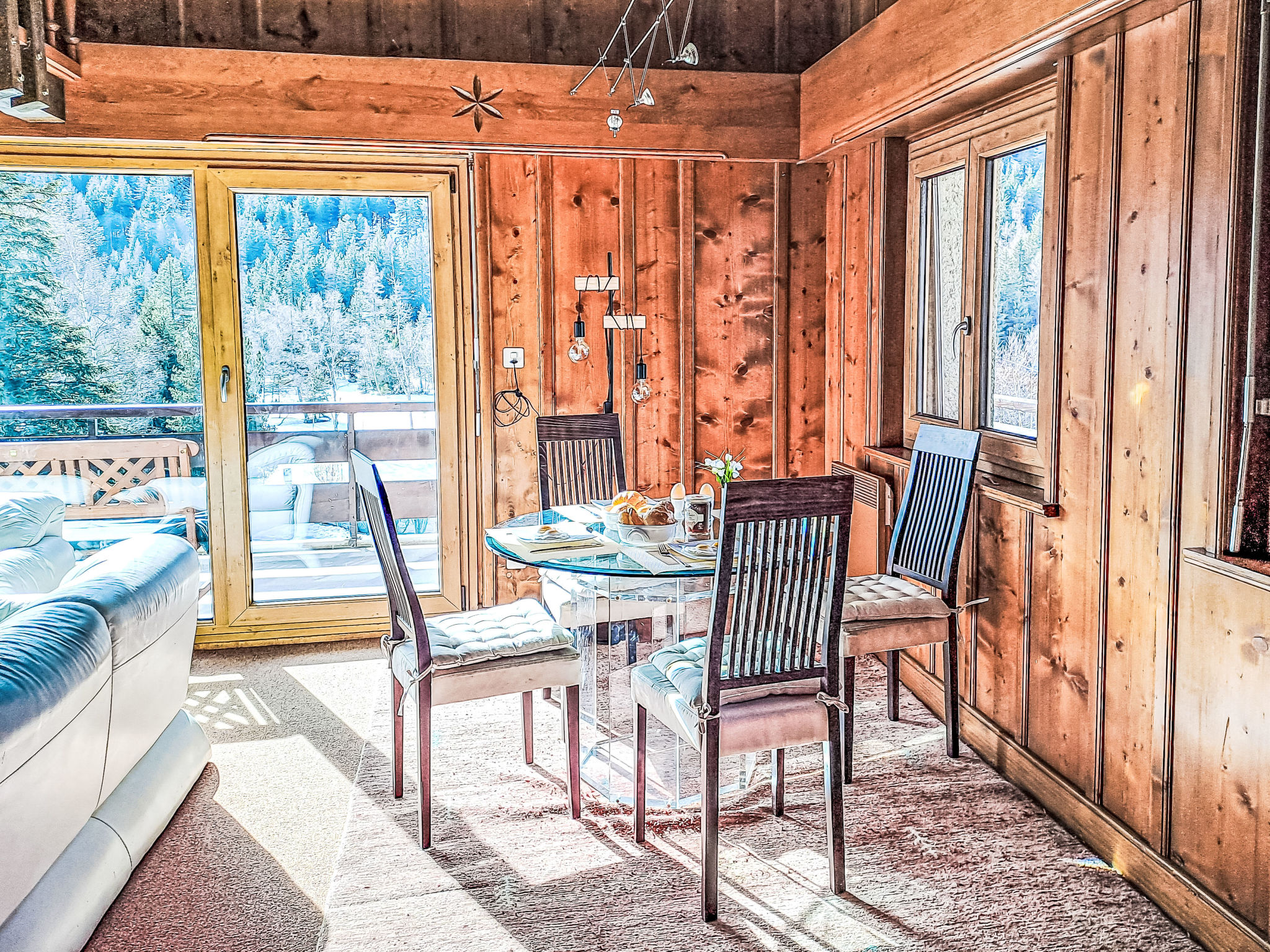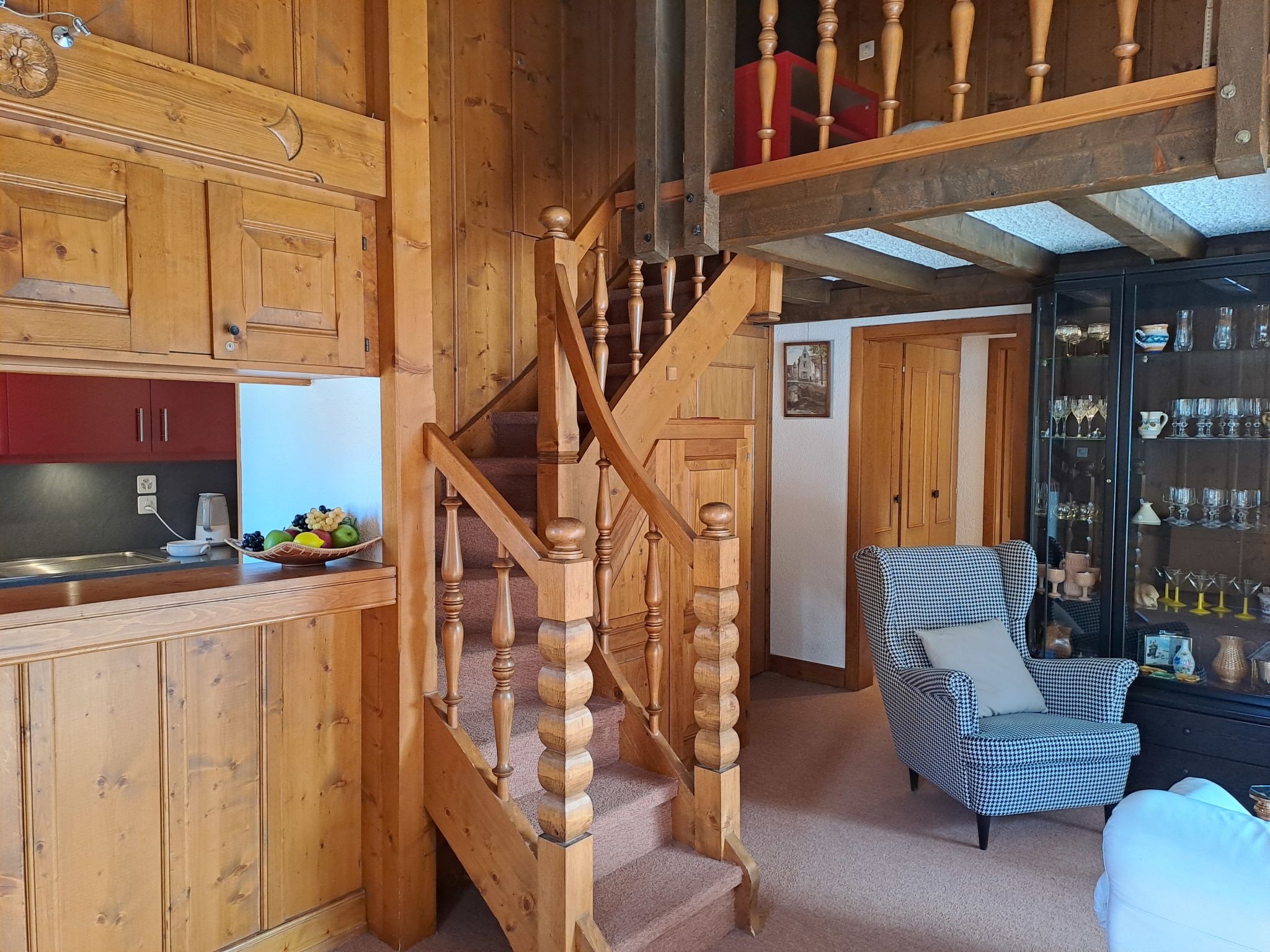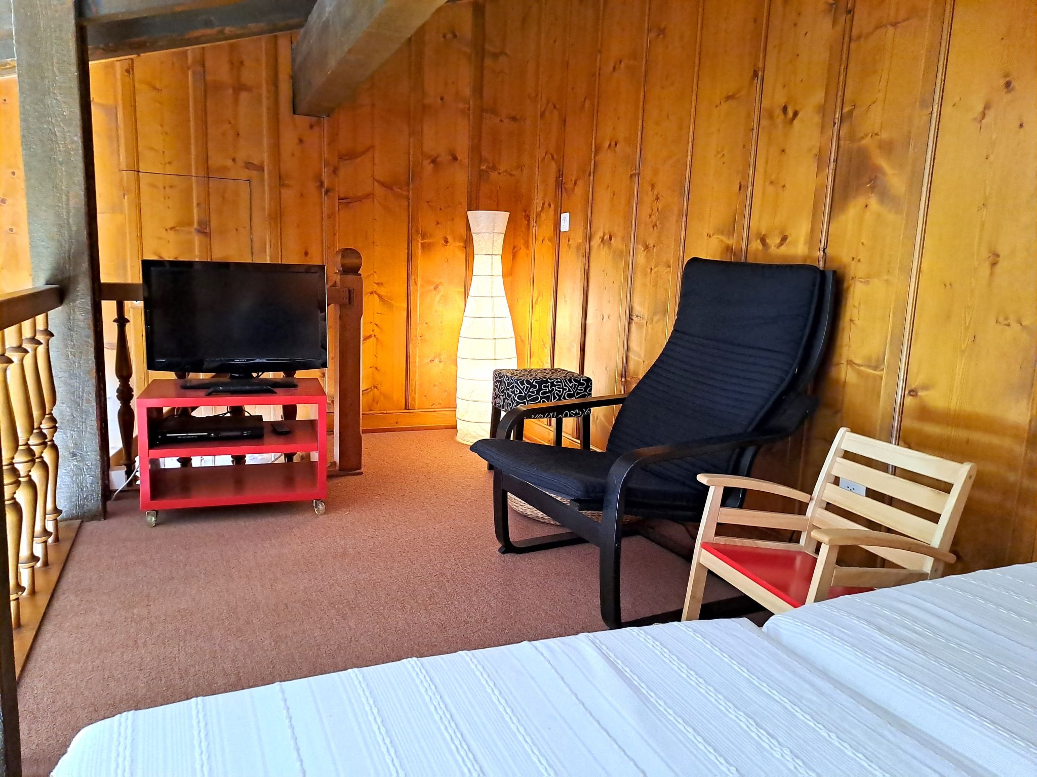 "Sporting 317", 2-room apartment 85 m2 on 3rd floor. Spacious, with sloping ceilings, comfortable and beautiful furnishings: large living/dining room with open-hearth fireplace and TV. Exit to the balcony. 1 large room with 1 bed (180 cm, length 200 cm). Open kitchen (oven, dishwasher, 4 ceramic glass hob hotplates, toaster, kettle, microwave, freezer, electric coffee machine, raclette grill, fondue Set (cheese)). Bath/WC. Electric heating. Upper floor: (spiral staircase) open gallery with sloping ceilings with 2 beds (90 cm, length 190 cm). Carpet. Large terrace. Very beautiful view of the lake and the mountains. Parking at 50 m.