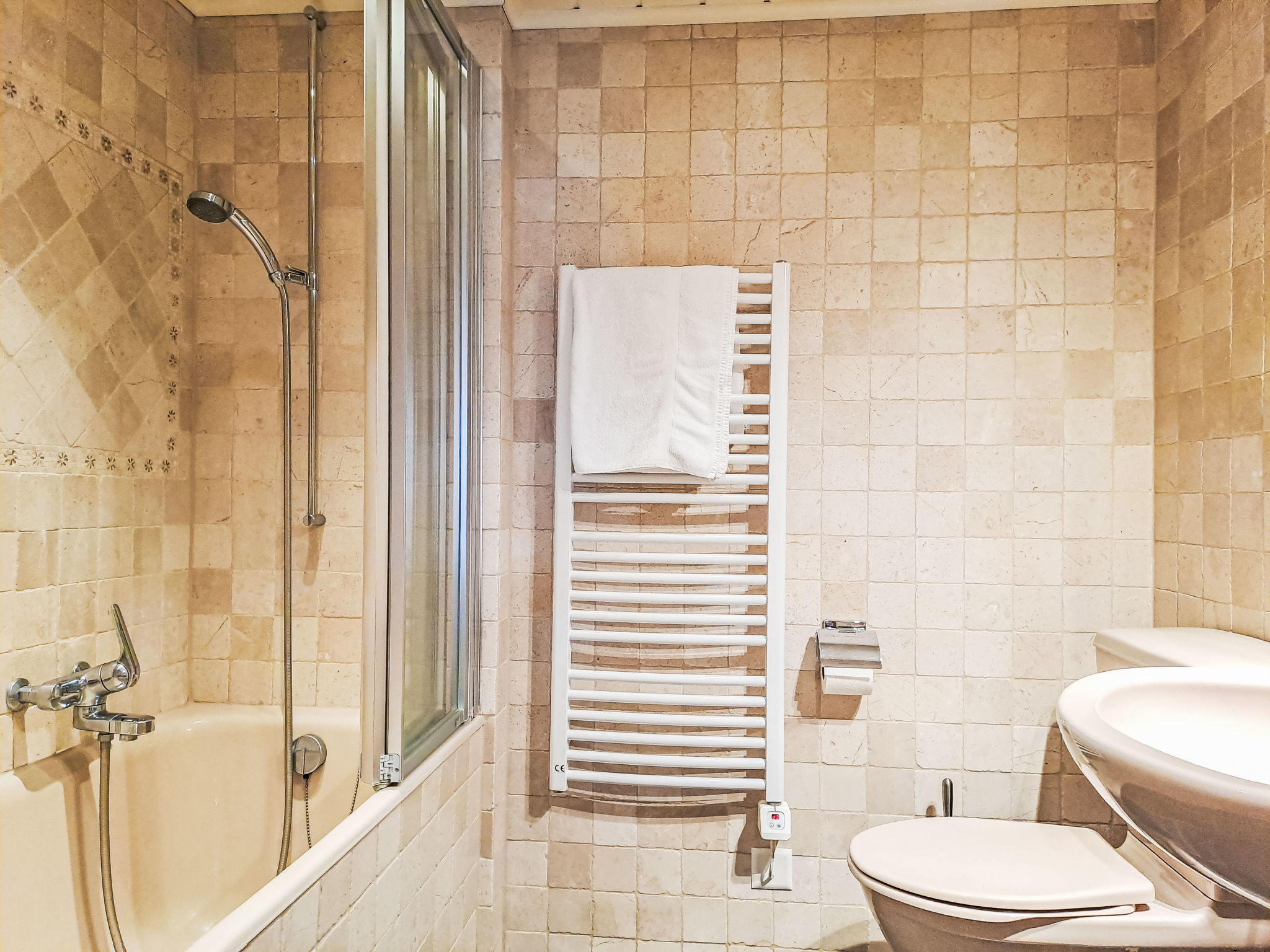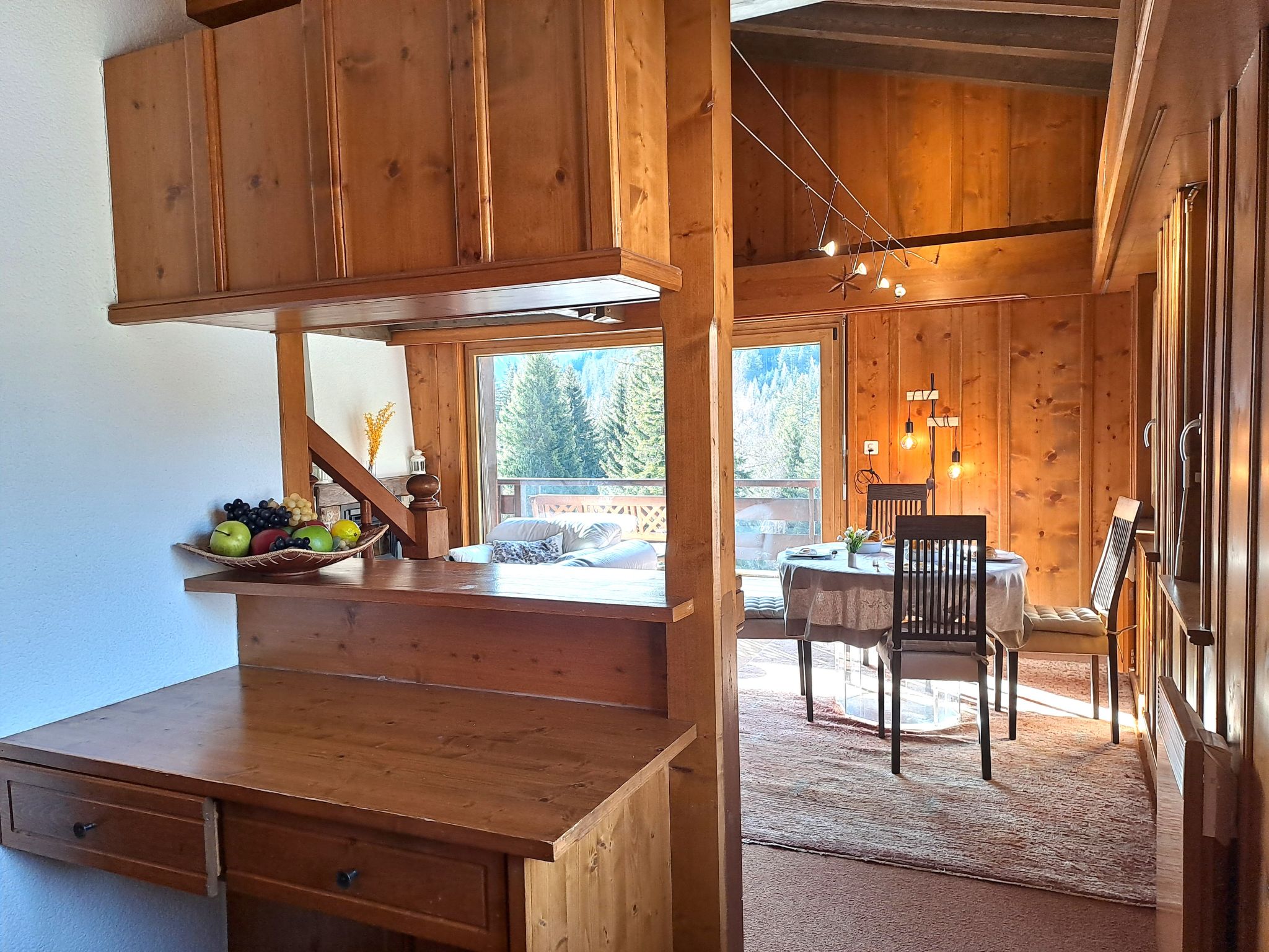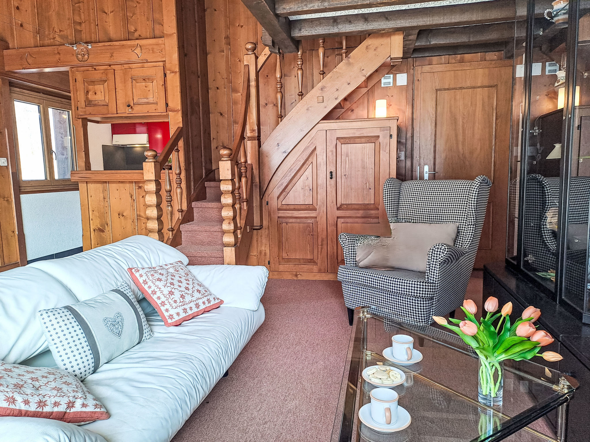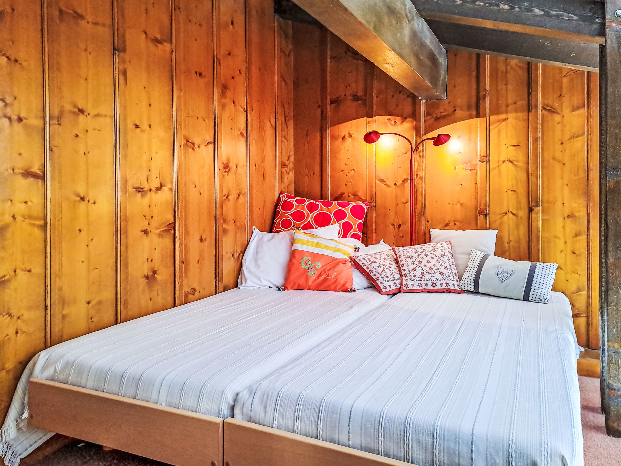 "Sporting 317", 2-room apartment 85 m2 on 3rd floor. Spacious, with sloping ceilings, comfortable and beautiful furnishings: large living/dining room with open-hearth fireplace and TV. Exit to the balcony. 1 large room with 1 bed (180 cm, length 200 cm). Open kitchen (oven, dishwasher, 4 ceramic glass hob hotplates, toaster, kettle, microwave, freezer, electric coffee machine, raclette grill, fondue Set (cheese)). Bath/WC. Electric heating. Upper floor: (spiral staircase) open gallery with sloping ceilings with 2 beds (90 cm, length 190 cm). Carpet. Large terrace. Very beautiful view of the lake and the mountains. Parking at 50 m.