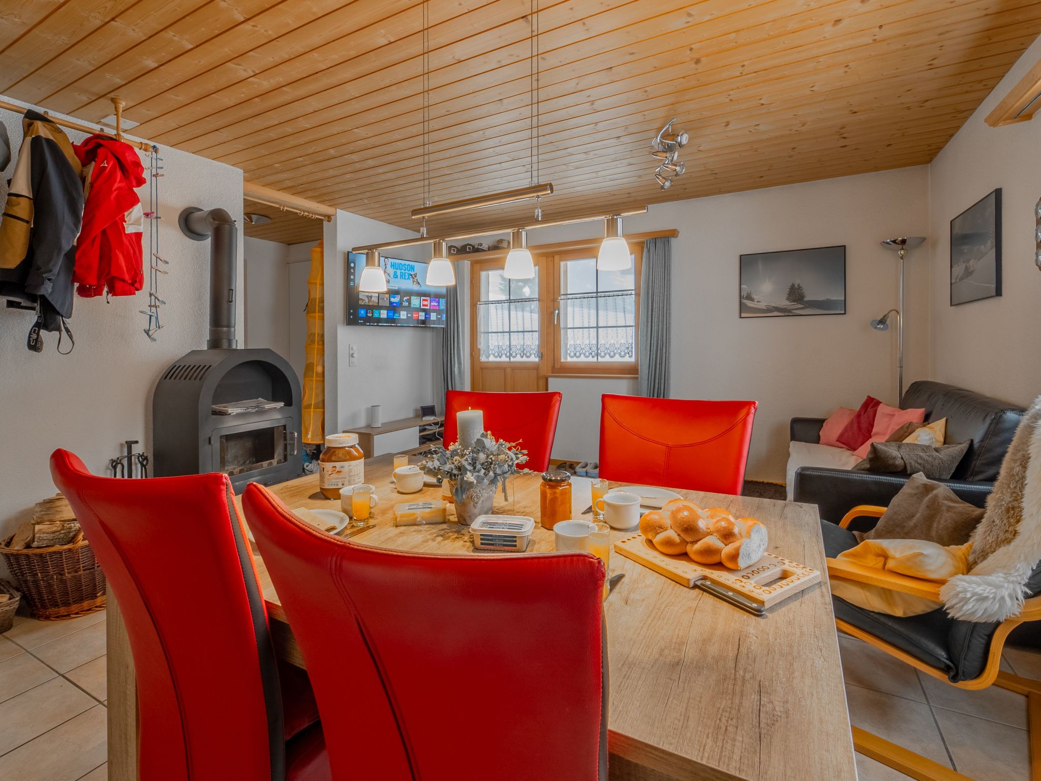 - 1 living room with Swedish stove and TV