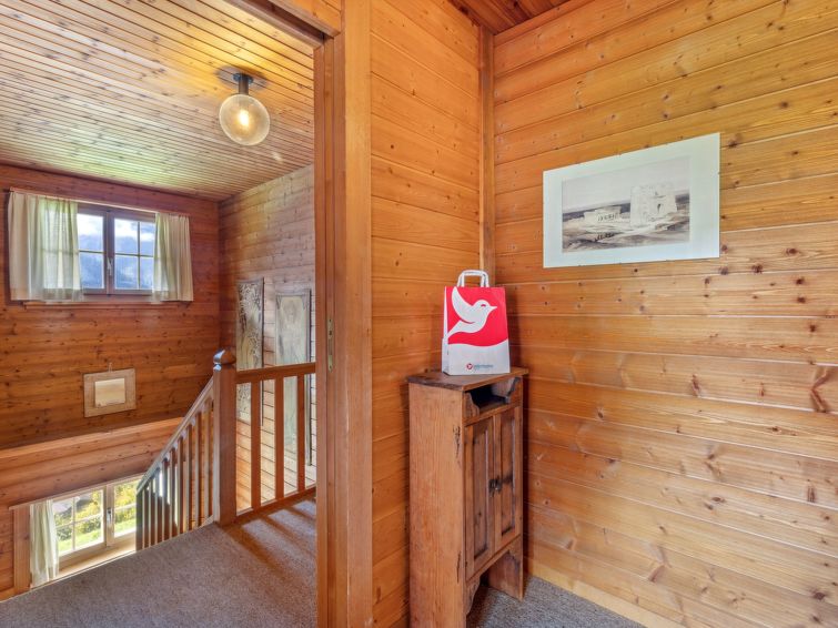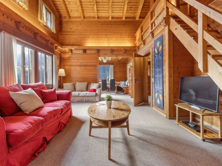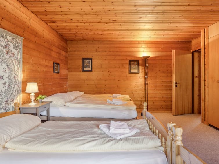 "Arche", 6-room chalet 246 m2 on 3 levels. Spacious, partly with sloping ceilings, rustic and cosy furnishings: 1 room with 1 double bed (1 x 160 cm, length 200 cm), bath/shower/WC. Kitchen-/living room (4 hot plates, oven, dishwasher, toaster, kettle, electric coffee machine, Capsules for coffee machine (Nespresso) extra, fondue Set (cheese)). Upper floor: large dining room with cable TV, radio, CD-player and DVD. 1 room with 1 double bed (180 cm, length 200 cm). 1 room with 4 beds (90 cm, length 200 cm). 2 Baths/showers/WC. Top floor: 1 room with sloping ceilings with 2 beds (90 cm, length 200 cm). Balcony, terrace. Terrace furniture. Marvellous panoramic view of the mountains. Facilities: washing machine, iron, hair dryer. Internet (WiFi, free). Please note: non-smokers only.