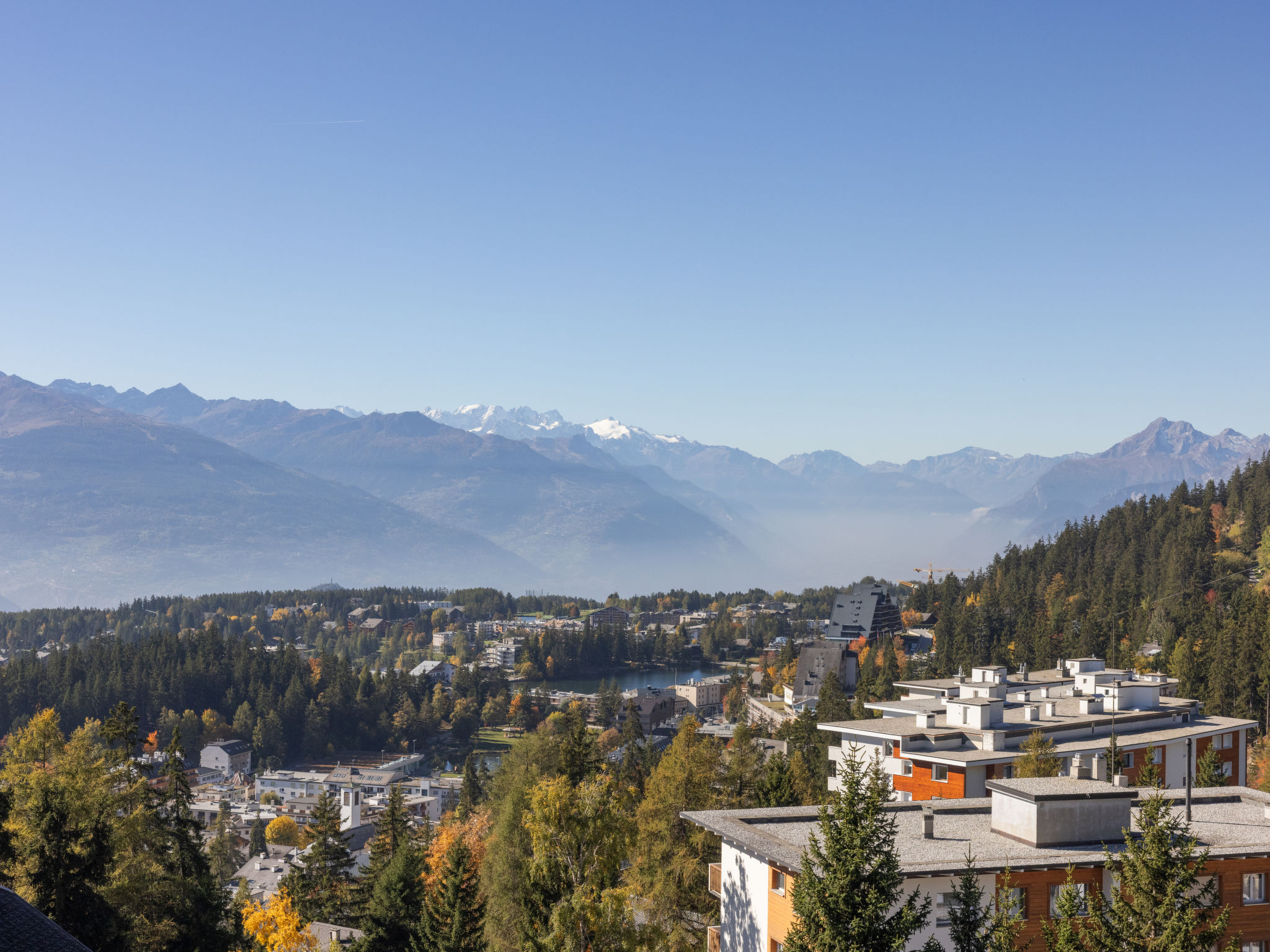 The sauna (16:00-20:00) is not available in low season. Swimming pool closed in November. Large residence "Cransalpin". Above Montana, 1.2 km from the centre of Montana, in a sunny, elevated position, 1.1 km from the lake, 800 m from the skiing area, south-west facing position. For shared use: garden with lawn, indoor pool heated (13 x 8 m, depth 50 - 200 cm, seasonal availability: 01.Dec. - 31.Oct. pool opening hours: 08:00-20:00). Tennis. In the house: sauna, lift, storage room for skis, central heating system, washing machine, tumble dryer (for shared use, extra). Parking (limited number of spaces). Shop 1.2 km, supermarket 1.3 km, restaurant 1 km, bakery 1.4 km, bus stop "Vermala Soleil" 200 m, railway station "Funiculaire Montana Gare" 1.5 km, bathing lake "Moubra" 2.2 km, lake Grenon 1.1 km. Golf course (18 hole) 2.3 km, skisport facilities 800 m, ice rink 1.4 km. Please note: ski bus (free of charge). Additional accommodations can be booked.