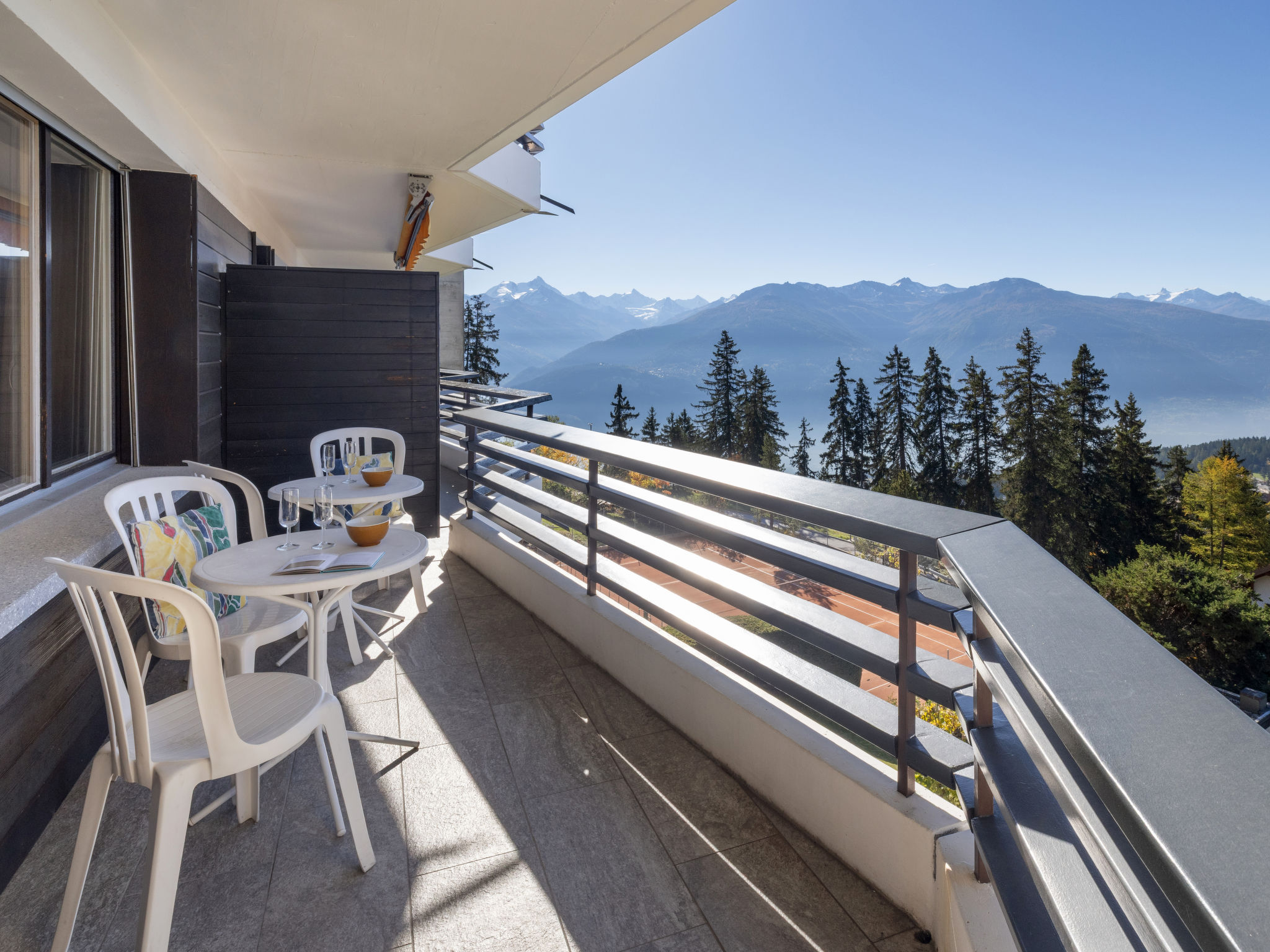 "Cransalpin Apt. 11 / Secteur 1", 4-room apartment 76 m2 on 4th floor. Beautiful and cosy furnishings: living/dining room with cable TV (flat screen), DVD. 1 room with 2 beds (90 cm, length 200 cm). 1 children's room with 1 x 2 bunk beds (90 cm, length 190 cm). 1 room with 1 french bed (180 cm, length 200 cm). Kitchen (4 hot plates, oven, dishwasher, toaster, kettle, microwave, electric coffee machine, Capsules for coffee machine (NESPRESSO) extra, raclette grill, fondue Set (cheese)). Bath/WC, shower, sep. WC. 3 balconies 30 m2, south facing position and west facing position, north facing position. Terrace furniture. Very beautiful view of the mountains, the valley and the resort. Facilities: iron, hair dryer. Internet (WiFi, free). Please note: non-smokers only.