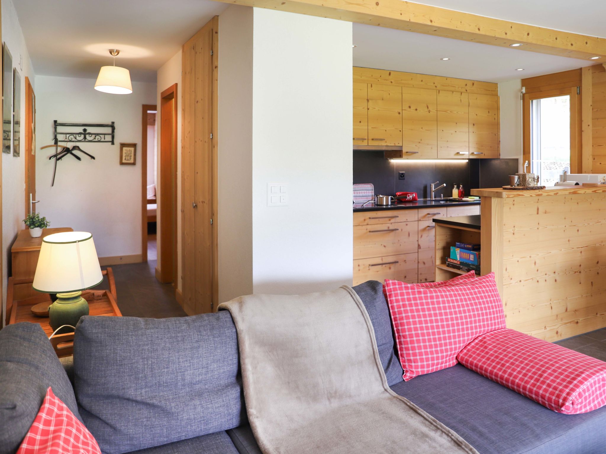 "Diamant 6", 3-room apartment 62 m2, on the ground floor, south facing position. Partly renovated in 2018, comfortable and beautiful furnishings: living/dining room with dining table and TV (flat screen). Exit to the garden, south facing position. 1 children's room with 1 x 2 bunk beds (90 cm). 1 room with 1 french bed (1 x 160 cm). Open kitchen (oven, dishwasher, 4 ceramic glass hob hotplates, toaster, kettle, microwave, freezer, electric coffee machine, Capsules for coffee machine (Nespresso) extra, raclette grill, fondue Set (cheese)) with bar. Bath/WC, sep. WC, double hand-basin. Terrace. Balcony furniture. Partial view of the mountains. Facilities: hair dryer. Internet (WiFi, free). Parking space n 19. Please note: non-smokers only. Maximum 1 pet/ dog allowed.