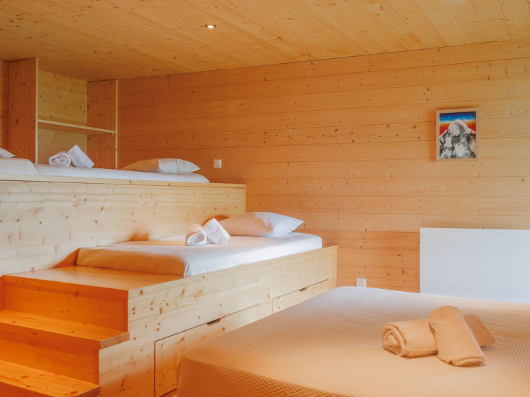 "Woovim 14", 6-room chalet 250 m2. Luxurious and wooden furniture furnishings: large living/dining room with panoramic window north facing position with Scandinavian wood stove, cable TV and DVD. Exit to the terrace. 1 large room with 1 french bed (180 cm, length 200 cm). Open kitchen (oven, dishwasher, 4 induction hot plates, toaster, kettle, microwave, electric coffee machine, Capsules for coffee machine (nespresso) extra, raclette grill, fondue Set (cheese)) with bar. Shower/WC. Heating. On the lower ground floor: 1 large room with 1 french bed (160 cm, length 200 cm), cable TV. 1 large room 28 m2 with 3 beds (80 cm, length 190 cm), 1 french bed (160 cm, length 200 cm), cable TV. Shower, sep. WC, bath/shower/WC, double hand-basin, Sauna. Upper floor: 1 room with 2 x 2 bunk beds (90 cm, length 190 cm), shower, double hand-basin and cable TV. 1 room with 1 french bed (160 cm, length 200 cm), shower and double hand-basin. Sep. WC. Terrace 80 m2, north facing position and west facing position. Terrace furniture. Very beautiful panoramic view of the mountains and the valley. Facilities: sauna, children's high chair, baby cot for up to 2 year olds, hair dryer. Internet (WiFi, free). Parking (3 cars), garage, height 200 cm, width 220 cm. Please note: non-smokers only.