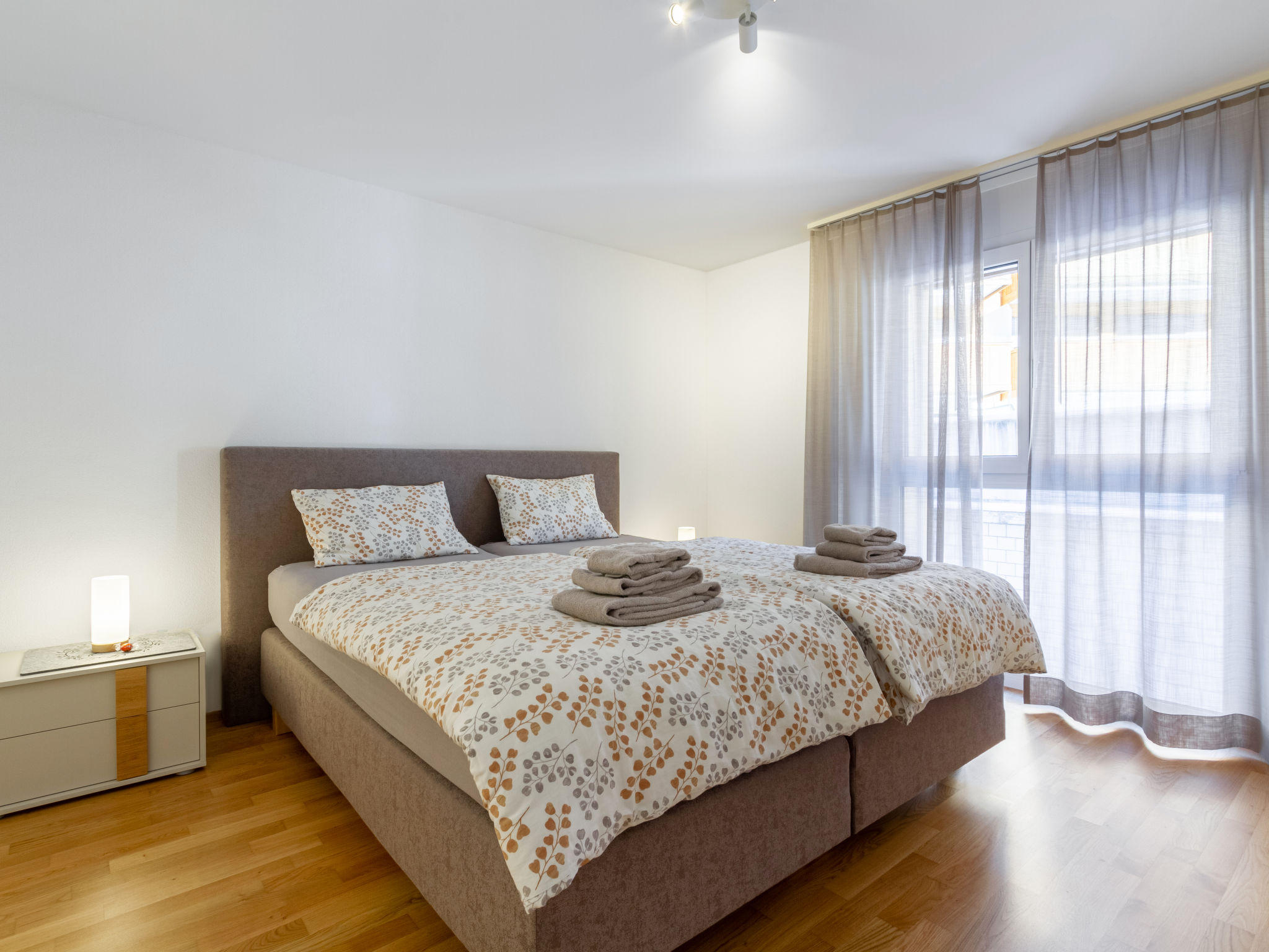 "Verena", 3-room apartment 68 m2 on 1st floor, south facing position. Spacious and bright, very modern and cosy furnishings: open living/dining room with dining table and cable TV (flat screen). Exit to the balcony. 1 large room with 1 double bed (2 x 90 cm, length 210 cm). 1 small room with 2 beds (90 cm, length 200 cm). Exit to the balcony. Open kitchen (oven, dishwasher, 4 ceramic glass hob hotplates, toaster, kettle, electric coffee machine, Capsules for coffee machine (Nespresso) extra, steamer, raclette grill, fondue Set (cheese)). Shower/WC. Underfloor heating. Large balcony, south facing position. Balcony furniture. Marvellous panoramic view of the mountains and the countryside. Facilities: children's high chair, hair dryer. Internet (WiFi, free). Parking (roofed). Please note: non-smokers only.