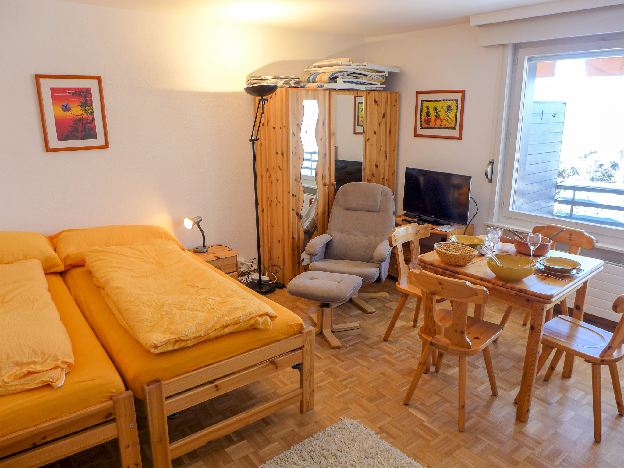 "Cransalpin Apt. 3 / Secteur 1", 1-room apartment 25 m2 on 1st floor. Living room with 1 pull-out bed (2 pers. 2 x 90 cm, length 200 cm), cable TV and flat screen. Kitchen (2 hot plates, toaster, kettle, microwave, electric coffee machine, Capsules for coffee machine (Nespresso) extra, fondue Set (cheese)). Bath/WC. Balcony 7 m2, south facing position and west facing position. Terrace furniture. Beautiful view of the mountains, the valley and the resort. Facilities: iron, hair dryer. Internet (WiFi, free). Please note: non-smokers only.