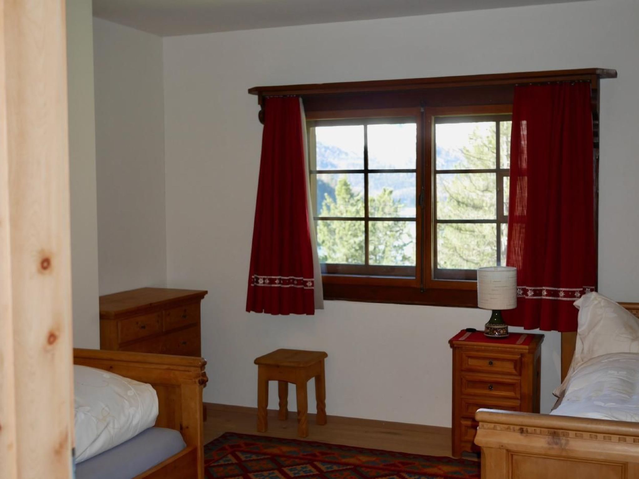 Many small details tell the story of the house, its builder and its guests. The house has been owned by the Bindschedler family since 1946 and is used by them as a holiday home and family meeting place. The Chesa Bindschedler stands a little above the village of Champfèr in the middle of the light mountain forest. The view of the Upper Engadine lake landscape is enchanting, the garden with its own barbecue area is available to all guests. The house combines 2 holiday apartments with separate entrances under one roof. The apartments are furnished with a lot of love and are carefully looked after. Most of the furnishings are made of solid Swiss stone pine. The "upper" apartment offers space for 4 people. It consists of two double bedrooms, living room, open kitchen, bathroom (shower), separate toilet and a small balcony. The apartment is on two floors.