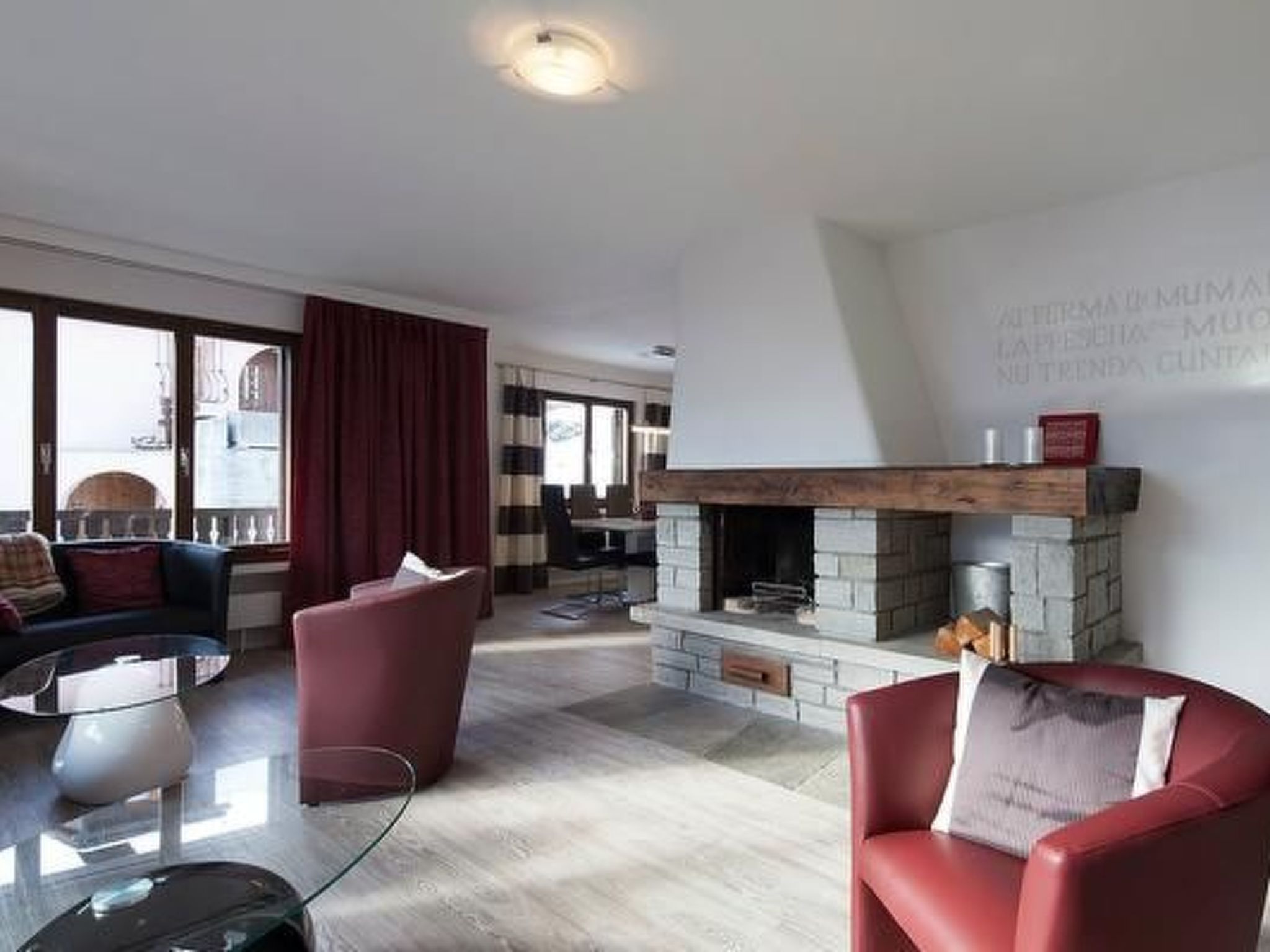 Inside, the flat welcomes you with modern furnishings that leave nothing to be desired: Comfortable leather furniture in black and bordeaux, plenty of cushions and blankets for hours of relaxation, large windows offering views of the impressive surroundings and an open granite fireplace for cosy evenings. The fully equipped kitchen includes high-quality appliances such as a Nespresso machine, dishwasher and microwave as well as a fondue and raclette set. The living area delights with entertainment electronics such as a large TV including Blueray/DVD player, free WiFi and a selection of films and games.