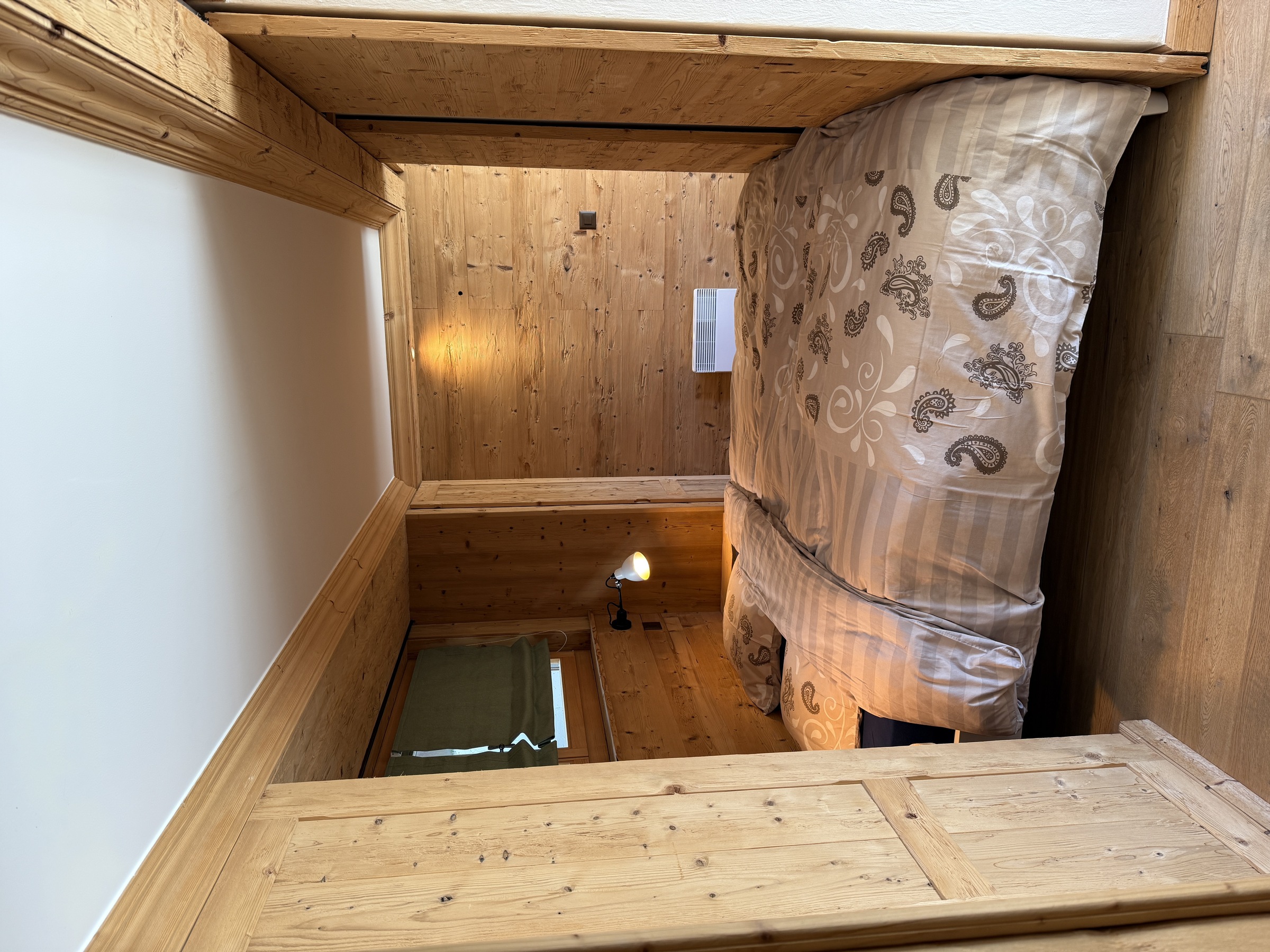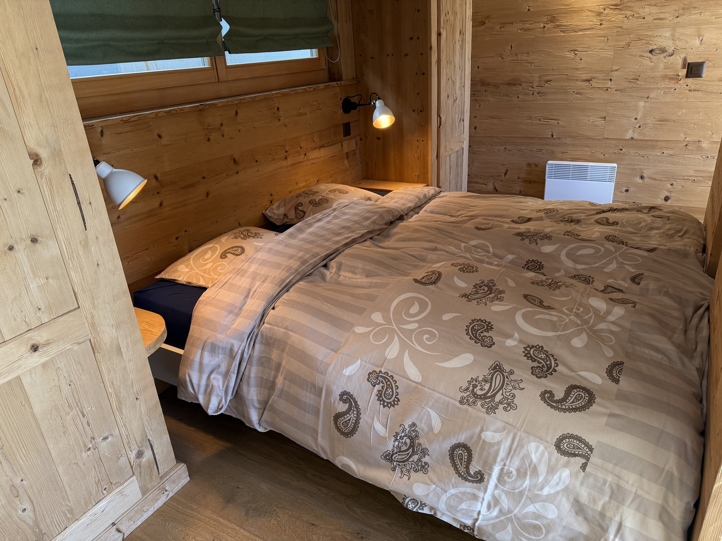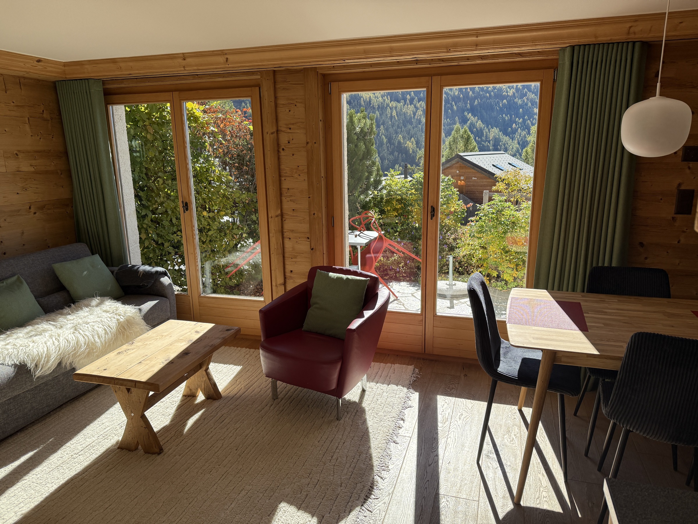 Magnificent luxury apartment measuring 48 m² for 2 people. Spacious 1.5 room apartment on the ground floor of the Les Elfines chalet, located on Impasse des Raccards in Chandolin. Ideal apartment for a couple looking for peace and comfort. Beautiful view from the terrace. 1 outdoor parking space. Entrance hall, fully equipped kitchen with ceramic hob, dishwasher and refrigerator. Beautiful dining room, living room with TV (Bluewin TV and internet), Scandinavian stove (wood not provided, but available for purchase at the village supermarket) and access to the terrace. Bathroom with shower, toilet and washbasin. Bedroom with double bed separated from the living room by sliding wooden doors. Possibility of storing equipment and supplies in the garage (the car must be parked in the outdoor parking space only).