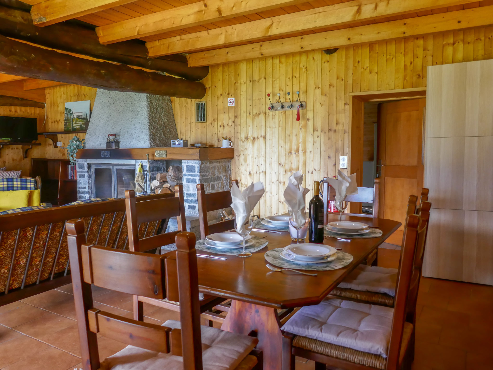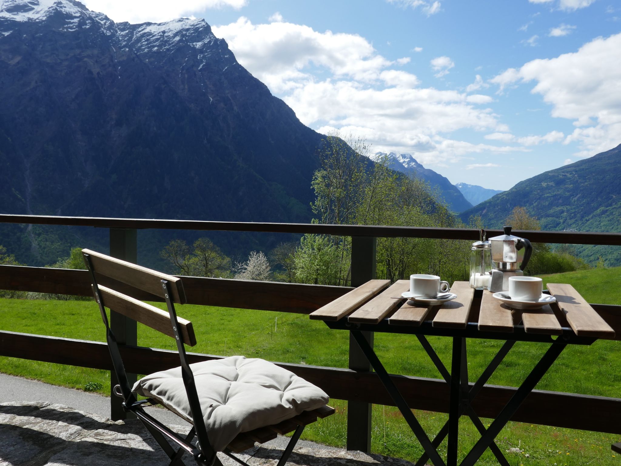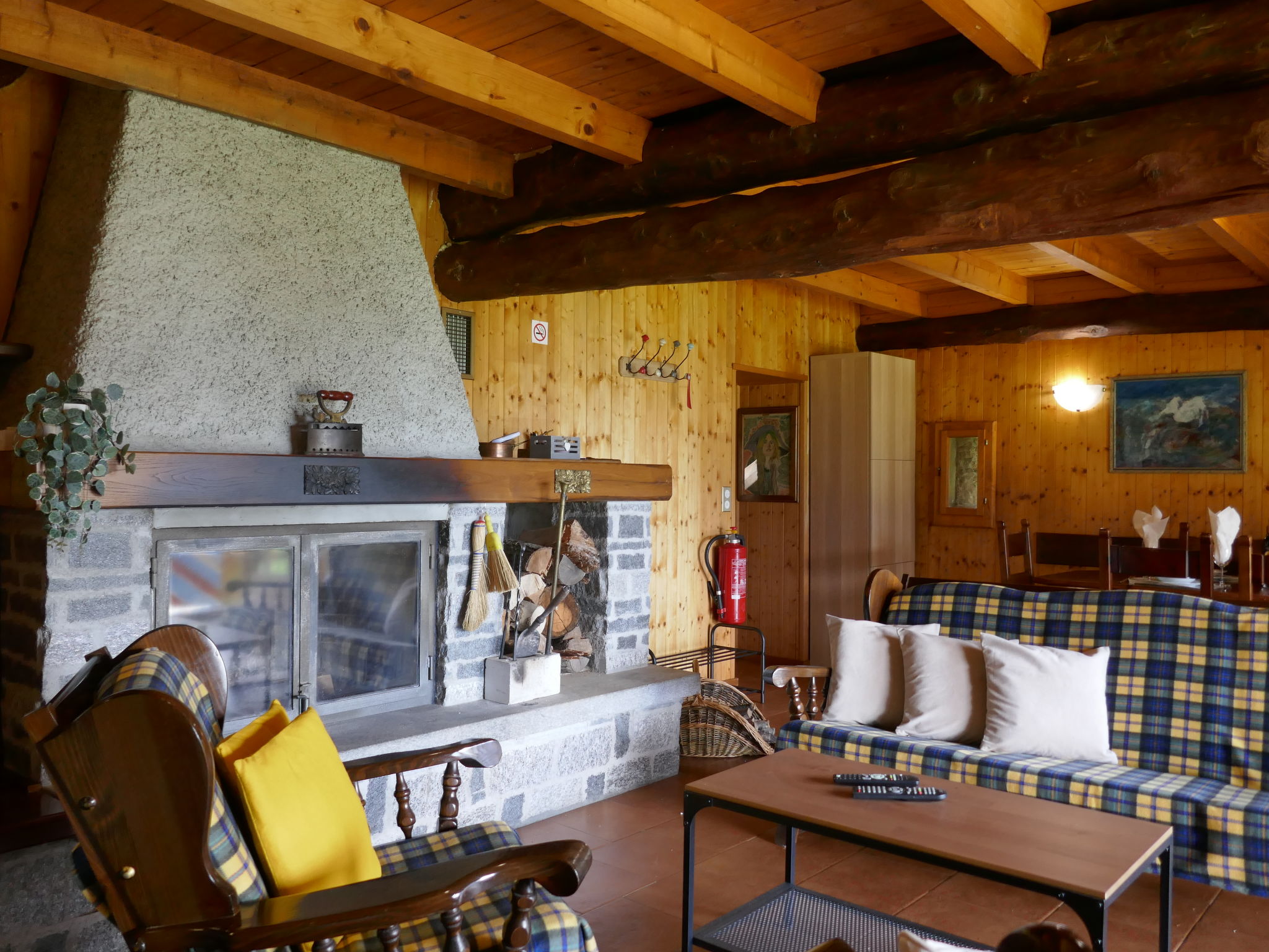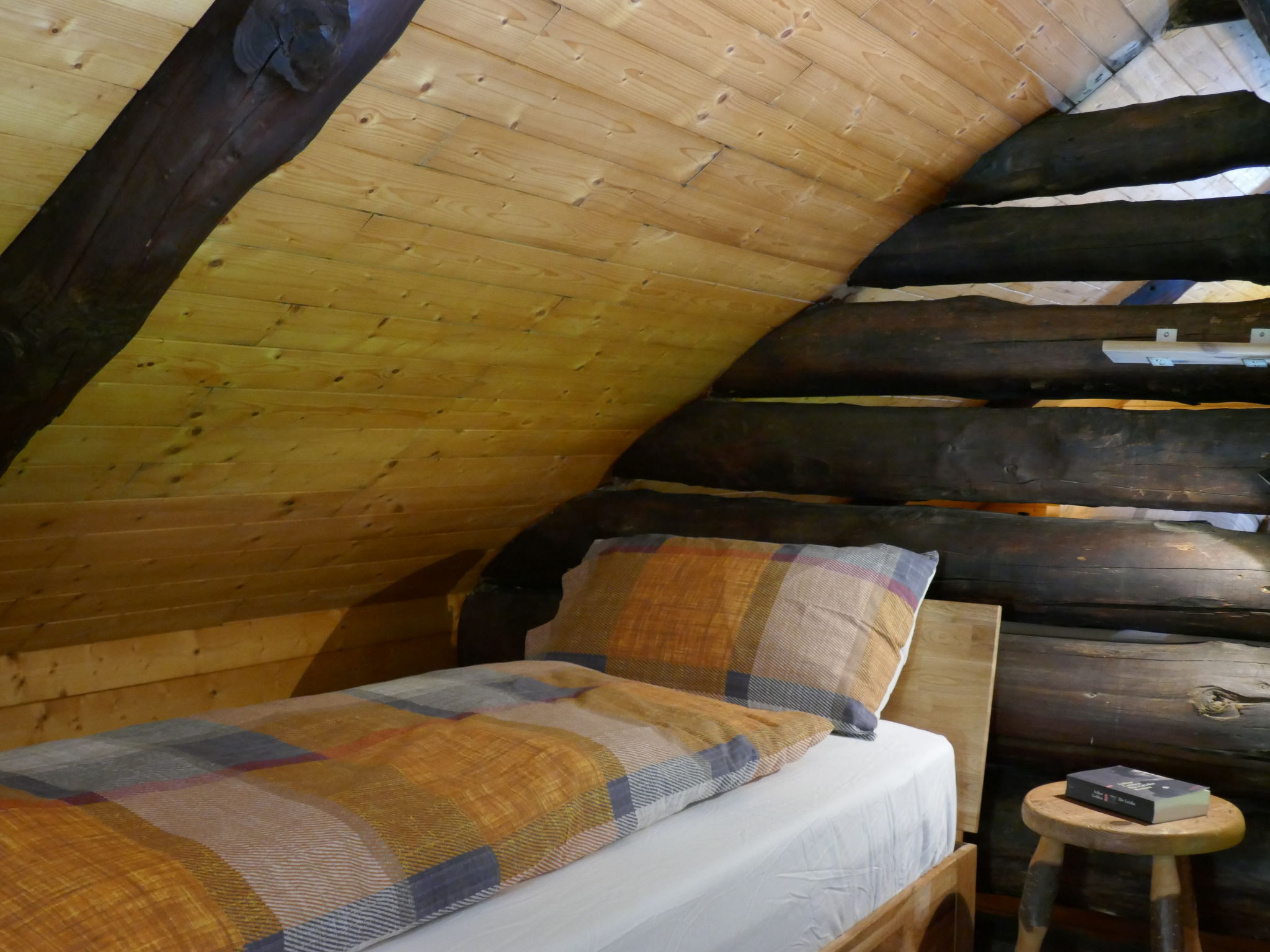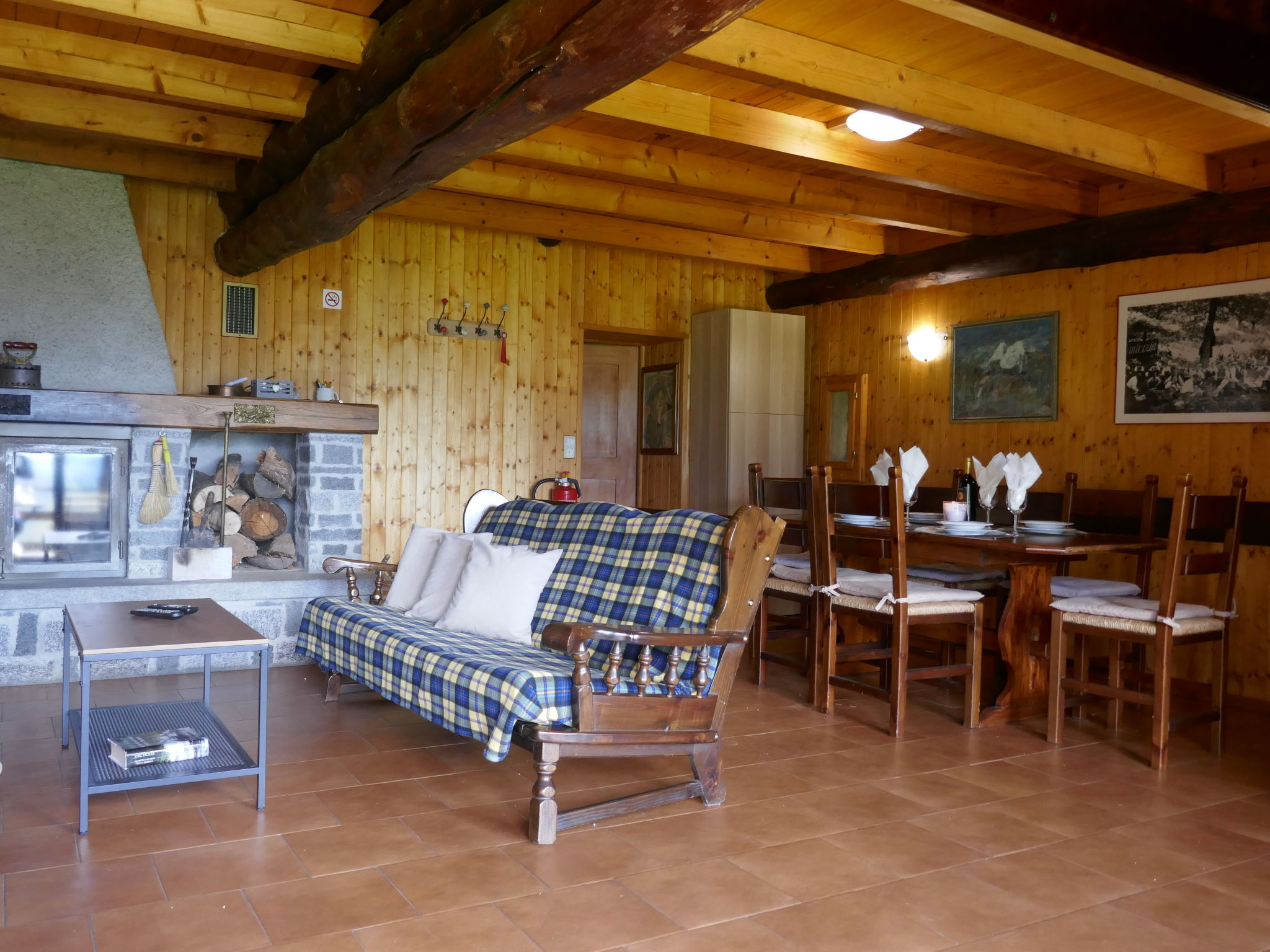 "Sosto", 2-room cottage 60 m2 on 2 levels, south facing position. Partly with sloping ceilings, rustic and cosy furnishings: open living/dining room with 1 bed (90 cm, length 200 cm), open-hearth fireplace, dining table and satellite TV. With sloping ceilings kitchen (oven, Gas stove, 4 gas rings, freezer, fondue Set (cheese)) with wood-burning stove. Shower/WC. Wood heating. Solar power. Upper floor: open mezzanine with sloping ceilings with 1 bed (90 cm, length 200 cm), 1 double bed (2 x 80 cm, length 200 cm). Comfortable furnishings in the country house style. Terrace furniture, barbecue (portable), deck chairs (2). Very beautiful panoramic view of the mountains, the valley and the countryside. Facilities: children's high chair, baby cot for up to 2 year olds (extra). Internet (WiFi, extra). Please note: suitable for families. Non-smoking house. Maximum 2 pets/ dogs allowed. Fire extinguisher. NL-00006645
