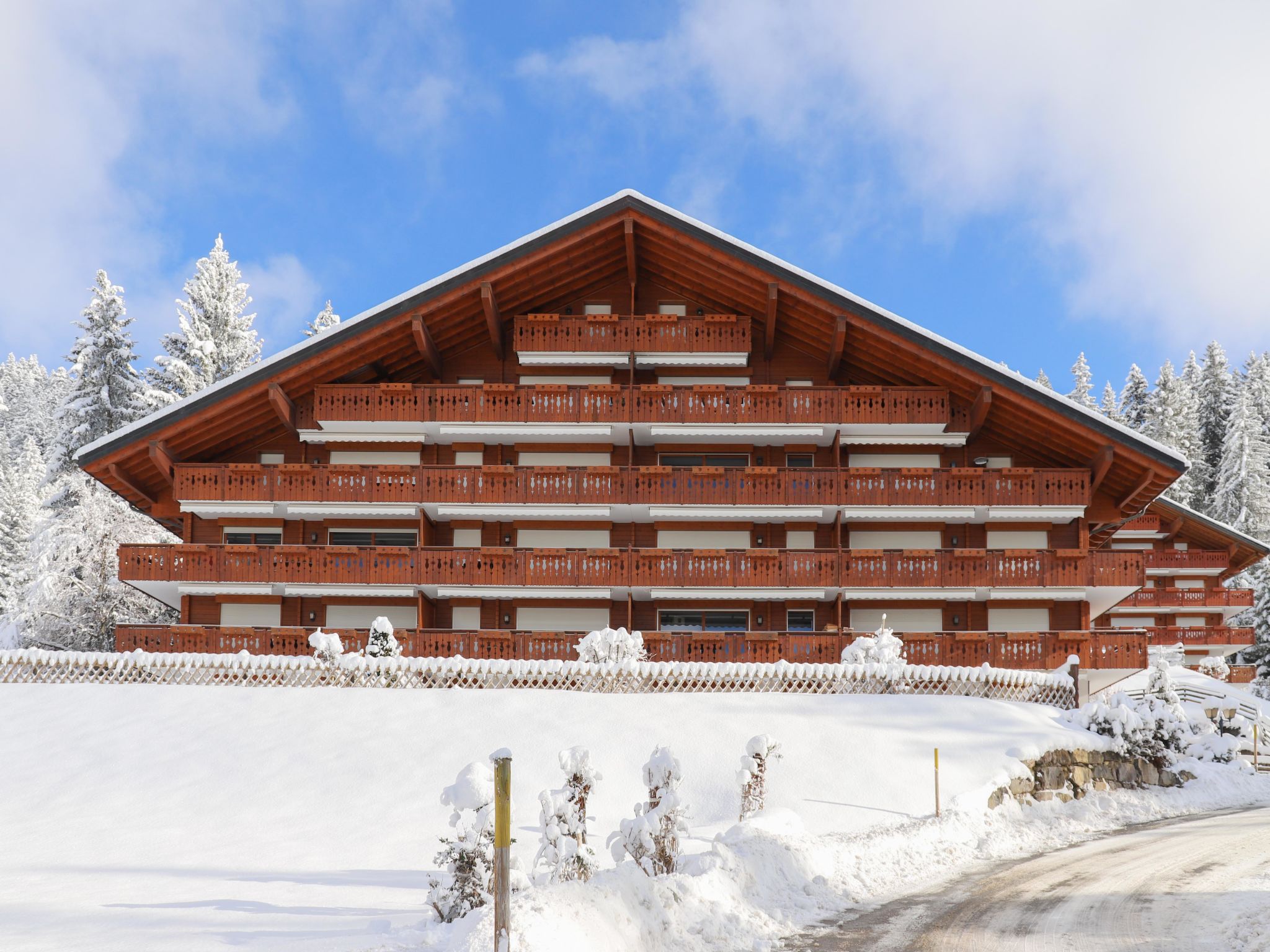Domaine Rochegrise: Very beautiful residence "Rhodonite", 4 storeys. Above Villars, in the district of Roches Grises, located by a road, south-east facing position. In the house: storage room for skis, central heating system, washing machine (extra), tumble dryer (for shared use, extra). Room cleaning weekly on request (extra). Motor access to the house. In Winter: please take snow chains. Communal covered parking. Dimension: height 215 cm width 400 cm. Shop 1.5 km, grocery 1.4 km, restaurant 1.4 km, bakery 1.5 km, 17 minute walk to the centre, bus stop 1.8 km, railway station "Roches Grises" 250 m, indoor swimming pool 1.7 km, thermal baths "Lavey-les-bains" 19 km. Golf course (18 hole) 7 km, indoor tennis centre 800 m, sports centre 800 m, mountain railway 250 m, gondola lift 1.5 km, ski bus stop 1.8 km, children's ski school 800 m, ice rink 1.7 km, children's playground 1.9 km. Please note: lift to 3rd floor. Free ski bus service to the ski region Villars. Please note: Additional accommodations can be booked.