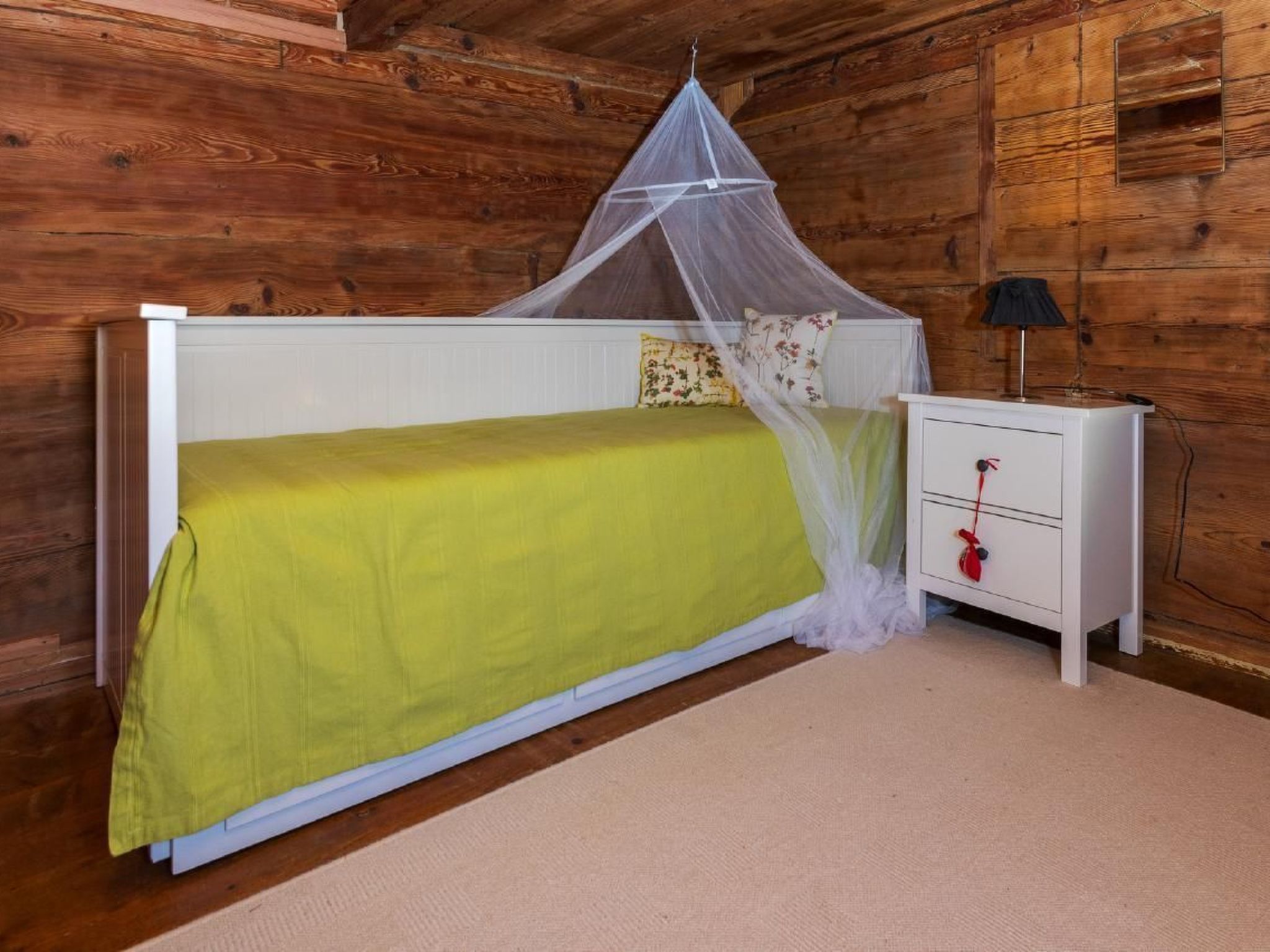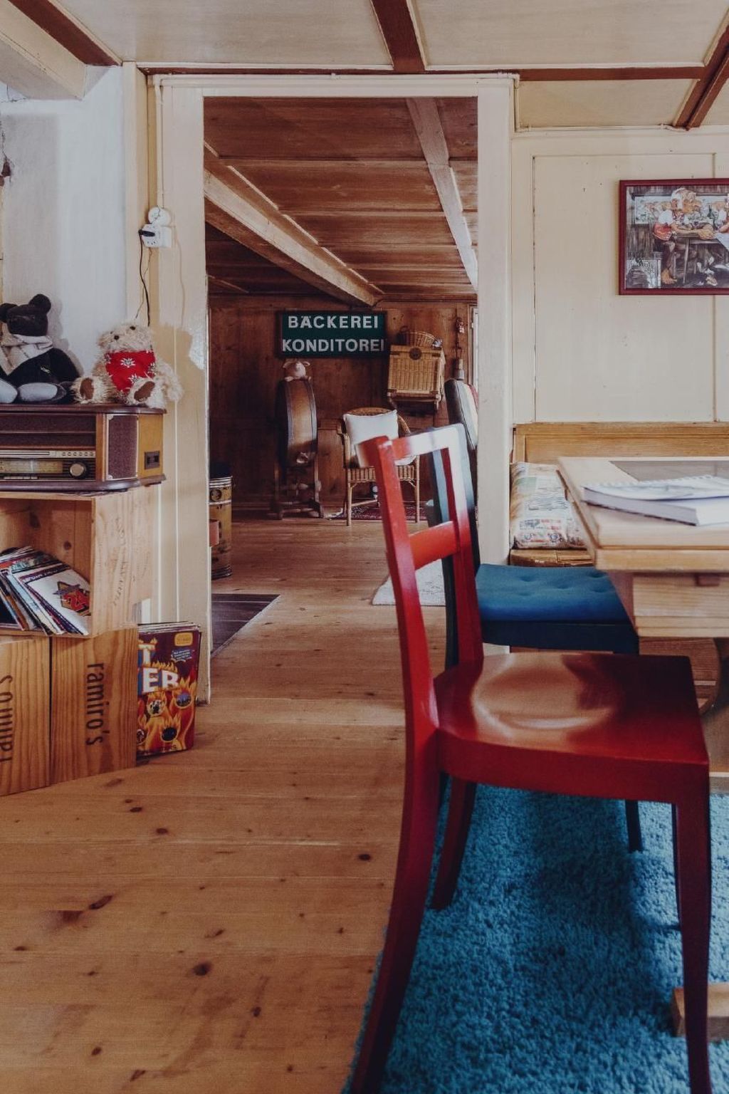 Inside, a fascinating blend of tradition and comfort awaits you. Due to the listed architecture, the ceilings are between 1.80 and 1.90 metres high - sometimes even higher, which gives each room a special atmosphere. For music lovers, there is a record player with a diverse selection of records that will take you back to different musical eras. The nostalgic charm of the house is rounded off by the original 'T'schüttelikasten' (an old shop) and a colourful play box for children.