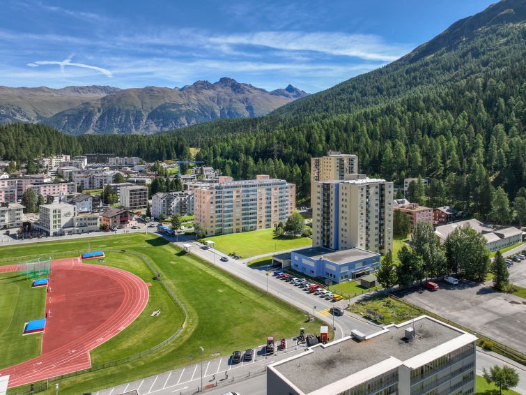 St. Moritz-Bad: Very large apartment house "Chesa Ova Cotschna", 9 storeys, renovated in 2011. In the resort 350 m from the centre of St.Moritz-Bad, in a quiet, sunny position, 300 m from the lake, 900 m from the skiing area. In the house: lift, storage room for bicycles, storage room for skis, central heating system. Shop 350 m, supermarket 800 m, restaurant 50 m, bar 350 m, bakery 600 m, café 350 m, bicycle rental 350 m, bus stop "St. Moritz Bad, Sonne" 50 m, railway station "St. Moritz" 2 km, indoor swimming pool 400 m, thermal baths "Heilbadzentrum St. Moritz", lake St. Moritzer See 300 m. Golf course (18 hole) 7.3 km, surf school 5.3 km, tennis 1 km, indoor tennis centre 1 km, minigolf 400 m, riding stable 2.8 km, walking paths from the house, cycle lane 200 m, cable car 900 m, ski lift, slopes 900 m, ski rental 350 m, ski bus stop 50 m, ski school 2 km, children's ski school 2 km, sled run 5.7 km, cross country ski track 100 m, ice rink 450 m, children's playground 500 m. Nearby attractions: Segantini Museum 2.2 km, Engadiner Museum 1.2 km, Mili Weber-Haus 2.9 km, Olympia Bob Run mit Museum 2.6 km, Nietzsche Museum in Sils-Maria 9.5 km. Well-known ski regions can easily be reached: Corviglia Piz Nair 900 m, Corvatsch - Furtschellas 6.5 km, Diavolezza - Lagalb 20 km. Well-known lakes can easily be reached: St.Moritzer See 300 m, Silvaplaner See 5.2 km, Silser See 9.5 km. Hiking paths: Stazerwald & Stazersee, Corviglia Piz Nair, Muottas Muragl. Please note: the keys‘ handover takes place by the agency Interhome in St. Moritz Bad. Additional accommodations can be booked.