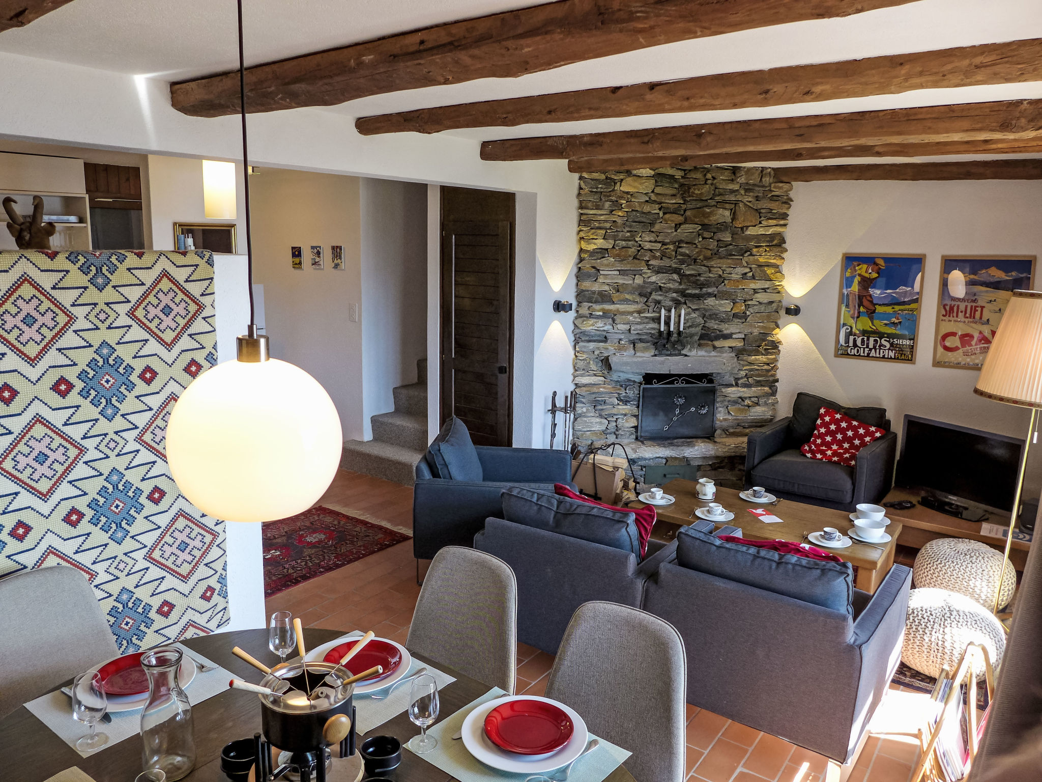 "Sans Nom", 5-room semi-detached house 120 m2 on 3 levels, south facing position. Object suitable for 4 adults + 2 children. Partly renovated in 2024, comfortable and beautiful furnishings: small living/dining room with open-hearth fireplace, cable TV, radio and CD-player. Exit to the terrace. Open kitchen (oven, dishwasher, 4 ceramic glass hob hotplates, toaster, kettle, microwave, freezer, electric coffee machine, Capsules for coffee machine (Nespresso) extra, raclette grill, fondue Set (chinoise, cheese)). Upper floor: 1 large room with 1 double bed (2 x 90 cm, length 200 cm). Exit to the balcony. 1 room with 1 bed (90 cm, length 190 cm). Bath/WC, sep. WC. 2nd upper floor: 1 room with sloping ceilings with 2 beds (90 cm, length 200 cm). 1 children's room with sloping ceilings with 1 bed (90 cm, length 190 cm). Shower/WC. Balcony 15 m2, south facing position and, east facing position, terrace 20 m2, south facing position. Terrace furniture, balcony furniture, barbecue (portable), deck chairs (1). Beautiful view of the mountains, the valley and the forest. Facilities: washing machine, iron, children's high chair, baby cot for up to 2 year olds, hair dryer. Internet (WiFi, free). Garage (1 car), height 195 cm, width 220 cm. Please note: non-smoking house. 1 small pet/ dog allowed.