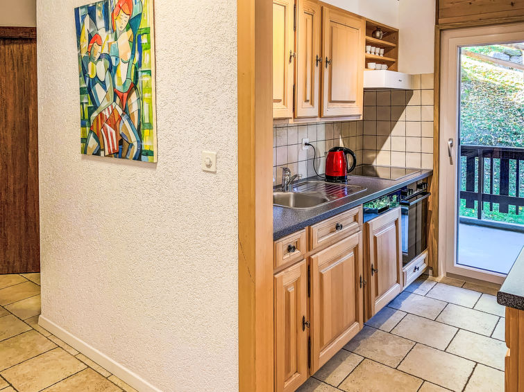 "Eden Roc 53", 3-room apartment 73 m2 on 1st floor. Modern and tasteful furnishings: living/dining room with Scandinavian wood stove, cable TV, hi-fi system and DVD. Exit to the balcony. 1 room with 1 double bed (140 cm, length 200 cm). 1 room with 2 beds (90 cm, length 200 cm). Exit to the terrace. Kitchen (oven, dishwasher, 4 ceramic glass hob hotplates, toaster, kettle, microwave, electric coffee machine, Capsules for coffee machine (Nespresso) extra, raclette grill, fondue Set (chinoise, cheese)). Bath/WC, shower/WC. Balcony, north facing position and west facing position, terrace 27 m2, south facing position. Terrace furniture, barbecue (portable). Side view of the mountains. Facilities: children's high chair, baby cot, hair dryer. Internet (WiFi, free). Please note: non-smokers only.