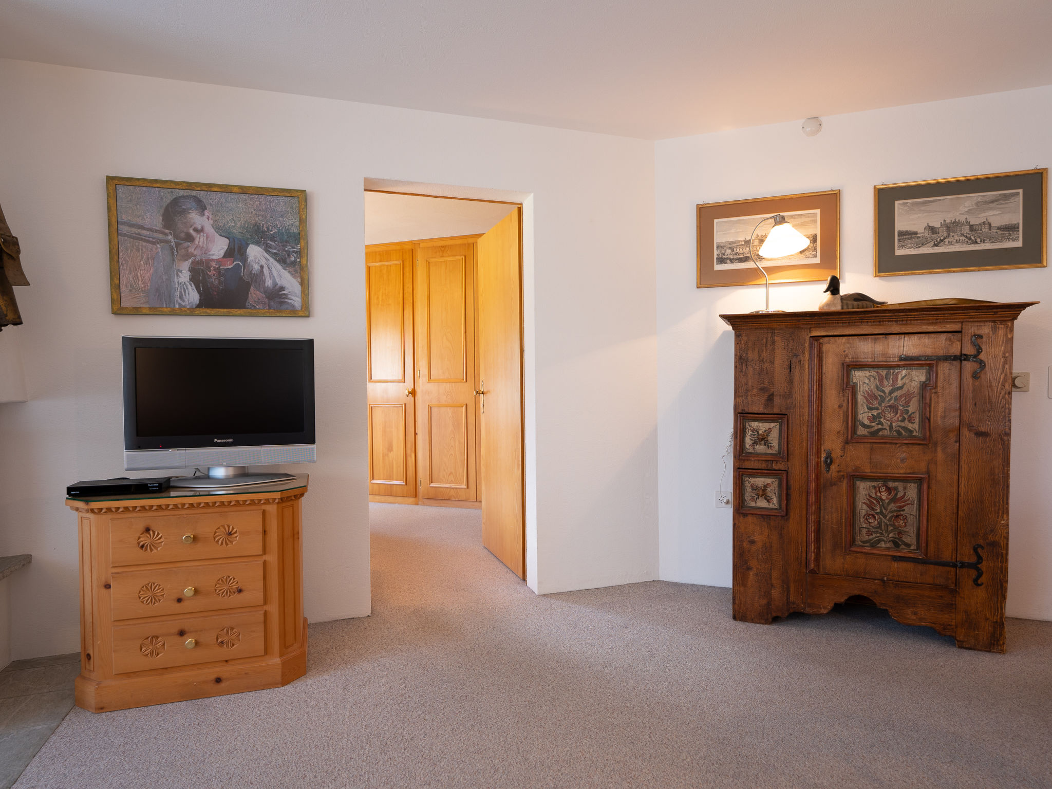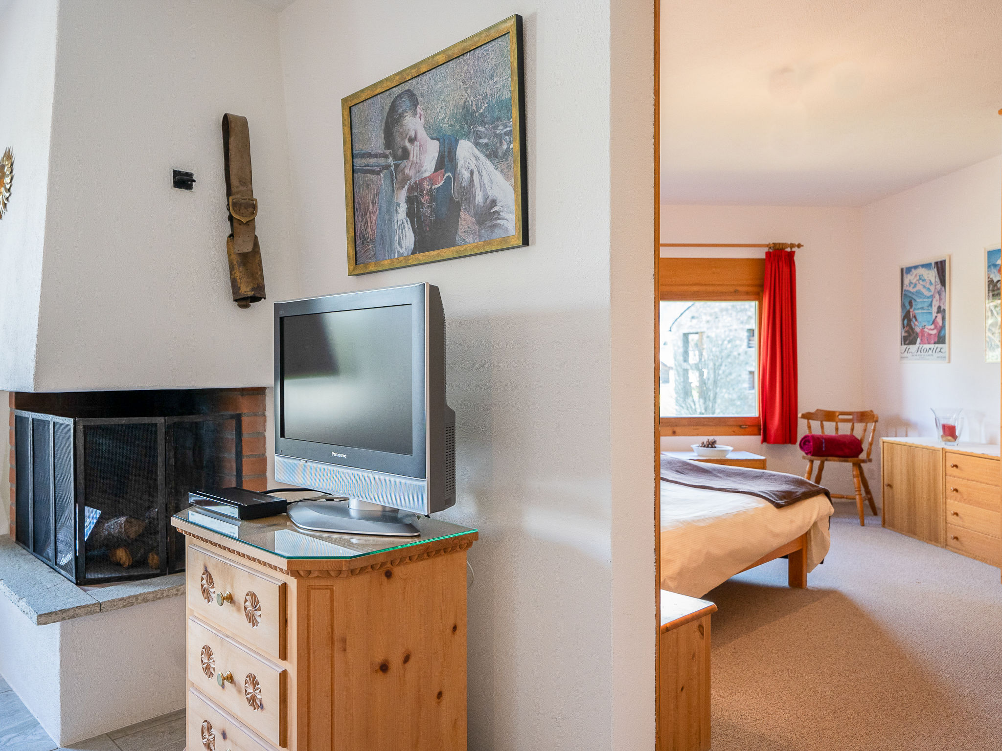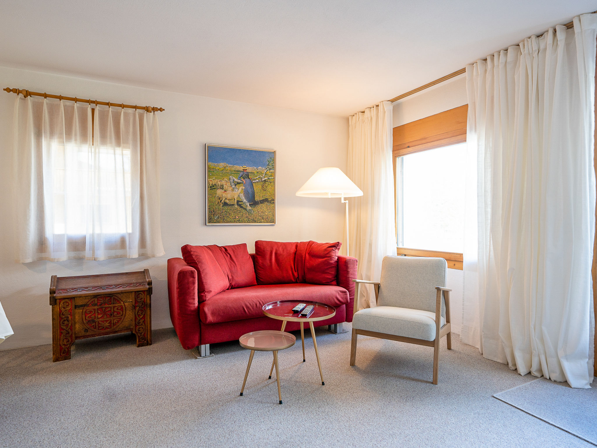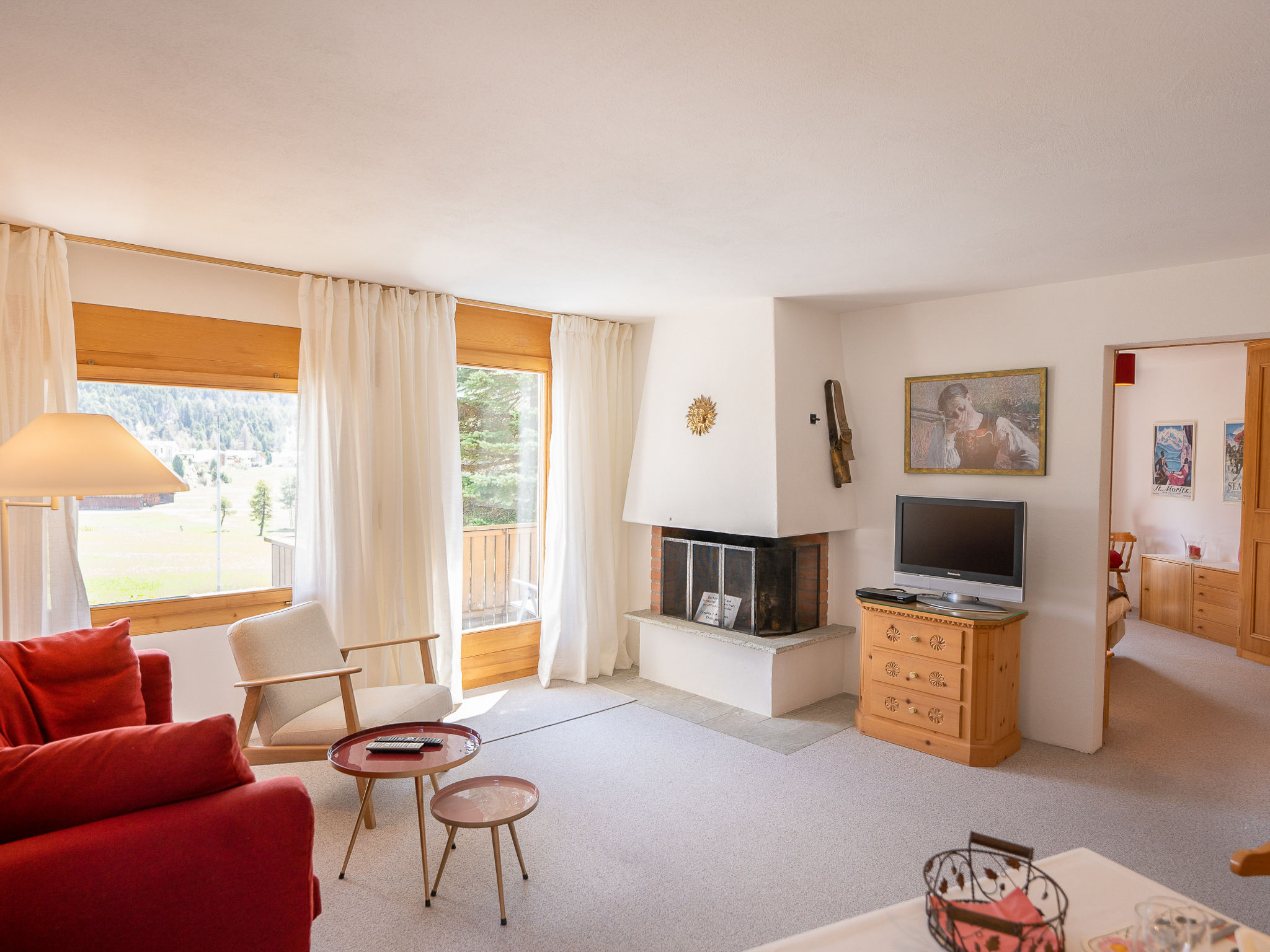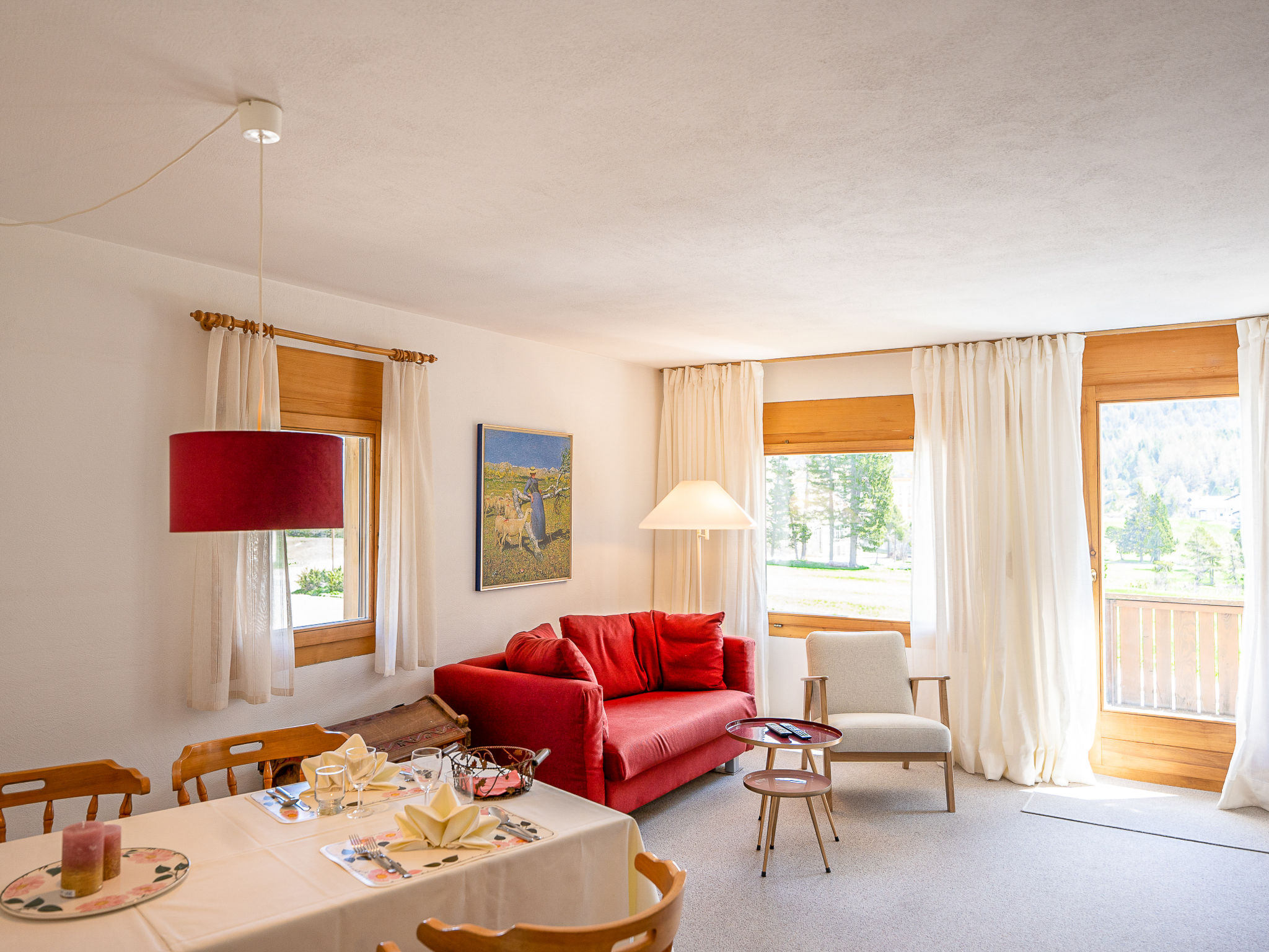 "Chesa Pra dSura 217", 2-room apartment 52 m2 on 1st floor. Bright, simple and cosy furnishings: living/dining room with open-hearth fireplace (only for decoration), TV (flat screen). Exit to the balcony. 1 double bedroom with 1 double bed (2 x 90 cm, length 200 cm). Small kitchen (3 hot plates, oven, dishwasher, toaster, kettle, electric coffee machine, fondue Set (cheese)). Bath/WC. Carpet. Balcony furniture. Beautiful view of the countryside and the resort. Facilities: hair dryer. Internet (WiFi, free). Garage space n 217 (1 car), height 200 cm, width 210 cm. Please note: non-smokers only.